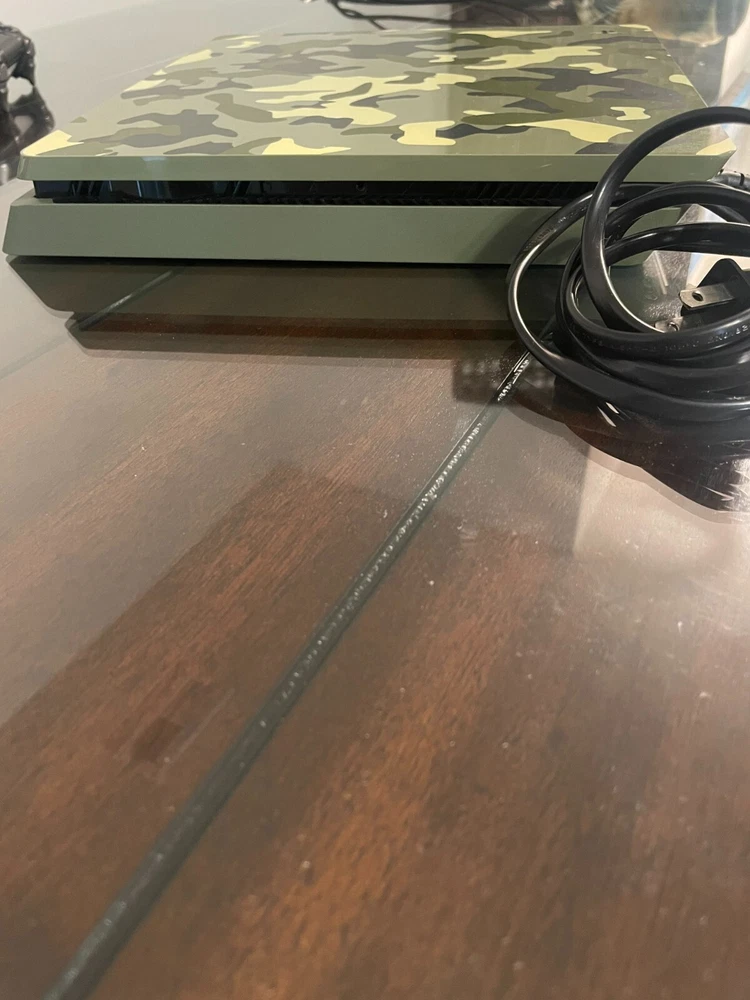 Super Great Buy for the holidays! Army Fatigue colored console with three controllers and 10 PS4 games. Games include: Madden 23, 22, 21, 20, Grand Theft Auto 5, Assassins Creed 4, Skyrim, Mortal Kombat XL, W2K20, and Drive Club. Game console works. Scratches on top surface of console, small crack at ps4 right side port, and back panel slightly loose on back side of console.