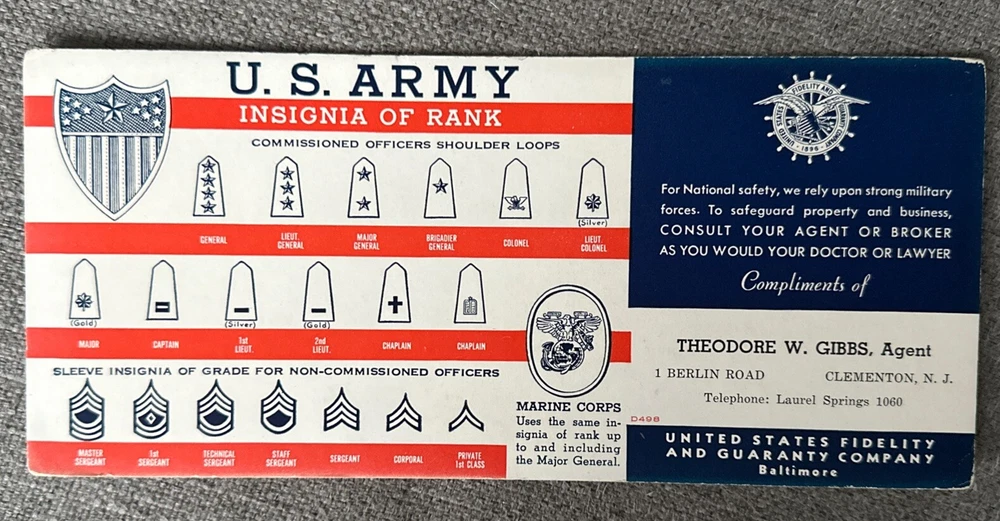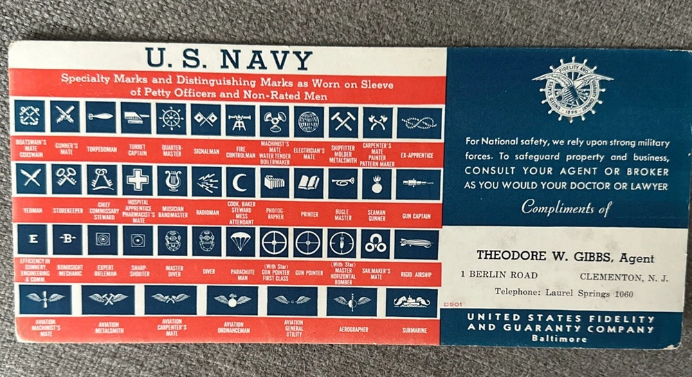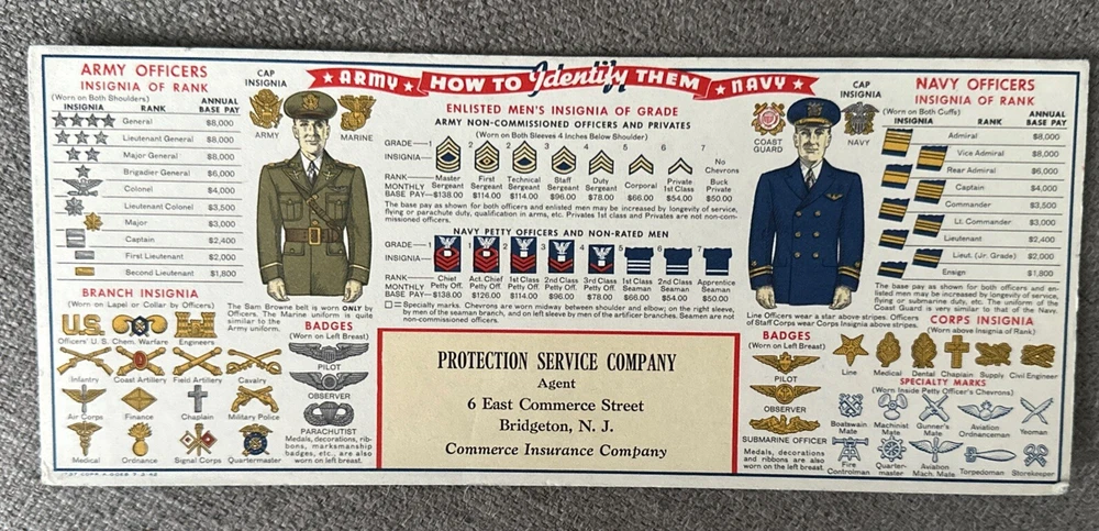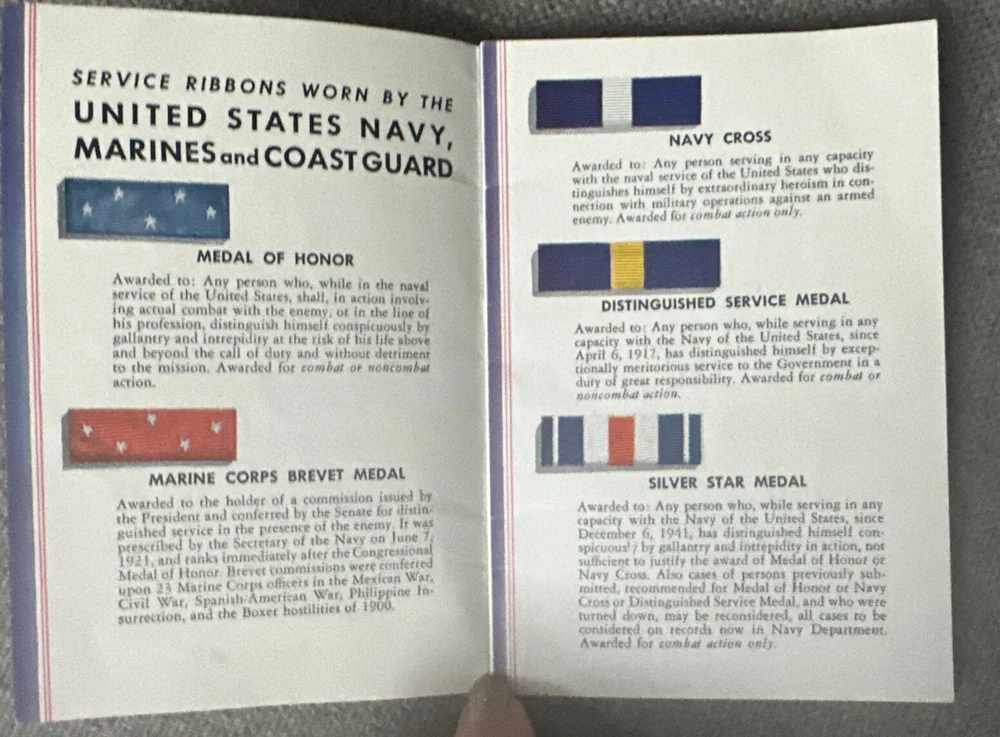 U. S. Army Insignia of Rank - cardboard card 4”x9” U.S. Navy Specialty Marks and Distinguishing Marks as Worn on Sleeve of Petty Officers and Non-Rated Men - cardboard card 4”x9” Army Navy How to Identify Them - cardboard card 4”x9” Service Ribbon Guide - Navy Marine Corp Coast Guard - booklet 3 3/4” x 5 1/2” by Shell