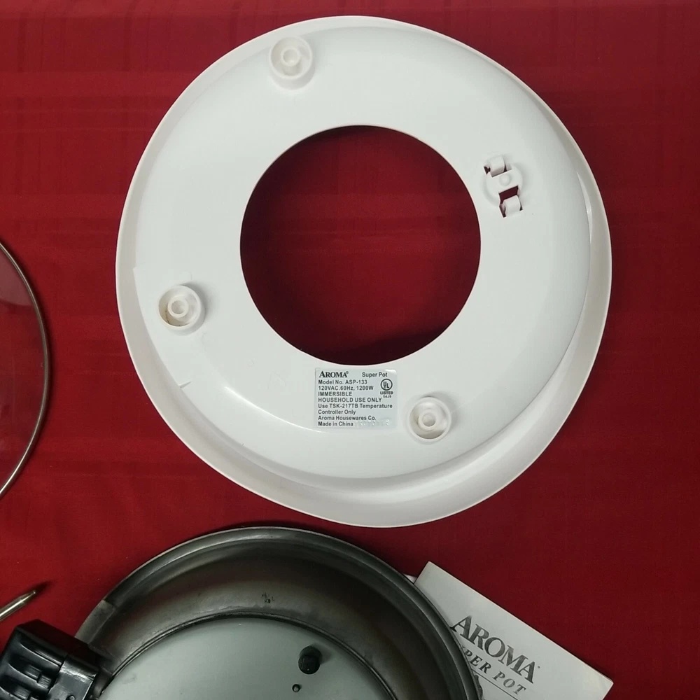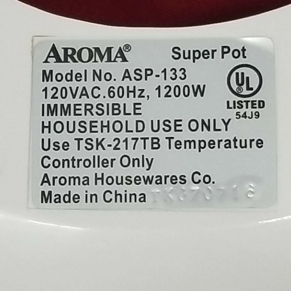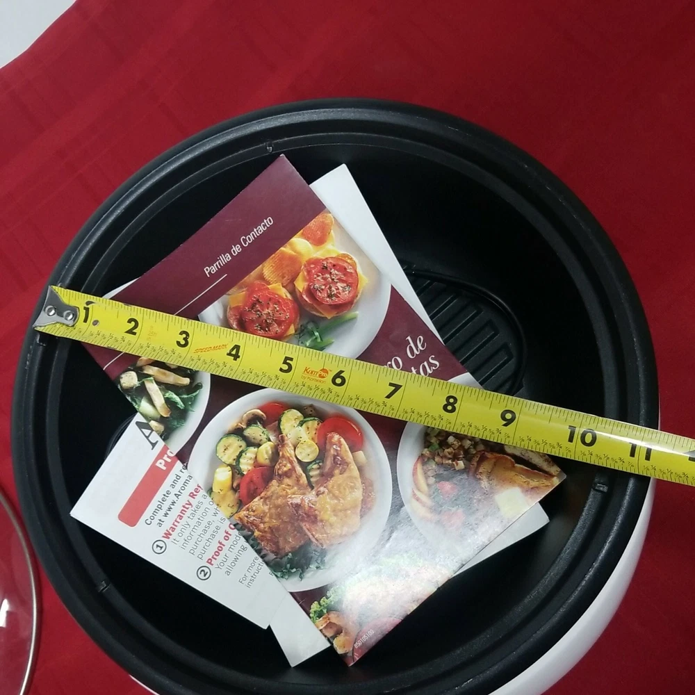 Aroma Super Pot w/ Grill Plate ASP-133 Housewares 3 Quart 10" 3-in-1 Recipe Book. It's a grill. It's a slow cooker. It's a food steamer. It's the Grillet! The Aroma Grillet 3-in-1 Indoor Grill is the hero of home cooking. Sizzling steaks. One-pot wonders. Healthy steamed meals. Prepare all this and more with the turn of a knob. Aroma takes the "cook" out of home cooking - turning kitchen time into your time! Tested: water boiled in a few minutes. Nice little appliance, looks good. Weight is 5 lb. 9.2 oz. without packaging. 12.5" x 7.5" SJ.31222.24.9