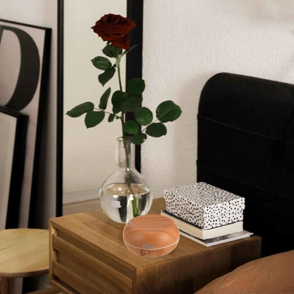 Modern Woodgrain Design: The elegant shallow footprint is beautifully brought to life with RGB lighting, creating a serene and calming atmosphere in any room. The compact design fits perfectly on any tabletop and can be easily moved from room to room. Remote Control: The diffuser comes with a convenient remote control that allows you to easily adjust the mist intensity, set a timer, and turn the lights on and off. The remote has a range of up to 32 feet, making it easy to control the diffuser from across the room. Essential Oil Compatibility: The diffuser is compatible with all types of essential oils, allowing you to customize your aromatherapy experience. Simply add a few drops of your favorite oil to the water and enjoy the therapeutic benefits. Mist Control: The diffuser has three mist modes to choose from: low, medium, and high. You can also adjust the mist intensity to suit your preferences. The mist output is whisper-quiet, making it ideal for use in bedrooms or offices. Timer Settings: The diffuser has a timer setting that can be set for 1, 2, 3, or 4 hours. It will automatically shut off once the selected time is up, ensuring that your home remains safe and secure.