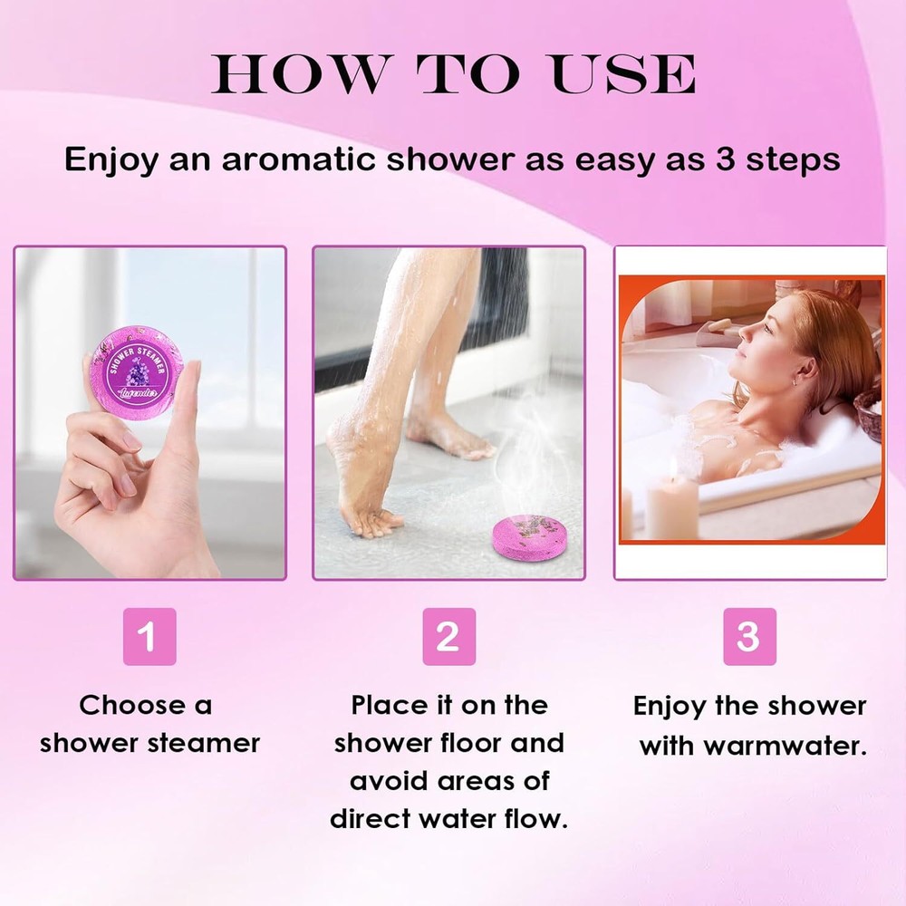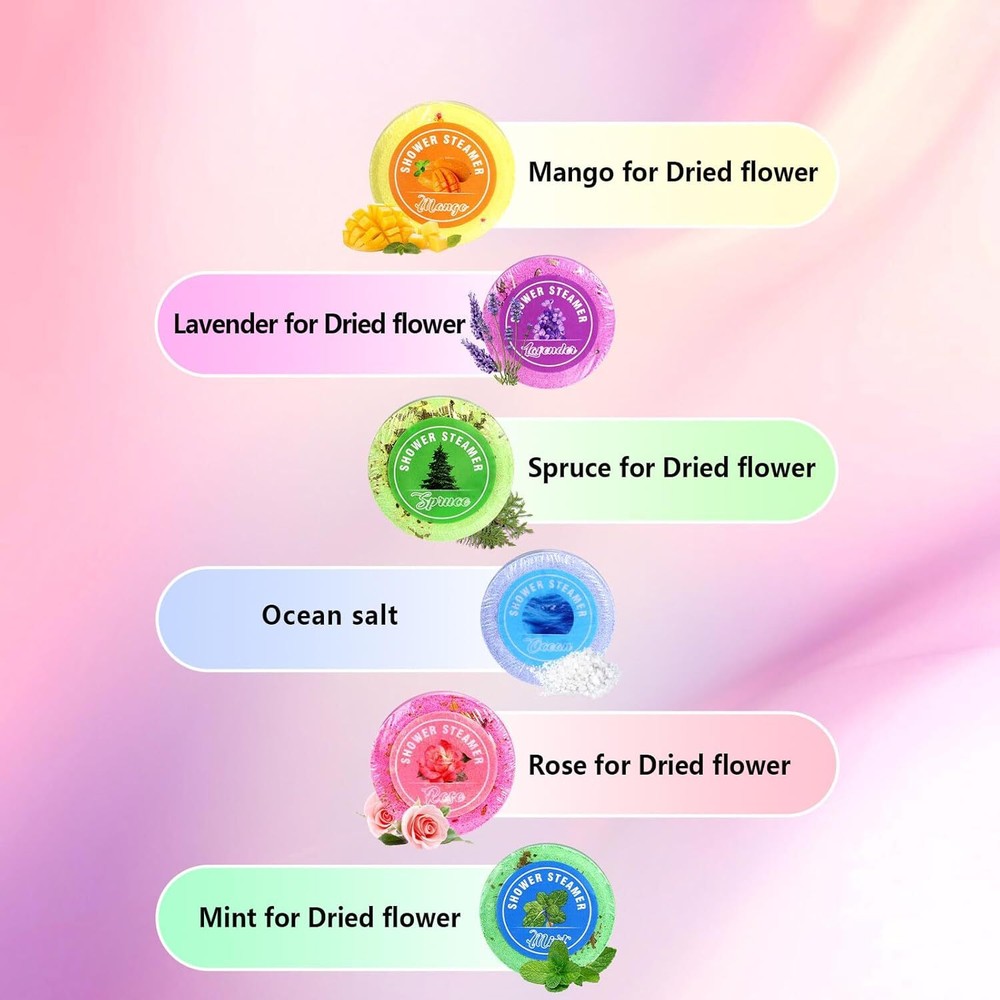 Brand: Unbranded Recommended Uses For Product: Relaxation, Aromatherapy Age Range (Description): Adult, Teen gtin13: Does not apply Type: Shower Steamer Product Benefits: Skin Care, Relaxing, Home Spa, Aromatherapy UPC: Does not apply Scent: Lavender,Menthol,Peppermint, Spruce,Rose,Mango,Sea salt