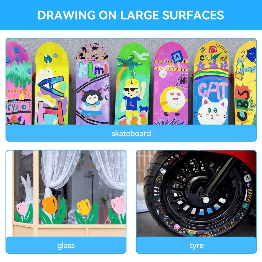 Arrtx 12 Colors Jumbo Markers | Acrylic Paint Markers for Adults | 10mm Broad Tips Acrylic Paint Pens for Stone, Glass, Easter Egg, Wood and Fabric Painting | No Toxic, No Odor 【12 VIBRANT COLORS】ARRTX Acrylic Paint Markers set comes with 12 fluorescent colors, which has rich colors and high saturation, allowing for bold, vibrant, long-lasting, and lightfast painting effects. Suitable for professional artists, graffiti enthusiasts, crafters, designers. 【DURABLE JUMBO TIP】Our Jumbo Paint Markers have 10mm-wide tip nibs, making the painting process easy to control and more efficient with good layering. Gliding effortlessly on smooth surfaces like paper and painted metal, flow smooth with great coverage. Ideal for larger illustrations, sign making and calligraphy. 【HIGH QUALITY INK】Our tagging markers are made of high-quality water-based ink, which are non-toxic and safe. There graffiti markers have a thick texture that can create full coverage on different surfaces. Once dry, the paint is waterproof, sun-proof, and fade-proof, which is a great choice for indoor or outdoor art projects. 【EASY TO USE】 To ensure the best control of the ink flow, our poster markers are built with a unique valve-action structure. Shaking the marker before use and press the nib up and down for several times until it fill with ink. Please cover the cap after use and store it horizontally when not in use. 【WIDE APPLICATION】These colored thick markers can be used on paper, stickers, stone, ceramic, wood, glass, plastic, and other smooth surfaces that add color to creations and decorations. And also make a perfect gift for family, neighbors, or friends on birthdays, parties, anniversaries, Halloween, Thanksgiving, Christmas, or New Year's.