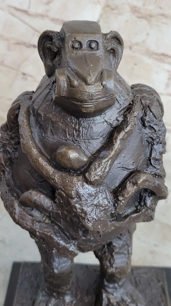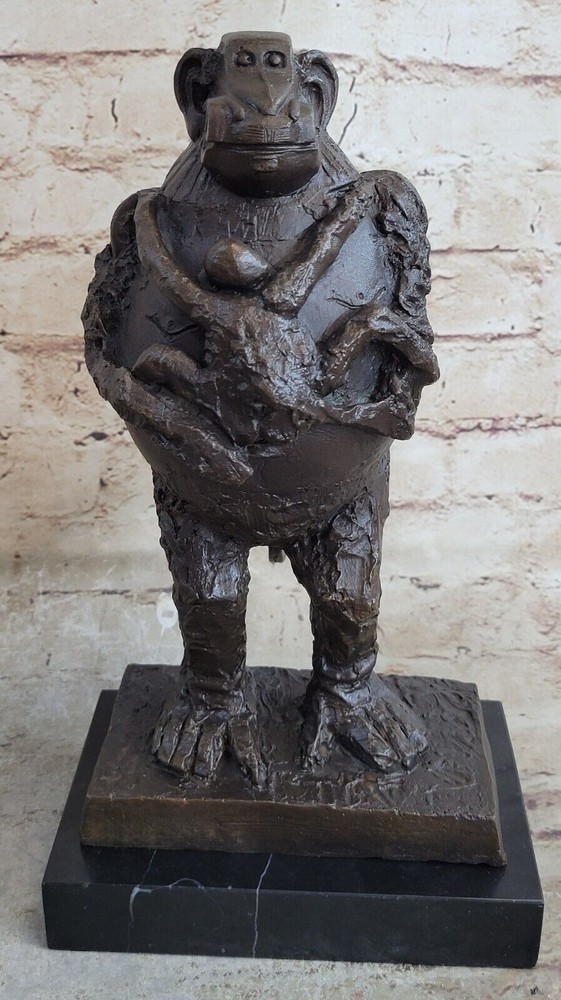 Condition : This sculpture is in perfect condition. Bronze Dimensions with Marble Base: Height 12" X Width 6.5" Marble Dimensions:6.5" X 4" Height without base:11" Weight:9 LBS Inventory:28XN25655282 Pablo Picasso's Assemblage Technique Pablo Picasso was always innovative in his approach to art, regardless of the medium in which he was working. As a sculptor, Picasso pioneered the technique of assemblage, constructing works partly or entirely of "found" objects, both natural and man-made. This revolutionary method allowed him to transcend traditional sculpting techniques and explore new artistic horizons by repurposing everyday items into extraordinary creations. Baboon and Young: A Playful Image of Motherhood In Baboon and Young, Picasso used toy automobiles, a storage jar, and a car spring to create a playful image of motherhood. The two metal cars, undersides together, form the baboon's head; the round earthenware pot, with its high handles, makes up her torso and shoulders; and the curving steel spring forms her backbone and long tail. This inventive use of found objects imbues the sculpture with a sense of whimsy and ingenuity, showcasing Picasso's ability to transform mundane items into a cohesive and imaginative artwork. Craftsmanship and Material Integration The rest of the baboon's body and the figure of her child were modeled from clay, and the whole piece was cast in bronze. This combination of materials and techniques demonstrates Picasso's versatility and craftsmanship. By integrating found objects with traditional sculpting materials, he created a dynamic and multifaceted piece that highlights his creative genius and innovative spirit. Signed Abstract Baboon and Young Brown Patina Bronze Sculpture Marble Statue Art Video will open in a new window Using the eBay App? Paste link into a browser window: [isdntekvideo]
