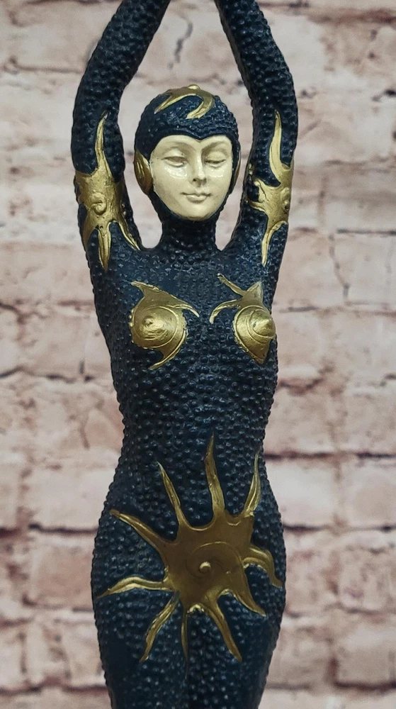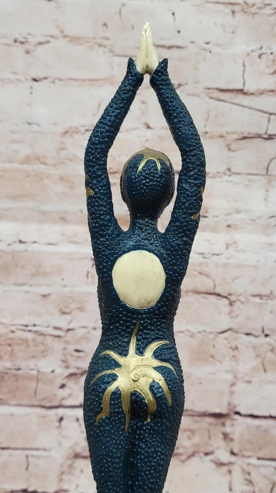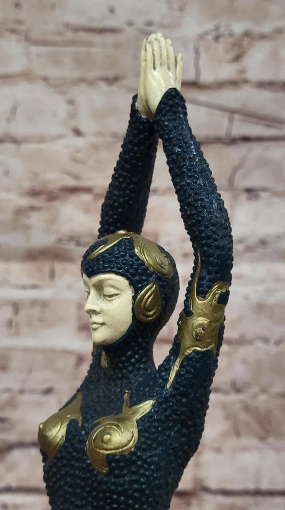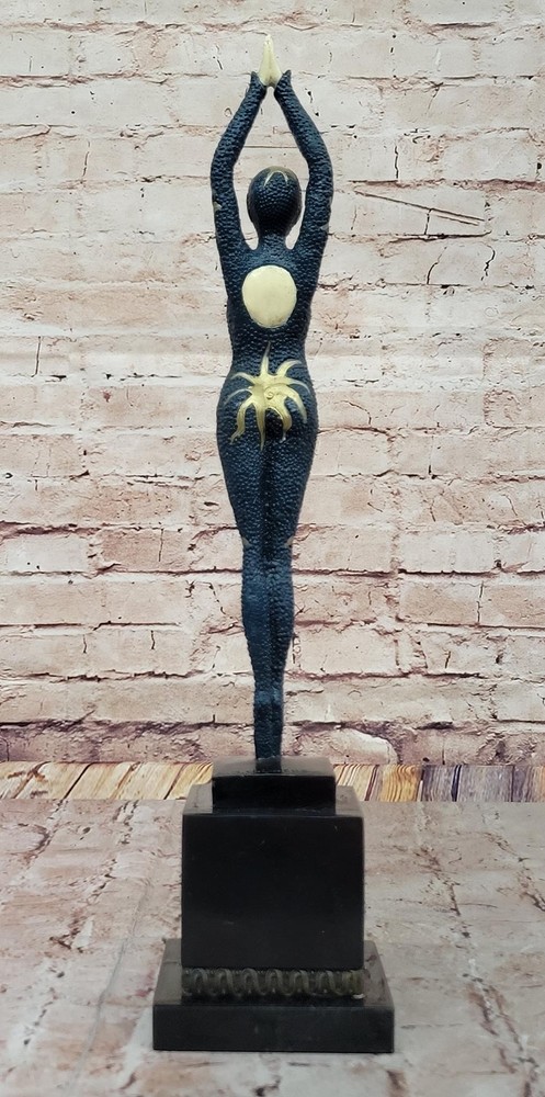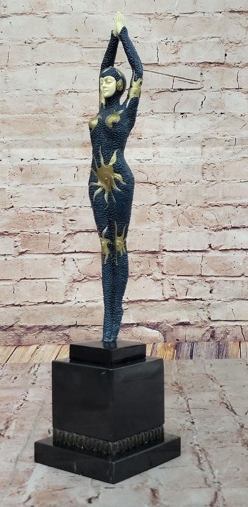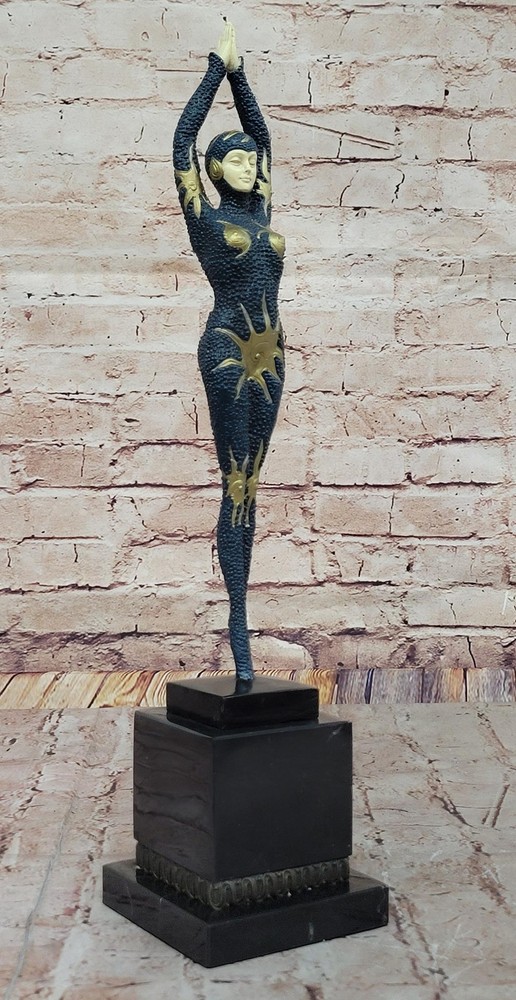 Condition : This sculpture is in perfect condition. Bronze Dimensions with Marble Base: Height 18.5" X Width 4" Marble Dimensions:4" X 4.5" Height without base:14.5" Weight:8 LBS Inventory:67EP184MC7776 This stunning bronze sculpture captures the elegance and poise of a female Egyptian dancer, delicately balanced on tiptoe in a graceful pose. Her intricate outfit, adorned with starfish decorations, adds a touch of exotic charm and enhances the fluidity of her movement. Every detail of her posture and attire reflects the timeless allure of Egyptian artistry, blending seamlessly with the refined aesthetics of the Art Deco era. Inspired by the renowned works of the famous Romanian sculptor Demetre Haralamb Chiparus (1886–1947), this piece pays homage to his mastery in creating exquisite dancer sculptures. Chiparus was celebrated for his ability to infuse movement and emotion into bronze, and this sculpture beautifully echoes his signature style. Crafted from high-quality bronze and meticulously painted in soft pastel colors, the figure exudes lifelike charm and sophistication. Mounted on a square tiered marble base with bronze embellishments, the sculpture is both a visual and tactile delight. The combination of luxurious materials and expert craftsmanship makes this artwork a striking addition to any collection, bringing the glamour and elegance of the Art Deco period into any space. Art Deco Style Cold Painted Bronze Dancer Sculpture after Chiparus Statue Video will open in a new window Using the eBay App? Paste link into a browser window: [isdntekvideo]