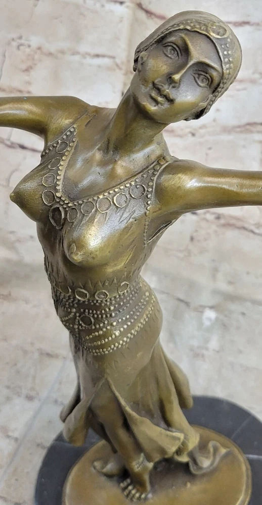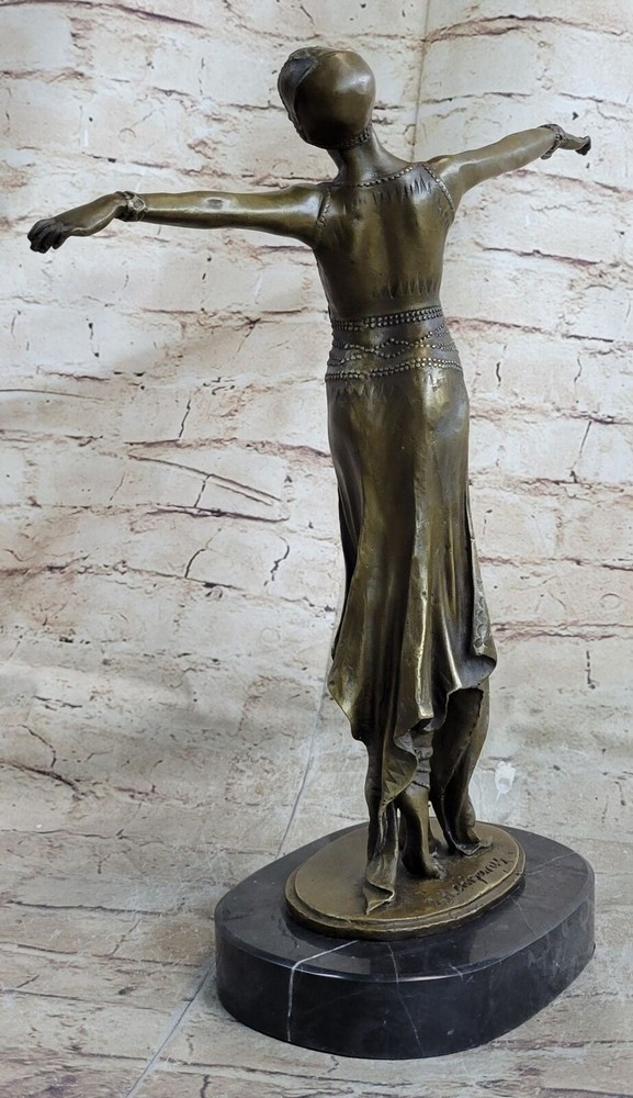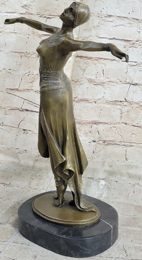Condition : This sculpture is in perfect condition. Bronze Dimensions with Marble Base: Height 15" x Width 12" Marble Dimensions: Diameter 7" Height without base:14" Weight:11 LBS Inventory:45Y2274754 Marvel at the captivating beauty of the "Admirable Dancer," a stunning bronze sculpture that immortalizes the grace and artistry of a dancer in a mesmerizing pose. This exquisite artwork captures the essence of the dancer's performance as she balances gracefully on her toes, extending her arms in a second position with a graceful tilt of her head. Dressed in a Russian dance costume that accentuates her figure, the dancer becomes a vision of artistic movement frozen in time. The intricate details of the costume and the poised stance showcase the artist's dedication to capturing the beauty and fluidity of dance. Crafted with precision, the sculpture is a testament to the skillful use of the lost wax method, a traditional technique that allows for intricate detailing and ensures the authenticity of the artwork. Resting on a sleek black marble base, the sculpture not only adds a touch of elegance but also enhances the visual impact of the artwork. The piece is signed by D.H. Chiparus, a renowned artist known for his exceptional sculptures that often depict dancers and figures in dynamic poses. Ideal for art enthusiasts and those who appreciate the expressive beauty of dance, the "Admirable Dancer" brings a sense of movement and sophistication to any space. Bronze Sculpture D.H. Chiparus Dancer Standing On Her Toes Bronze Sculpture Deco \ Video will open in a new window Using the eBay App? Paste link into a browser window: [isdntekvideo]