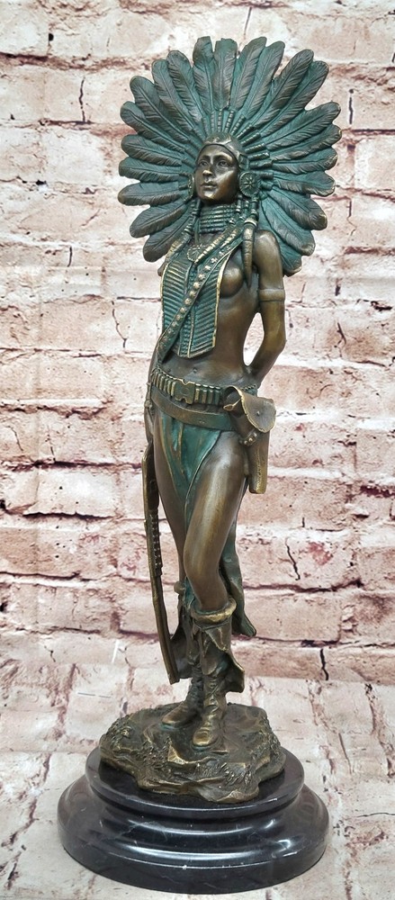 Condition : This sculpture is in perfect condition. Bronze Dimensions with Marble Base: Height 18" X Width 6" Marble Dimensions: Diameter 6" Height without base:16" Weight:13 LBS Inventory:26B0596662 Presenting an awe-inspiring depiction, behold the fierce Native American woman, poised for the hunt. With unwavering courage and silent confidence, she commands attention atop a grassy hill. Her regal presence is adorned by a magnificent eagle-feather and beaded war bonnet, its feathers standing tall in full display. A beaded choker adorns her neck while a gun belt, complete with a holstered pistol and bullet-lined waist, rests upon her hips. Her front and back are adorned with flowing cloth, revealing the length and curvature of her legs, while a beaded vest graces her chest, accentuating her slender frame. At her side, she holds a long rifle with her free hand gracefully tucked behind her, resting upon her rear. The intricate details of her thick, wavy mane cascade from the back of her war bonnet down her back. Completing her attire, she wears calf-high boots, tightly tied with a rope in the front. This remarkable sculpture captures her spirit, as she stands proudly not behind, but beside men. With a green patina gracing her accessories and a brown patina adorning her skin and boots, this 100% bronze sculpture is a true masterpiece. Meticulously crafted by hand using the renowned "Lost Wax Method," it embodies the utmost precision and detail. The sculpture is mounted on a round black marble base, providing stability and an elegant display. Each piece is personally signed by the esteemed artist, Milo. Don't miss the opportunity to own this extraordinary work of art that pays homage to the strength and beauty of the Native American culture. Native American Indian Female Warrior in Feathered Headdress Bronze Statue Sculpture by Milo EP-059 Video will open in a new window Using the eBay App? Paste link into a browser window: [isdntekvideo] A fierce Native American women prepares to hunt. She stands tall with bravery, silent confidence and stunning beauty on a grassy hill top. Her full eagle-feather and beaded war bonnet covers her head. The feathers round her head, fully extended upright. A beaded choker covers most of her neck. A gun belt is slung over her hips, with a pistol in the holster and extra bullets lining her waistline. Long cloth hangs between her thighs in the front and back, leaving the length and curve of her legs exposed. A beaded vest covers the front of her chest but leaves her sides and back bare, showing off her slender frame. She holds a long rifle to her side with her free hand tucked behind her, resting on her rear. Her thick, wavy mane hangs loosely from the back of her war bonnet, down her back. She A fierce Native American women prepares to hunt. She stands tall with bravery, silent confidence and stunning beauty on a grassy hill top. Her full eagle-feather and beaded war bonnet covers her head. The feathers round her head, fully extended upright. A beaded choker covers most of her neck. A gun belt is slung over her hips, with a pistol in the holster and extra bullets lining her waistline. Long cloth hangs between her thighs in the front and back, leaving the length and curve of her legs exposed. A beaded vest covers the front of her chest but leaves her sides and back bare, showing off her slender frame. She holds a long rifle to her side with her free hand tucked behind her, resting on her rear. Her thick, wavy mane hangs loosely from the back of her war bonnet, down her back. She