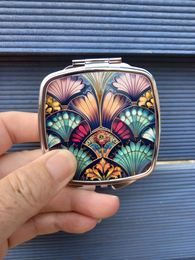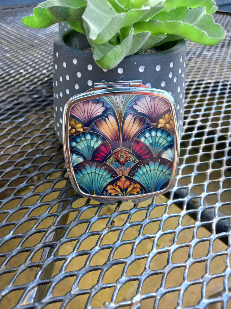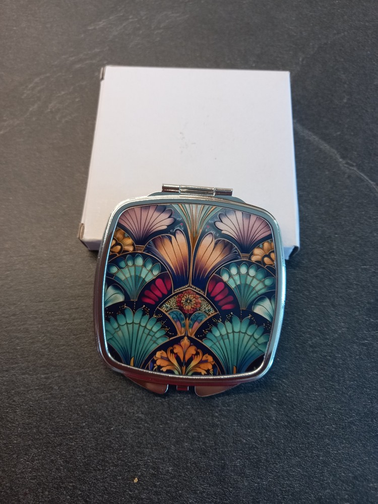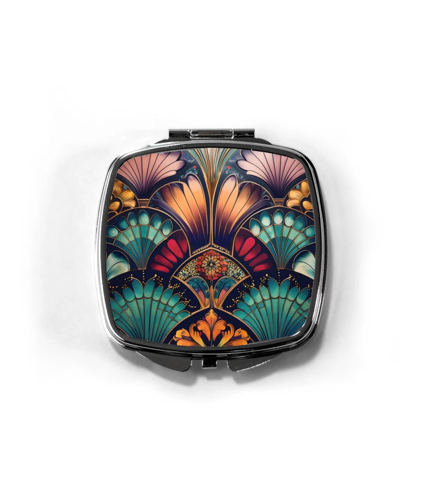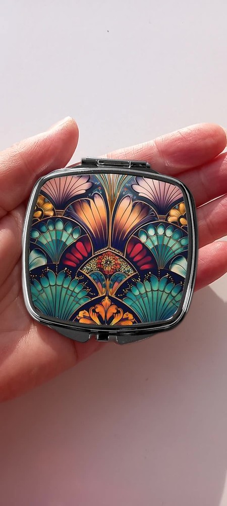 Discover the elegance of our vintage-inspired pocket mirror, featuring a striking red, teal, and gold Art Deco pattern. This lightweight compact is not just a mirror but a stylish accessory reminiscent of 1920s glamour. Ideal for gifting to mums, sisters, friends, aunts, or teachers, it's perfect for Christmas, birthdays, Mother's Day, anniversaries, or any special occasion. Key features of this Art Deco pocket mirror include: Dual standard mirrors with a snap enclosure Art Deco-inspired design on the front Compact size: 6.7 x 7.5cm Lightweight and easy to carry Eco-friendly packaging Shipped with a tracking number for your peace of mind About Art Deco: Art Deco emerged in the 1920s and 1930s, embodying a glamorous aesthetic in architecture and the decorative arts. Characterised by metallics, geometric shapes, and sleek lines, it remains an enduring symbol of the Roaring Twenties.