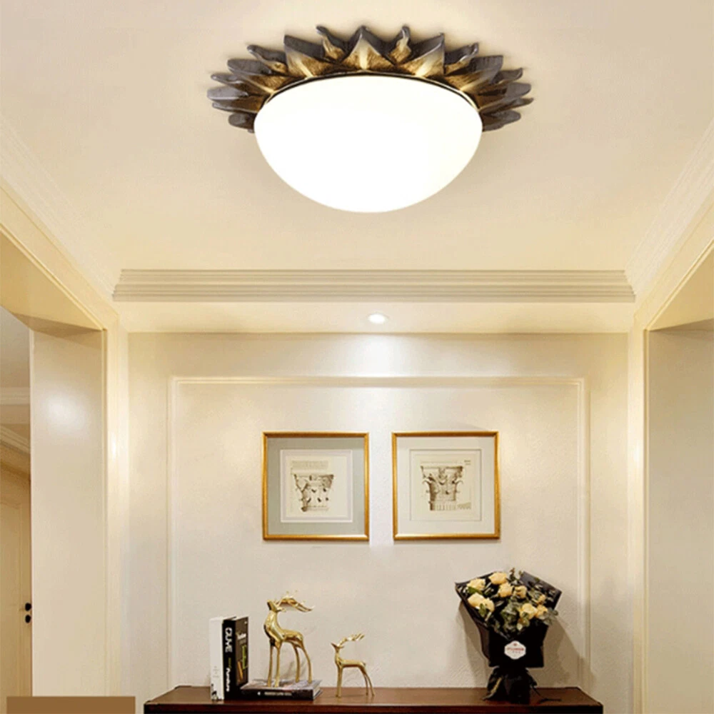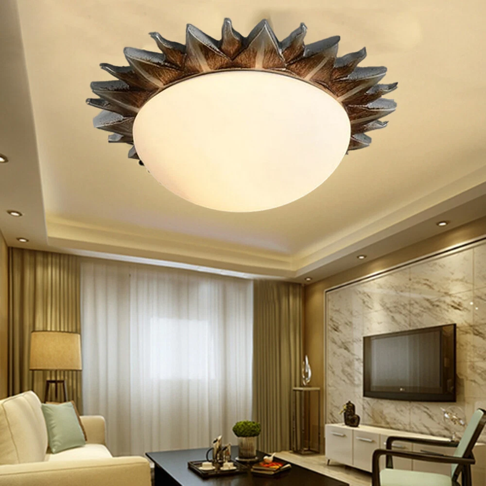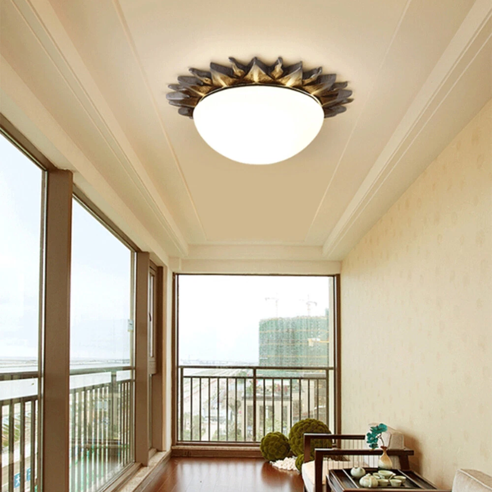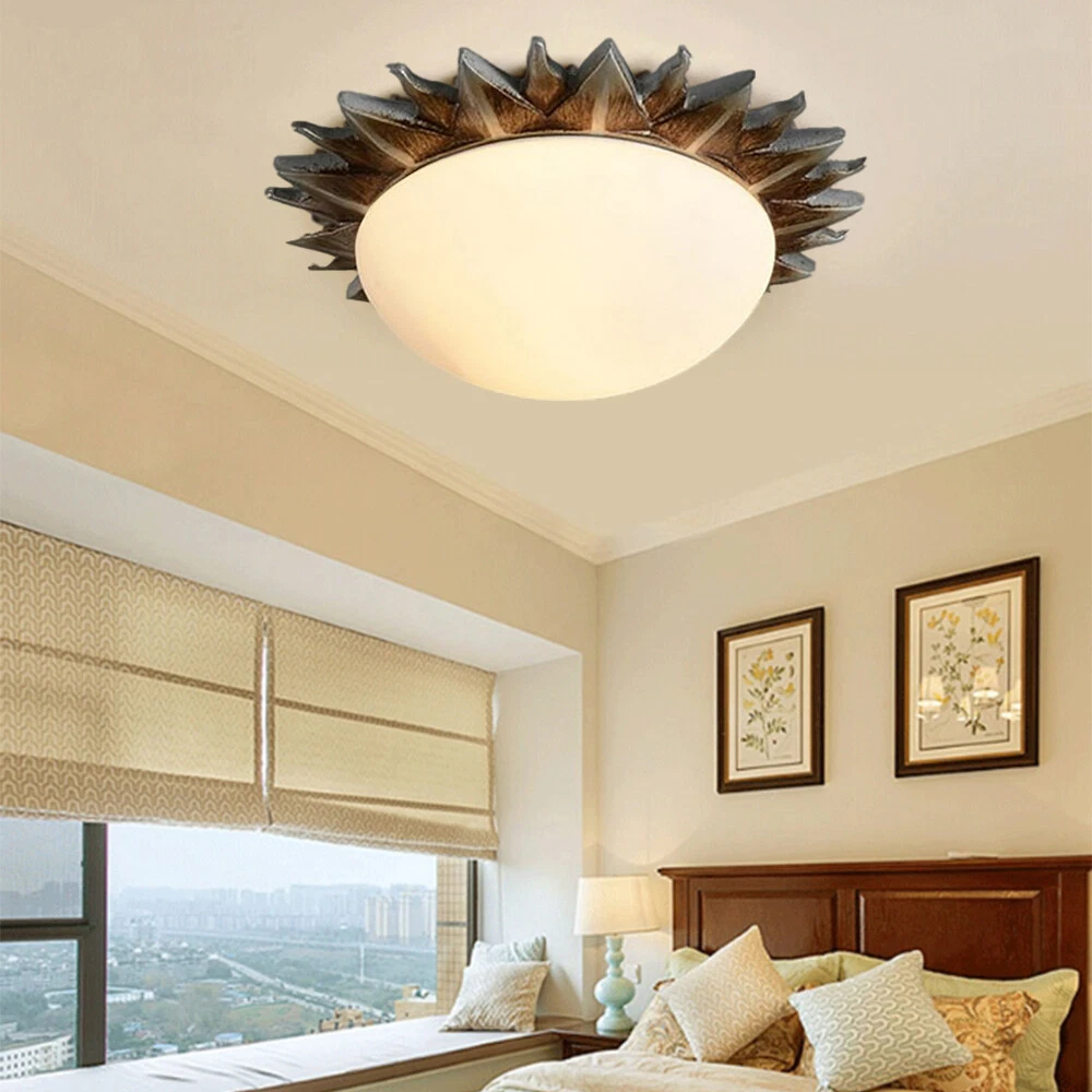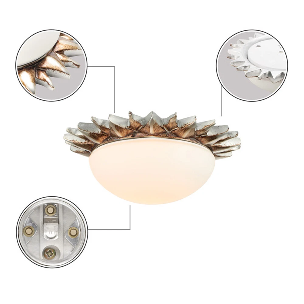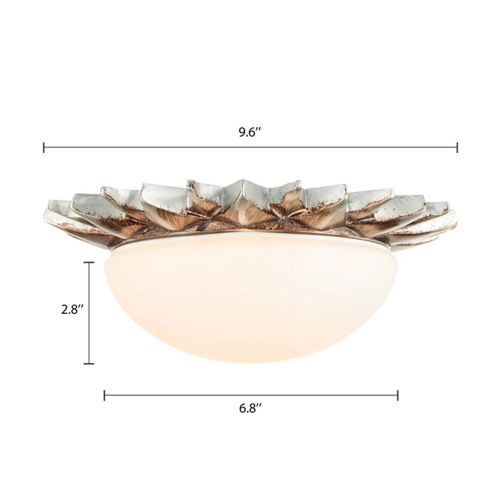 Fixture Width: 9" Fixture Height: 3" Bulb not included Resin Sun Shape Vintage Flush Mount Light White Glass Shade Ceiling Lamp Porch Light Information Category: Flush Mount Ceiling Lights Usage: Indoor Lighting,Foyer Pendant,Hallway Shade Shape: Bowl Dimensions Fixture Width: 9" Fixture Height: 3" Bulb Information Bulb Type: LED/Incandescent/Fluorescent Bulb Base: E26/E27 Number of Light: 1 Light Bulb Included Or Not: Bulb Not Included Wattage Per Bulb: Max 40W Material Shade Material: Glass Color Finish: Bronze Others Shade Color: White Glass Treatment: White Shipping Weight: 2KG Processing Time 7-10 Business Days (Exclude Customized Products) Payment Delivery details Contact us Return Policy Terms of sales Payment All major credit cards are accepted through secure payment processor eBay Payment Delivery details We will ship the item out in 1 business day after the payment is cleared. If you DON'T receive your item in 30 days. Please contact us immediately for further assistance. Thank you for your understanding. Note: Import duties ,taxes or any charge of your country are NOT included in the item price or shipping charge. Contact us If there is any question, please don't hesitate to contact us. Please send us the message. All message will be answered within 1 business day. If you don't receive our reply, please check the spam in your mail box. We greatly appreciate your POSITIVE feedback. Please DO NOT leave negative or neutral without asking for help. Please DO NOT leave negative or neutral feedback if you have not received item in 30 days, please contact us first,we will solve the issues. Return Policy 100 % money-back Guaranteed! We promise 30 Days Return of Ebay; All returning items should be original condition in the original package. We can Resend or Refund if there not satisfactory, or bad quality, a wrong item, missing, or Not arrived within 30 days. 40 days if customs is inspecting the package, or bad weather. Terms of sales ☆Please allow 1-2 cm differs due to manual measurement☆ Please note that due to limitations in photography and the inevitable differences in monitor settings,the colors shown in the photograph may not correspond 100% to those in the items themselves.