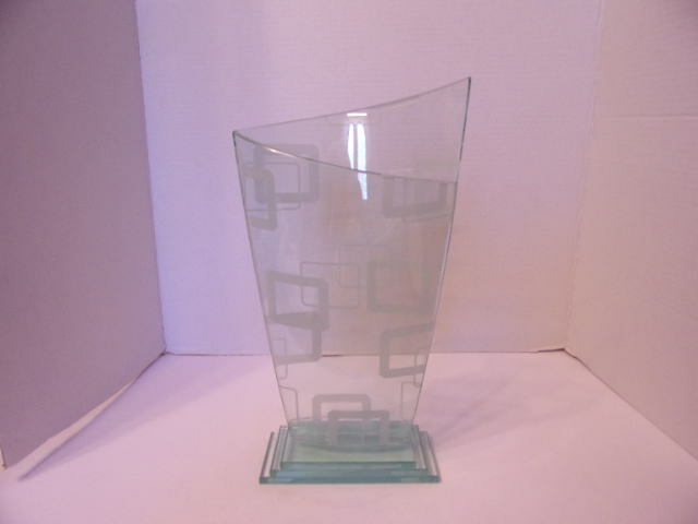 We are offering for auction this 14 1/2" clear Art Glass vase with frosted squares. It has a three- step base and measures 12" on the front and 14 1/2" on the back. It is in good condition with no chips, cracks or scratches. Please email with any questions. We will ship USPS Priority Mail within two days after payment is received. Thanks for looking. Doris and Ralph