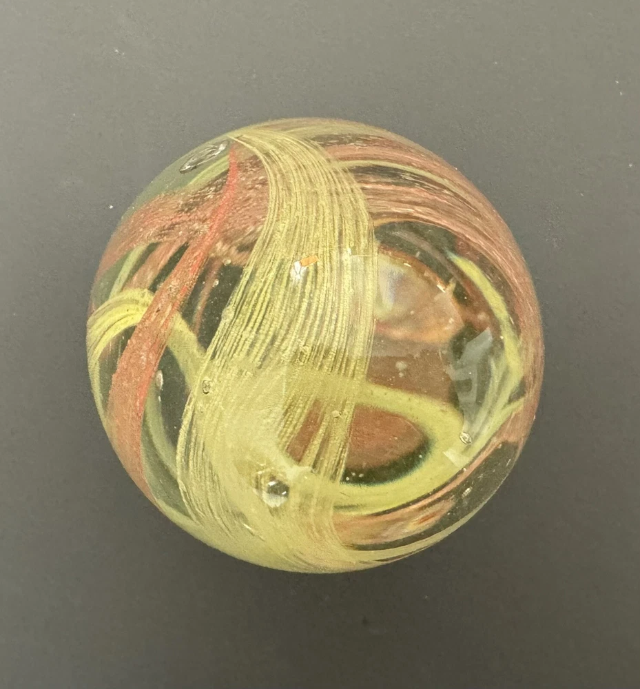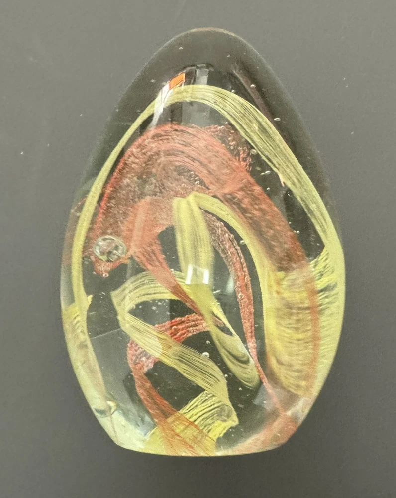 This unique art glass paperweight features an egg shape and a stunning abstract design in yellow and salmon colors The clear blown glass adds a touch of eclectic style to any collection This paperweight is perfect for anyone who appreciates decorative pottery and glassware Paperweight stands about 6" tall MINT Condition!!