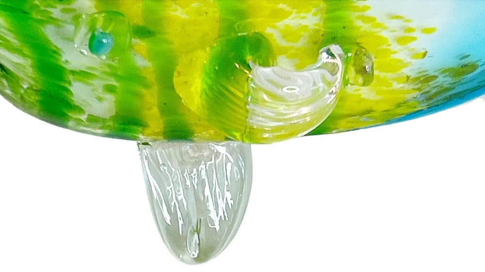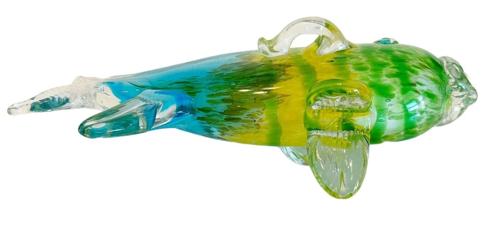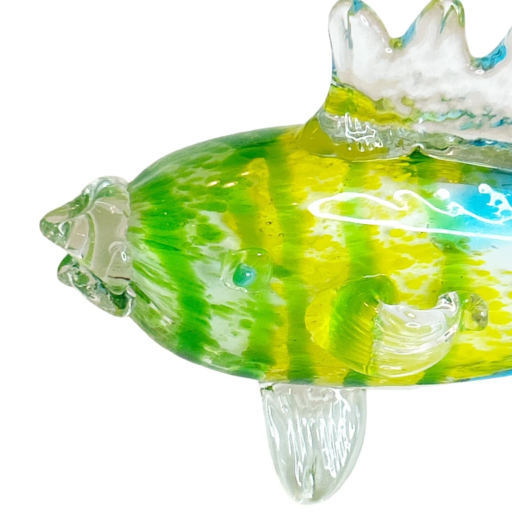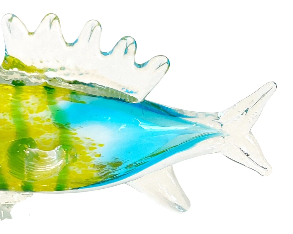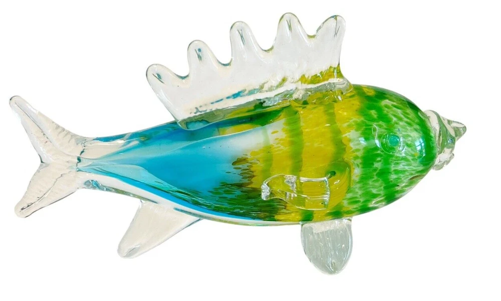 This stunning hand-blown glass sculpture features a vibrant tropical fish design in shades of blue, green, yellow, and clear. Crafted with high attention to detail, this 11-inch figurine has a 3D effect and a glossy finish that makes it a standout piece in any collection. The fish subject is perfect for those who love ocean and fish-themed decor. This original art glass piece is handmade and weighs 2lbs. It is a unique and authentic item that will add a touch of elegance to any space. Smoke free home Please visit my store at https://www.ebay.com/str/theuniqueredhead . Thank you for your consideration. Please message me if you have any questions. I do combined shipping on my items in the store.