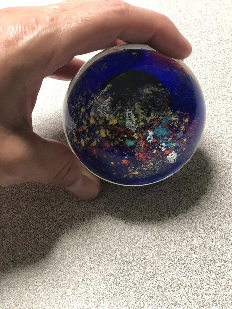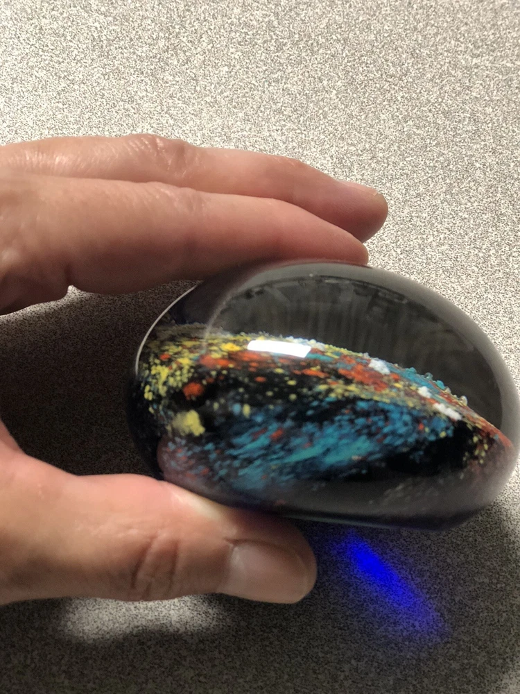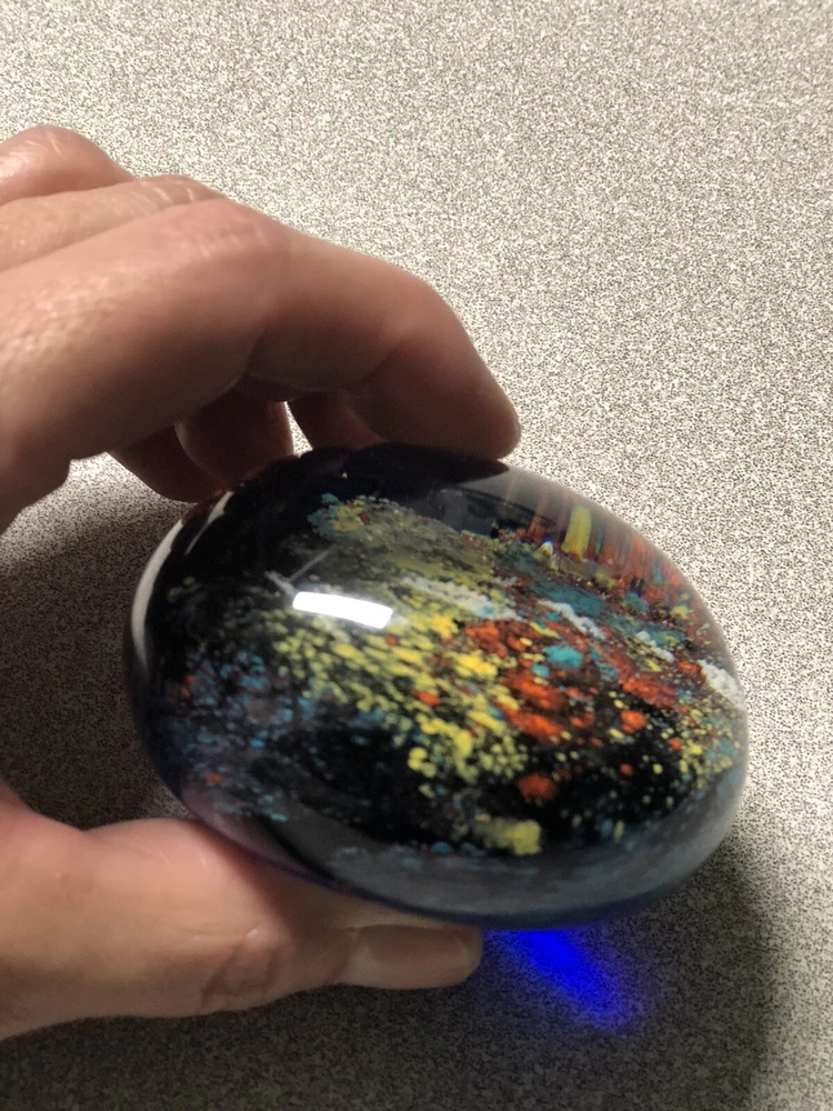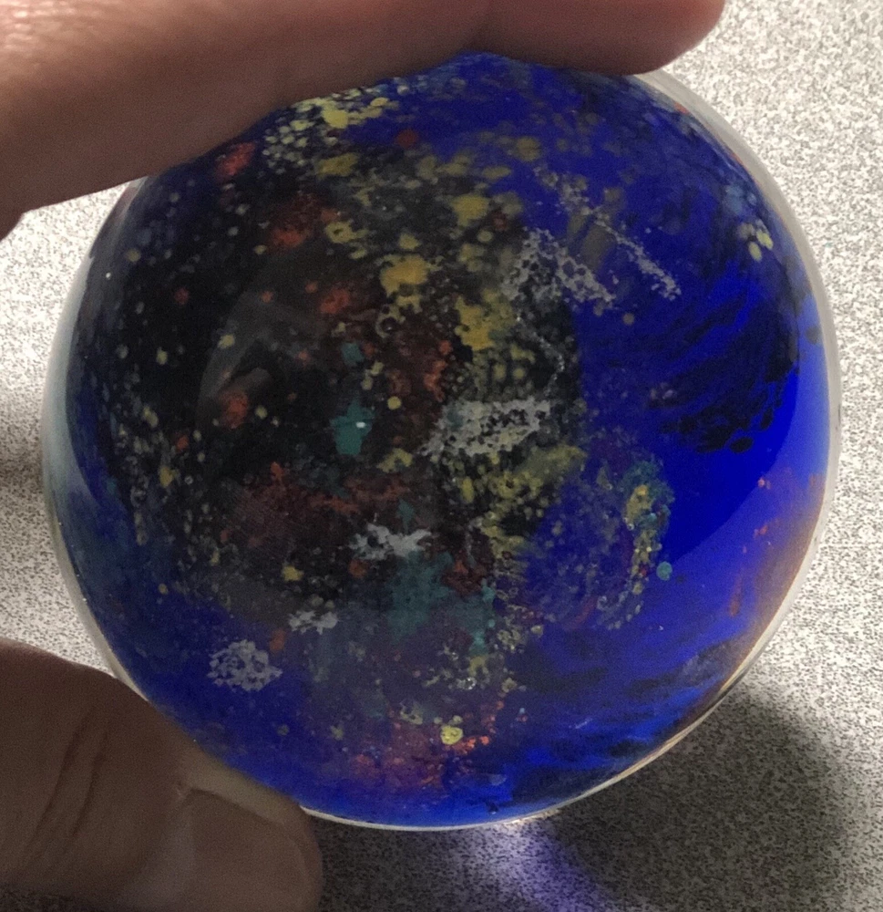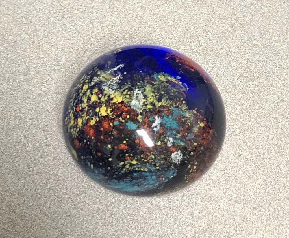 Art Glass Paperweight- Deep Cobalt Blue With Multi Colored Abstract Design. Condition is preowned free from chips or cracks.