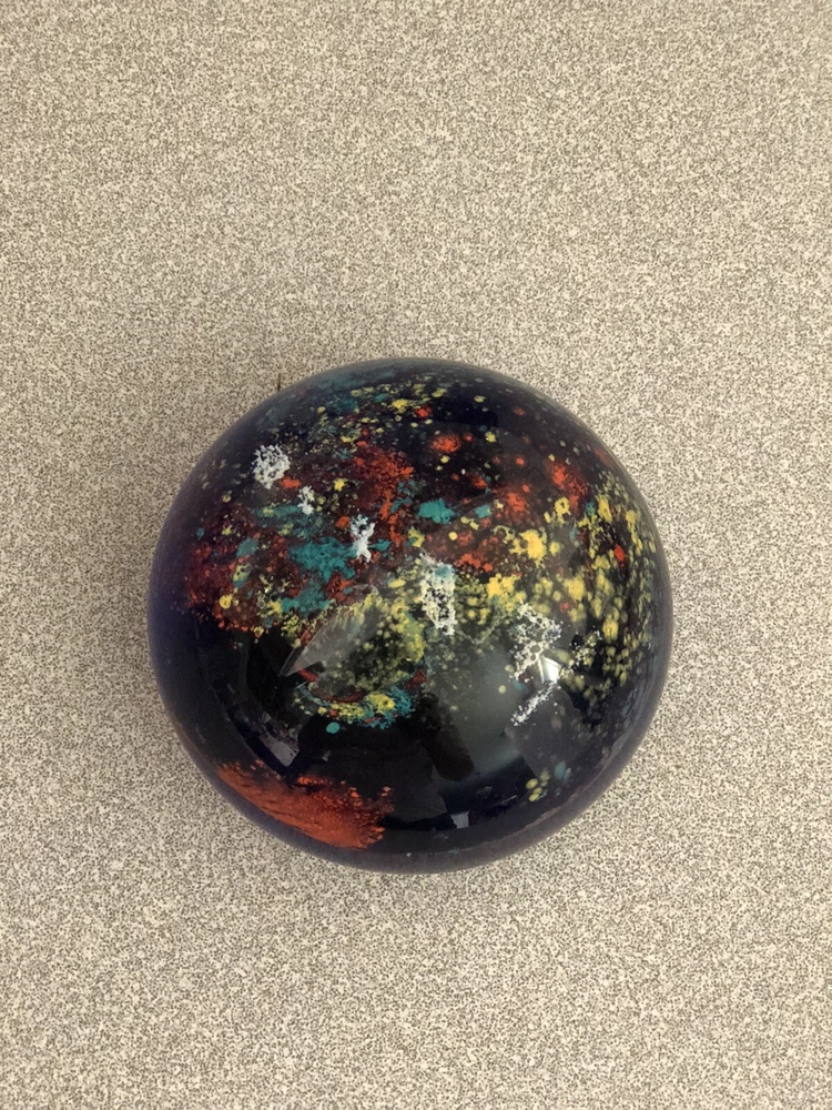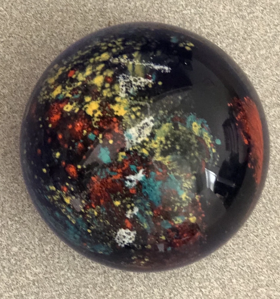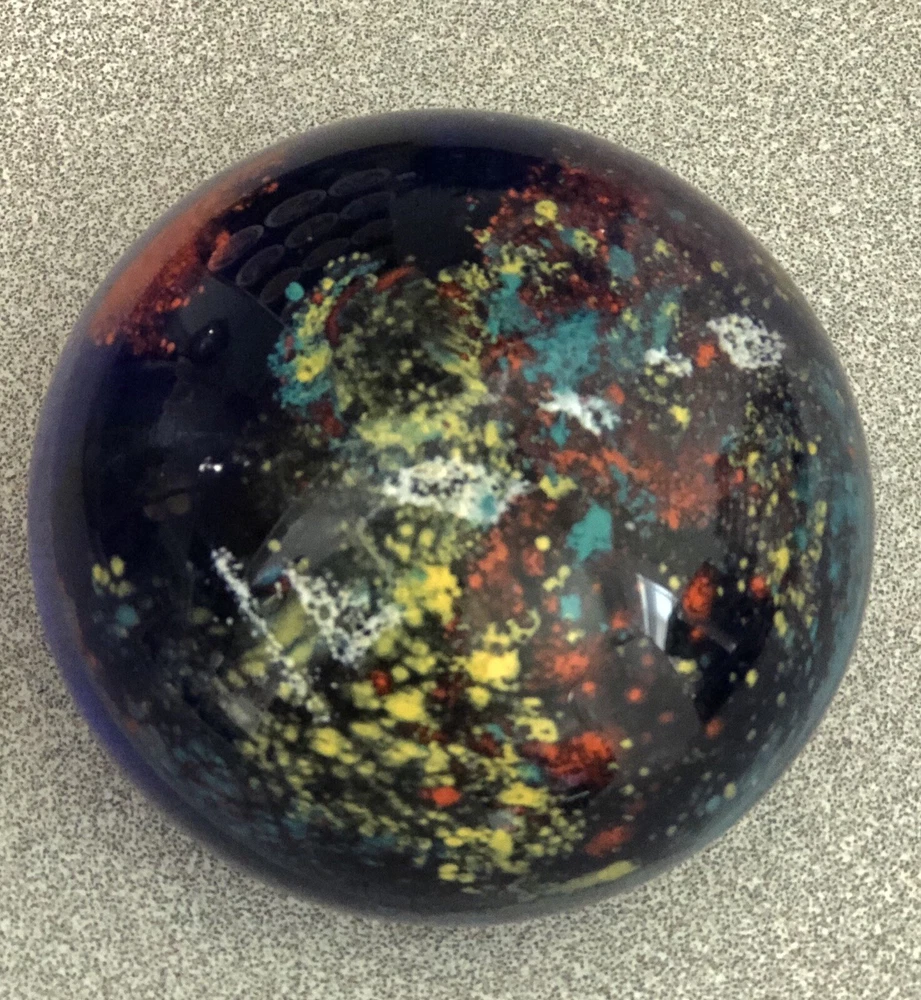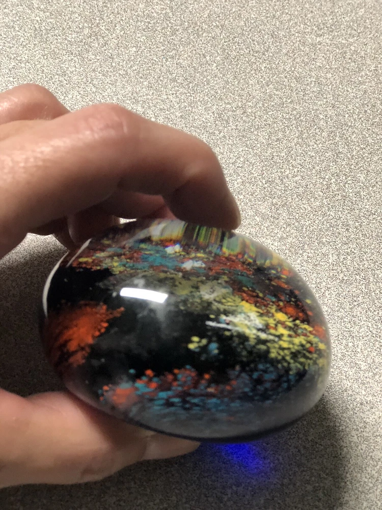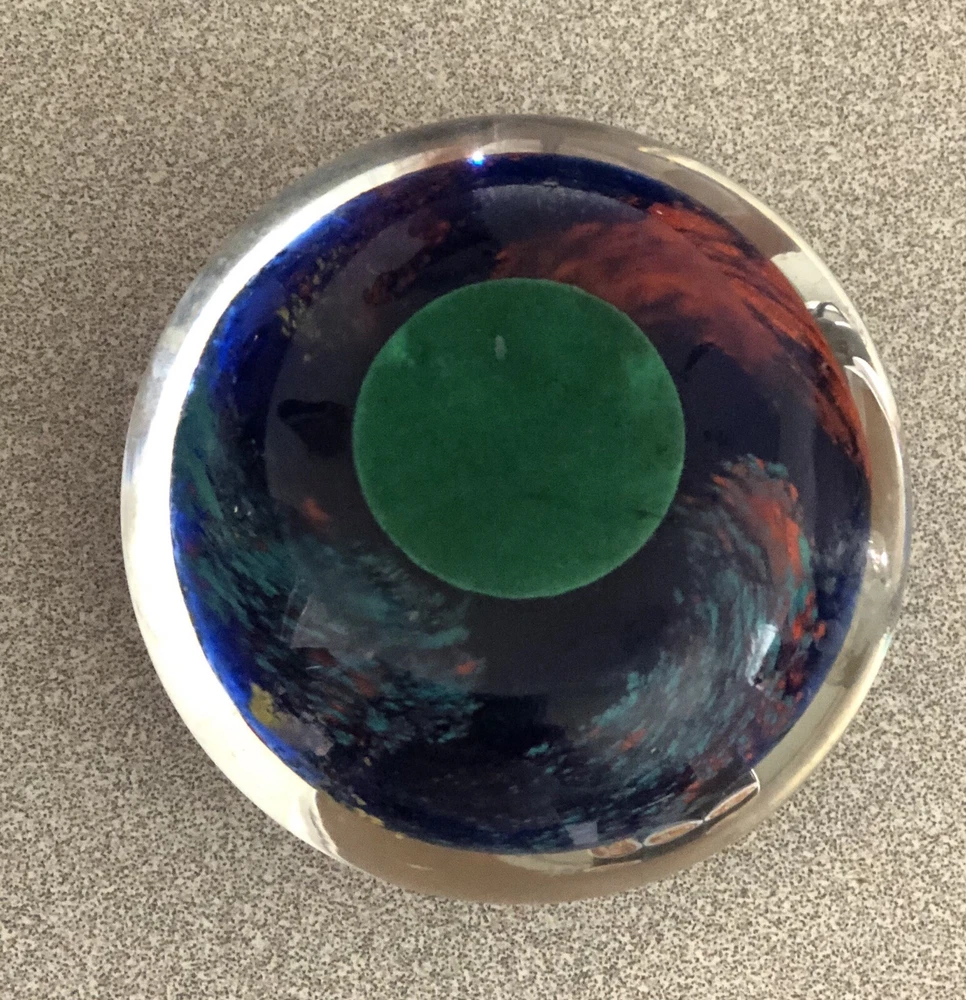Art Glass Paperweight- Deep Cobalt Blue With Multi Colored Abstract Design. Condition is preowned free from chips or cracks.