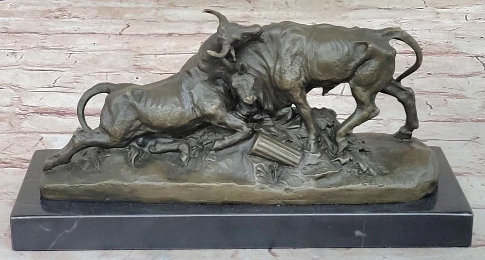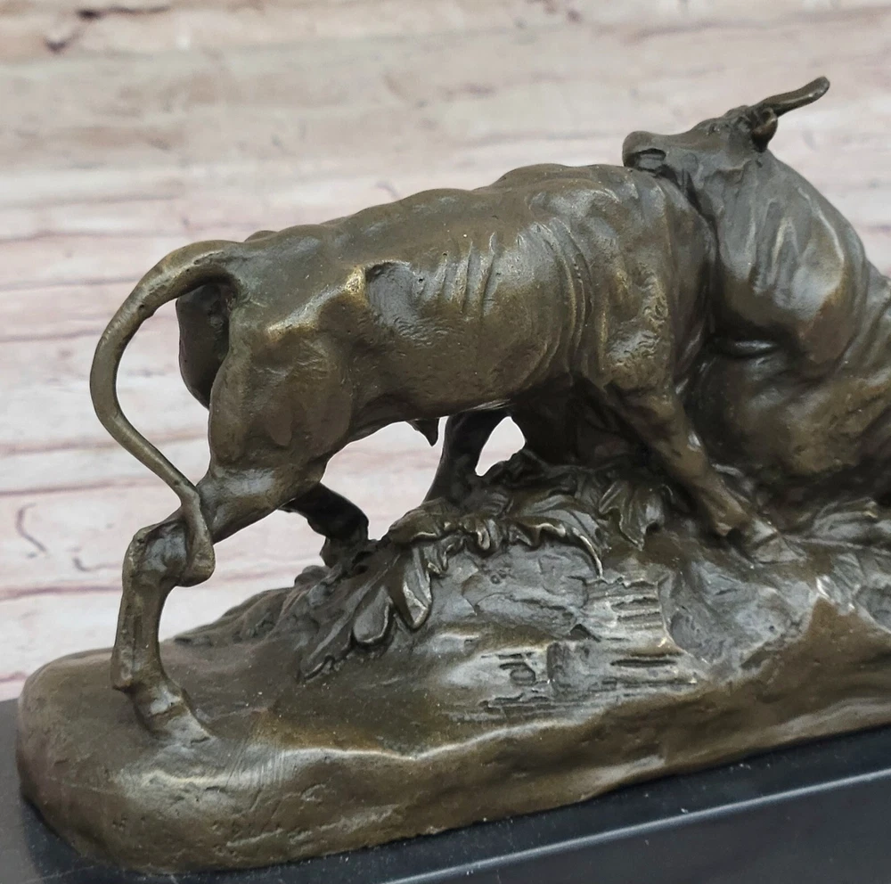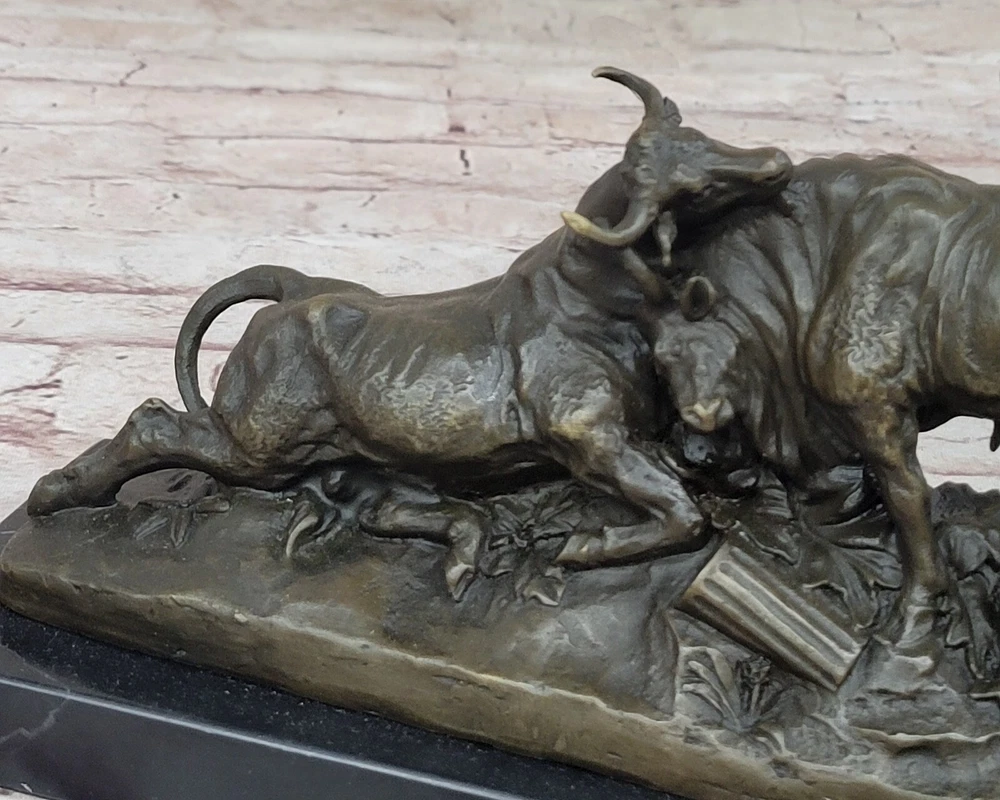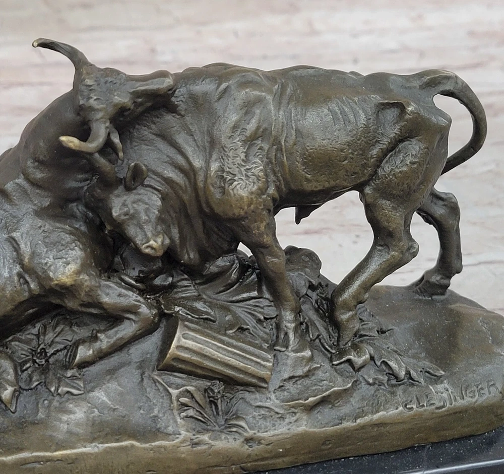 Condition: This sculpture is in perfect condition Bronze Dimensions with Marble Base: Height 5"" X Width 10"" Marble Dimensions:10"" X 3 1/2"" Height without base:4 1/2"" Weight:7 LBS Inventory:14K1503041 This exceptional bronze sculpture, signed by Jean-Baptiste Auguste Clesinger, captures the intense drama of a bullfight in a masterpiece titled ""Combat De Taureaux"" or the sparring bulls. The classic dual between these magnificent beasts is portrayed with remarkable detail and precision. At the base of the sculpture lie Roman ruins and columns, providing a historical backdrop as the bulls engage in their fierce battle. Clesinger's keen eye for detail is evident in every aspect of this artwork, ensuring that no part of the sculpture is left untouched.The composition of the sculpture vividly conveys the power and tension between the sparring bulls. The intricacies of their anatomy, from the rib cages to the backbones and hip bones, are rendered with meticulous care. The artist's commitment to capturing the essence of the scene is reflected in the lifelike depiction of the bulls breathing heavily as they challenge each other over the lush, leafy ruins. The level of detail in Clesinger's work contributes to the immersive and dynamic nature of the sculpture.Handcrafted and cast using the ""Lost Wax Method,"" this bronze sculpture is a testament to the artist's dedication to his craft. The dark brown patina enhances the richness of the sculpture, adding depth and texture to the overall composition. The fact that it is signed by Clesinger further authenticates its provenance and contributes to its value as a collectible work of art. This remarkable piece not only showcases the artistry of Clesinger but also captures the timeless allure and drama of a bullfight in an enduring form.
