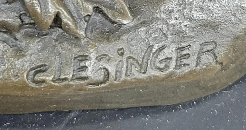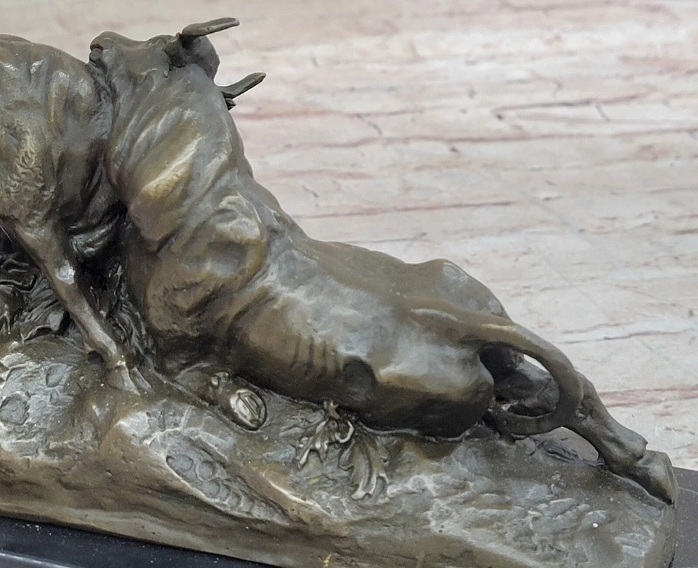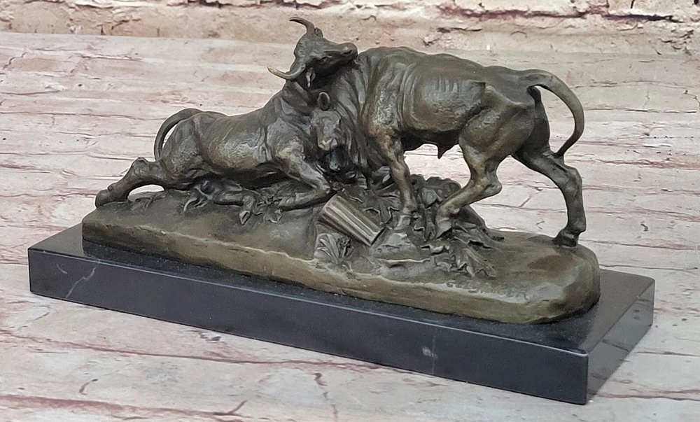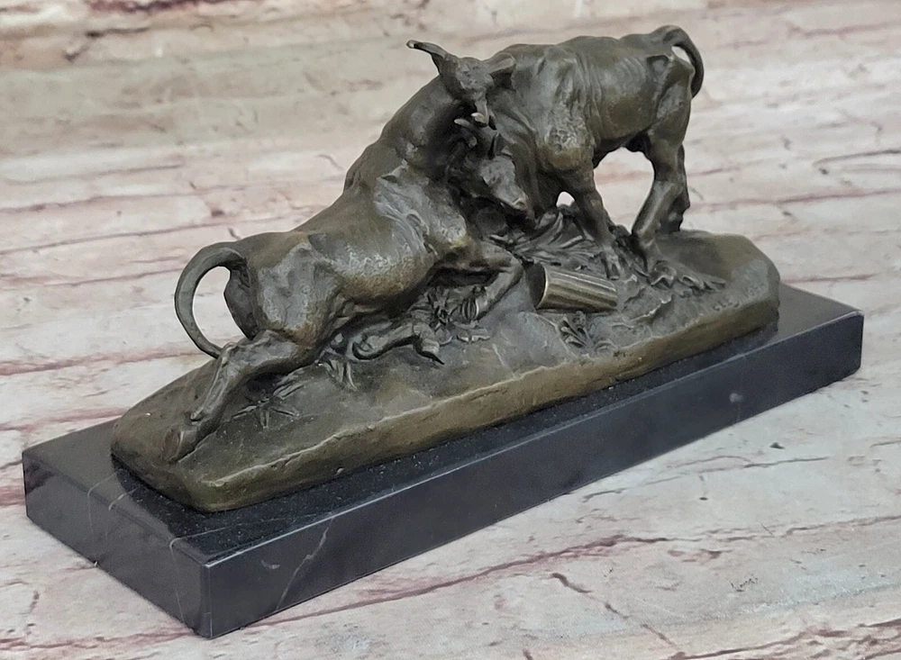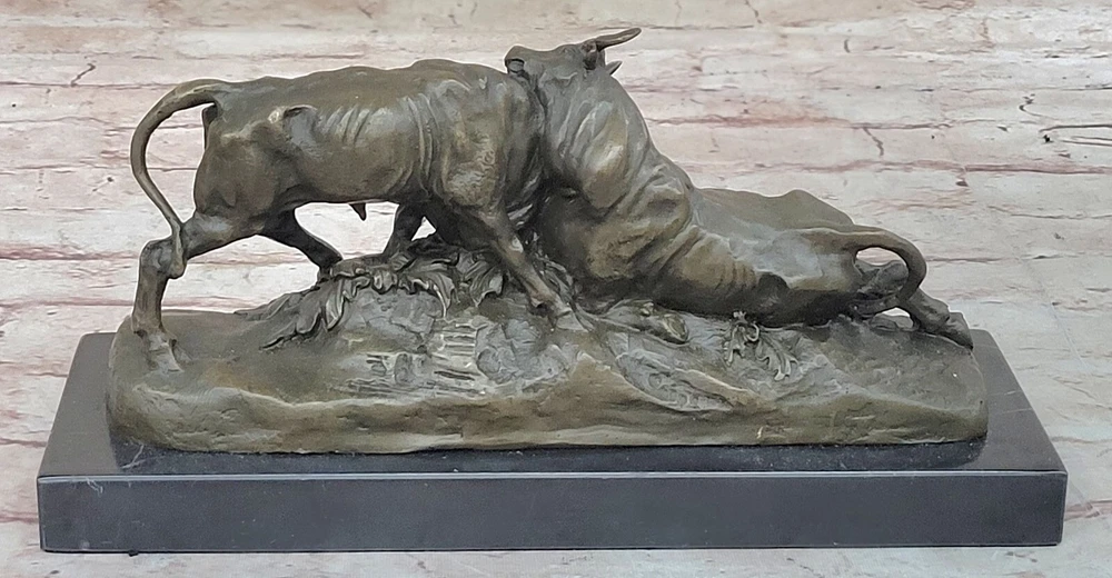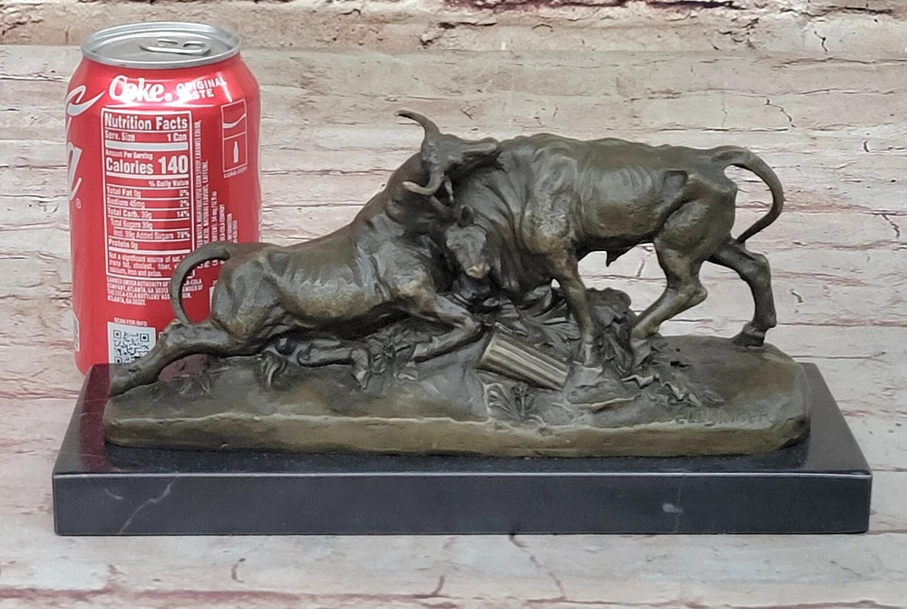 Condition: This sculpture is in perfect condition Bronze Dimensions with Marble Base: Height 5"" X Width 10"" Marble Dimensions:10"" X 3 1/2"" Height without base:4 1/2"" Weight:7 LBS Inventory:14K1503041 This exceptional bronze sculpture, signed by Jean-Baptiste Auguste Clesinger, captures the intense drama of a bullfight in a masterpiece titled ""Combat De Taureaux"" or the sparring bulls. The classic dual between these magnificent beasts is portrayed with remarkable detail and precision. At the base of the sculpture lie Roman ruins and columns, providing a historical backdrop as the bulls engage in their fierce battle. Clesinger's keen eye for detail is evident in every aspect of this artwork, ensuring that no part of the sculpture is left untouched.The composition of the sculpture vividly conveys the power and tension between the sparring bulls. The intricacies of their anatomy, from the rib cages to the backbones and hip bones, are rendered with meticulous care. The artist's commitment to capturing the essence of the scene is reflected in the lifelike depiction of the bulls breathing heavily as they challenge each other over the lush, leafy ruins. The level of detail in Clesinger's work contributes to the immersive and dynamic nature of the sculpture.Handcrafted and cast using the ""Lost Wax Method,"" this bronze sculpture is a testament to the artist's dedication to his craft. The dark brown patina enhances the richness of the sculpture, adding depth and texture to the overall composition. The fact that it is signed by Clesinger further authenticates its provenance and contributes to its value as a collectible work of art. This remarkable piece not only showcases the artistry of Clesinger but also captures the timeless allure and drama of a bullfight in an enduring form.