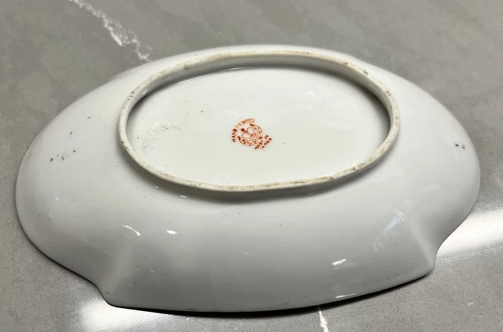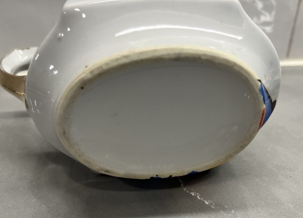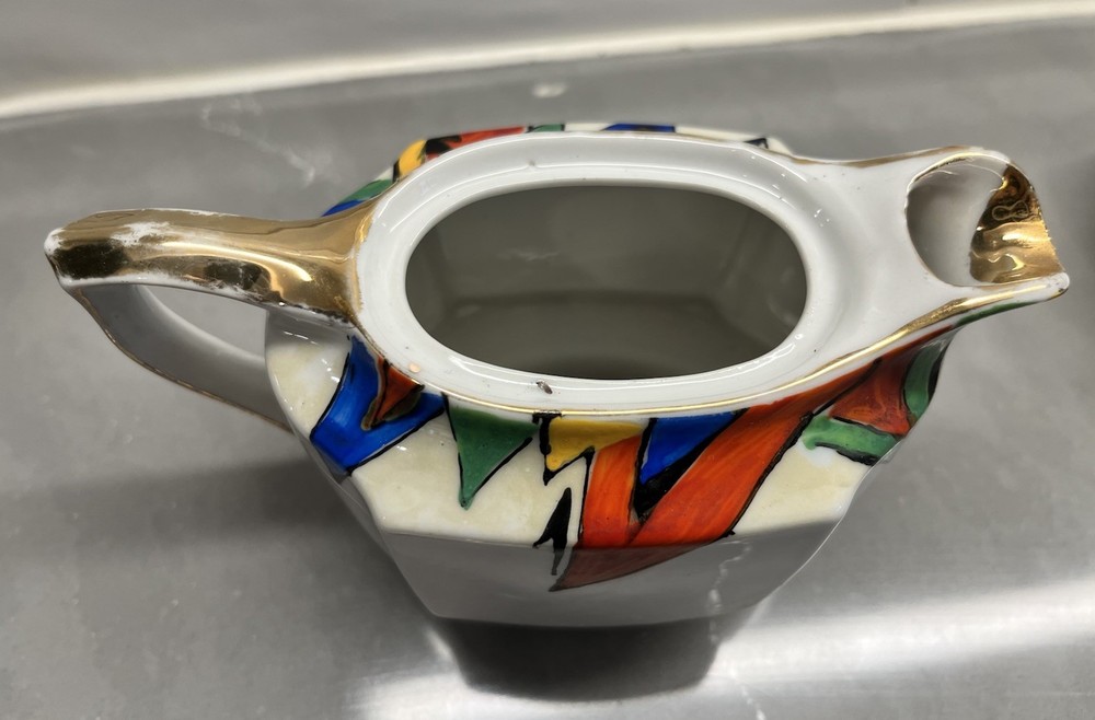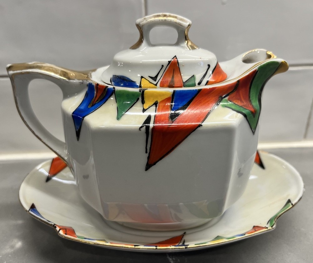 This exquisite tea pot is a true work of art, with a beautiful abstract design that will captivate anyone who sees it. The intricate gold trim adds a touch of elegance and sophistication, making it a perfect addition to any tea set collection. Hand painted with meticulous detail, this tea pot is a testament to the skilled artistry of Japanese culture. It is a must-have for anyone who appreciates the beauty and intricacy of Art Nouveau design. The teapot is almost 6 inches long and 5 inches tall. The tray is 7 inches long and 4.5 inches wide.