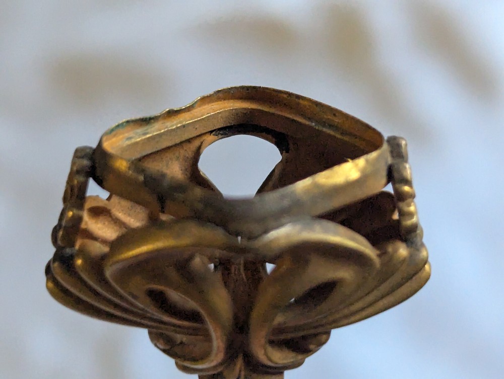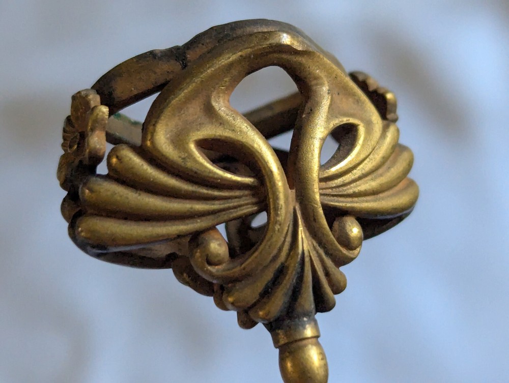 Fabulous antique art nouveau yellow gold plated hat pin. It would have had a stone at the top at one time that is no longer present. It measures approx. 9" long. We combine shipping costs! Please ask questions! Priority Mail and Ground Advantage now includes up to $100 of insurance. Check out my store! You will find clothing, handbags, jewelry, antiques and collectibles – even some stuff for the kids! Item comes from a smoke free, pet free home. Email me if you have any questions! Thanks for looking! A note about feedback: If you are planning to award less than five stars for any of the categories, please email me and let me know if there is an issue. I do my best to start items at the lowest possible price and provide great service. The rating system is how eBay charges the sellers our fees – so it is very important to us! Also, regarding shipping fees, I have no handling fees. The tracking number for your package inside the USA will be emailed to you. International and APO buyers are welcome and shipping is handled thru eBay. I do not end auction items early – ever!! It is not fair to everyone else, so please do not ask! Returns: Please measure your favorite fitting pieces of clothing in your closet and compare the measurements to the listing. If an item does not fit, it is not eligible for return. I do not refund shipping costs. If I have missed something or have grossly misrepresented an item, please contact me through the eBay email system and I will happily consider your item for a refund. Sign up for my newsletter! You will receive updates on new things in my store!