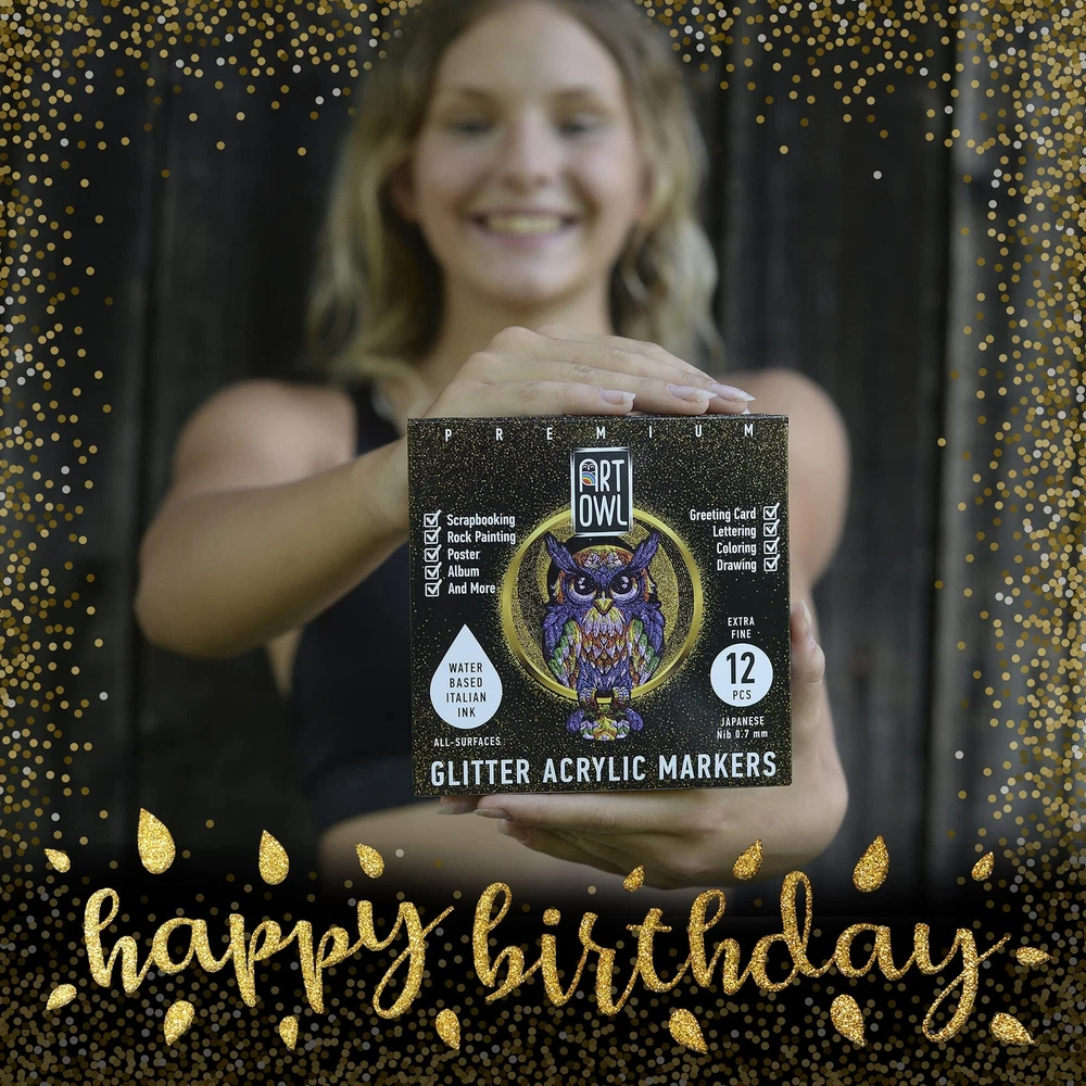 Art Owl glitter paint markers. Featuring a fine tip, these markers are ideal for detailing, outlines, calligraphy, or hand lettering, illustration, scrapbooking, doodling, coloring, and graffiti. Quick drying paint pens are safe on skin. Waterproof after baking or sealing. Multi surface acrylic sparkle markers will be a great gift to a loved one. Shimmer acrylic paint marker kit for kindness rocks, customizing mugs, Christmas balls, mandalas, porcelain, pumpkin, rock river, photo albums, card stock, and paper projects. Ideal for art amateurs, professionals, and hobbyists. Art supplies acrylic paint pens contain 12 vivid glitter colors: rose red, purple, khaki, yellow, pink, red, orange, grey, blue, sky blue, green, grass green. ART OWL is a family-owned supplier of paint markers designed in the USA. Set of 12 extra fine 0.7mm acrylic glitter paint pens for drawing super thin lines and fine details. Acrylic marker pens contain highly pigmented water based Italian glitter ink and easy control Japanese nib. Paint pens for DYI crafts have wonderful, glimmering colors, high opaque coverage to have hours of fun. Outdoor or indoor sparkle paint pen is waterproof, fast drying, fade-free, UV resistant, no odor. Use glitter metallic pen for rock painting, posters, greeting cards, scrapbooking, card stock, coloring and more.