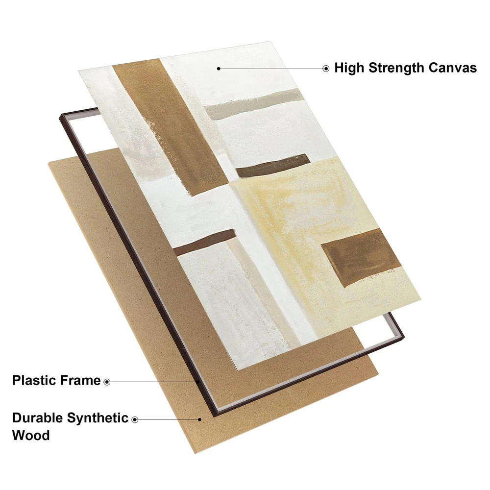 ArtbyHannah Large Framed Wall Art, Neutral Beige Canvas Wall Art with Abstract Prints, Modern Contemporary Wall Art Decor for Living Room, Bedroom, 2 Pack16x24 Inch Product Details Color: Beige Size: 16x24in, 2 Panels Brand: ArtbyHannah MPN: Does not apply UPC: Does not apply EAN: Does not apply Recommended Uses For Product: Indoor Indoor Outdoor Usage: Indoor Color Family: Neutral Orientation: Portrait Color: Beige Item Shape: Rectangular Pattern: Abstract Style: Modern Theme: Abstract Wall Art Form: Wall Hanging Decor Room Type: Bedroom, Living Room, Home Office Mounting Type: Wall Mount Frame Type: Framed Special Features: Framed, Waterproof, Lightweight Package Type: Box Packaging Manufacturer: ArtbyHannah Number of Items: 2 Age Range Description: Adult Number Of Panels: 2 Brand Name: ArtbyHannah Paint Type: Wood Finish Type: Coated Material: Canvas, Plastic Paper Finish: Matte Frame Material: Plastic Item Weight: 2.6 Kilograms Size: 16x24in, 2 Panels Item Dimensions L x W: 24"L x 16"W Unit Count: 2.0 Count Inspiration: Inspired by Francois Bonnel, the balance of color blocks in different sizes convey people's peaceful spirit and cozy life Applicable Space: 16x24inchx2pcs (40x60cmx2pcs) Application: A nice touch of abstract style for a modern house Delicate Prints: Giclee technology for high definition Sturdy Frames: Brown plastics frames with wood texture, lightweight and durable Easy To Hang: A groove embedded in the frames on the backboard for easy hanging