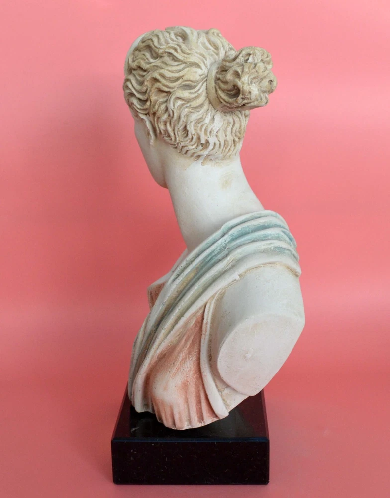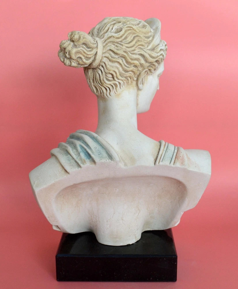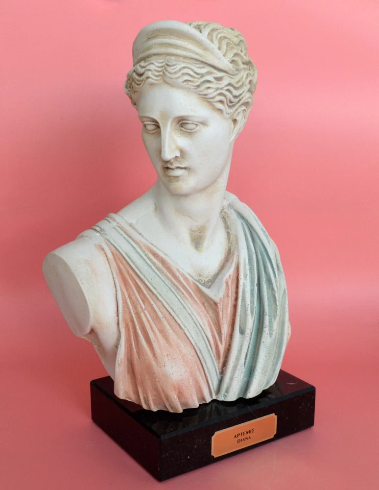 ARTEMIS BUST ON MARBLE BASE Artemis was one of the most widely venerated of the Ancient Greek deities. Her Roman equivalent is Diana. Homer refers to her as Artemis Agrotera, Potnia Theron: "Artemis of the wildland, Mistress of Animals". She was the Hellenic goddess of the hunt, wild animals, wilderness, childbirth, virginity and protector of young girls, bringing and relieving disease in women. Please be aware that, due to the fact that our products are either individually cast, carved, hand painted and hand finished, there will inevitably be minor variations in size, colour and texture.(B431) Details: Condition: New, Handmade in Greece Material: Casting stone Height: 26 cm(10.2 inches) Width : 17 cm(6.7 inches) Weight : 2.5 kg