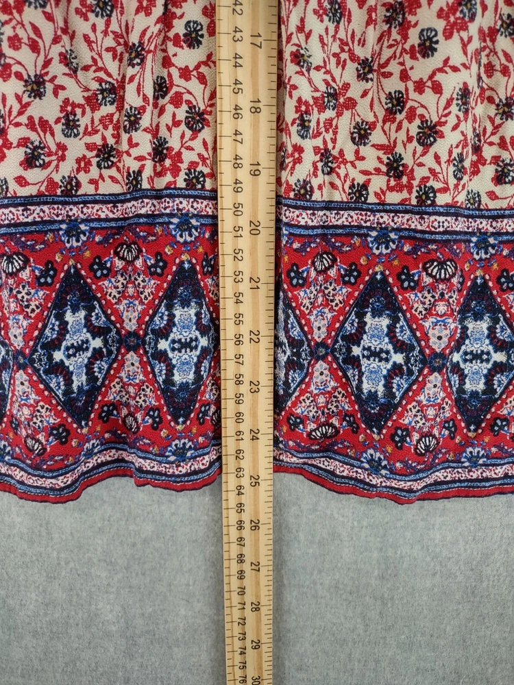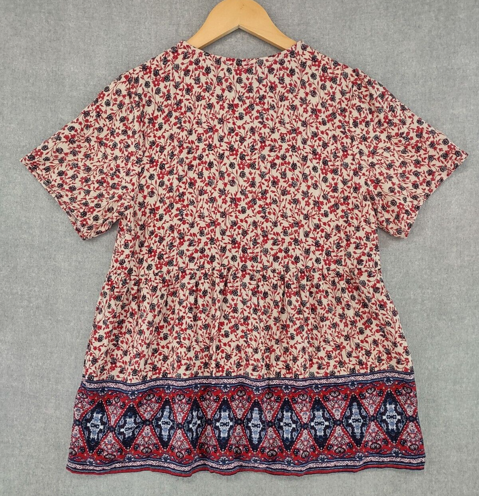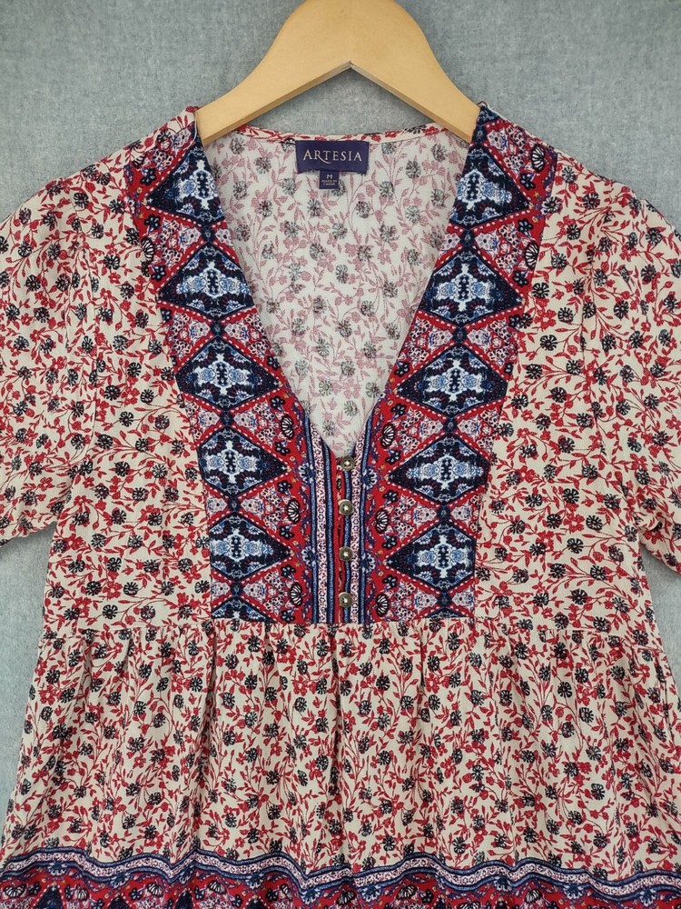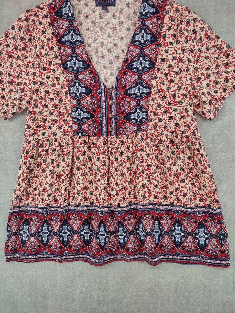 Welcome to Aspen Crossing, your destination for modern western bohemian style reflecting the rugged beauty of our American West. Artesia Top Womens Medium Relaxed Pleated Henley Bohemian Peasant Multicolor Short Sleeve 25" LENGTH: Measured from the top of the shoulder to the hem. 17.5" CHEST WIDTH: Underarm to underarm, measured flat from left to right. Short Sleeve It is always best to compare the measurements above with a top that fits you comfortably. CONDITION - Excellent pre-owned condition. All items are cleaned per EBAY standards. Not spot treated. See the photo gallery to view this items measurements and condition. SHIPPED - USPS First Class Mail unless item weight requires priority mail. RETURNS accepted, must be returned within 30 days in original condition to receive a full refund. SHIPPING AND HANDLING We ship all packages within five business days Monday through Friday except Holidays. Consolidated shipping is available for multiple purchases. Thank you for helping our planet and buying previously owned and loved items. I am grateful for your business. Enjoy! Check out our eBay store and follow us. There are new listings daily. CUSTOM SKU: Disclaimer: While we make every effort to capture the most accurate depiction of every item when photographing, colors may vary from screen display to in person therefore we cannot guarantee "exact shade" on any item. Message us if you have questions.