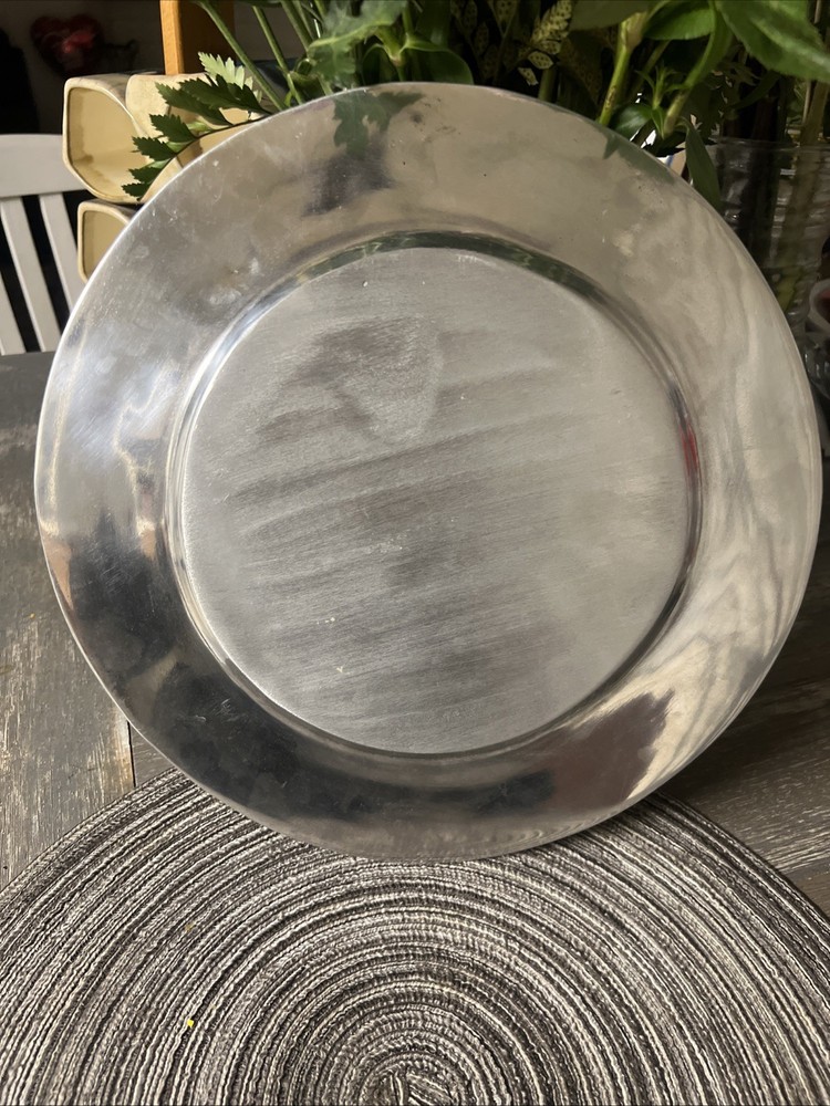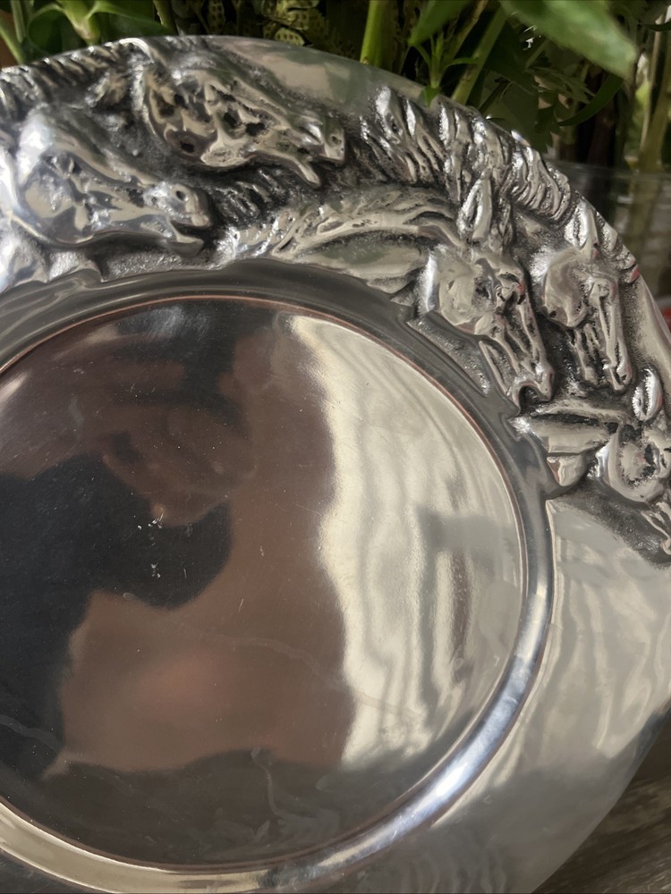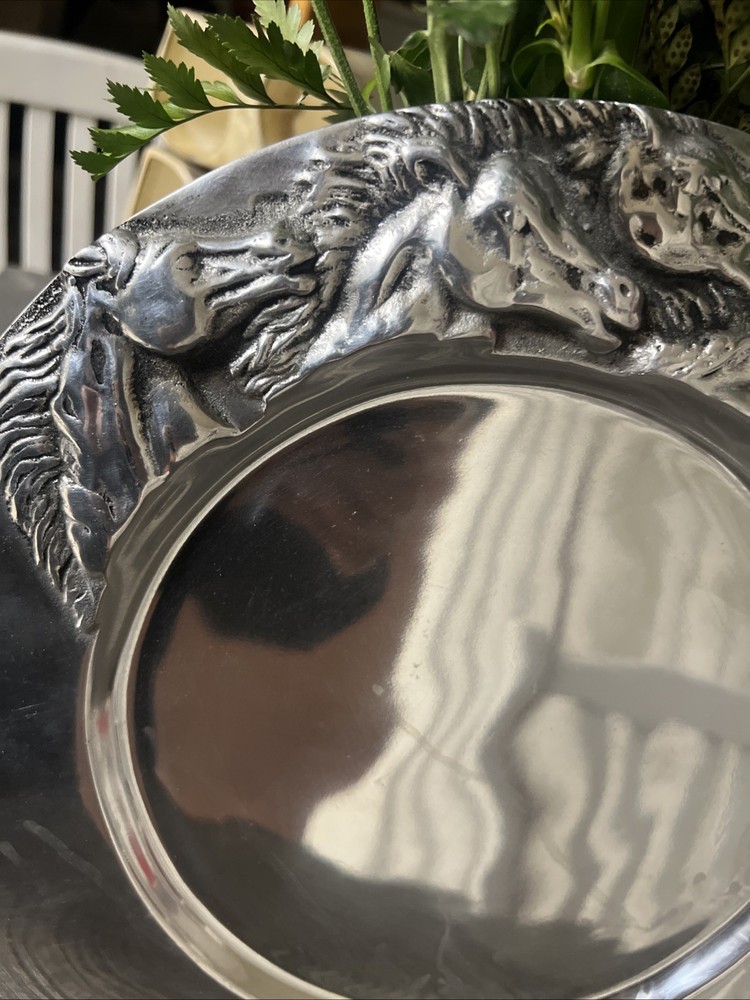 Brand: Arthur Court (Equestrian Collection) • Material: Signature aluminum alloy with permanent silvery luster • Type: Serving tray / charger plate / platter • Theme: Equestrian / Horse • Diameter: 12.5 inches • Weight: 2 lbs 3 oz — substantial, heavy-duty feel • Condition: Excellent preowned condition, reflective finish intact
