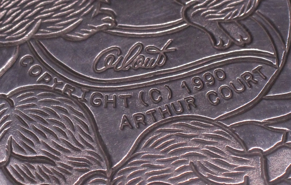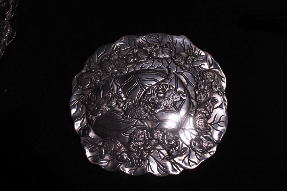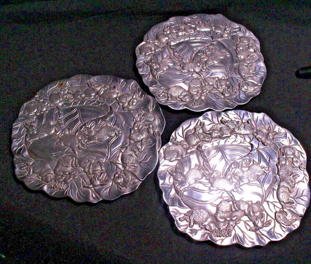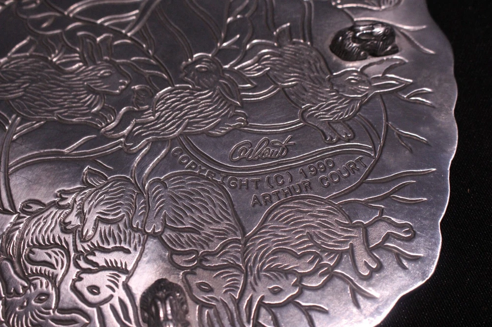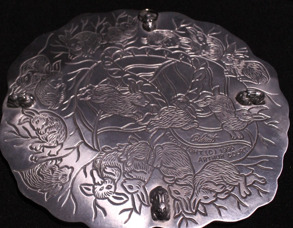 Add a touch of vintage charm to your kitchen with this set of three Arthur Court Bunny Rabbit Trivet Hot Plates. These hanging hot plates are made of durable aluminum and feature a cute design of Bunny Rabbits. Perfect for collectors or those who appreciate unique kitchen decor. Ideal for those who love metalware and collectibles.