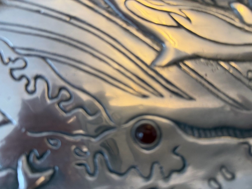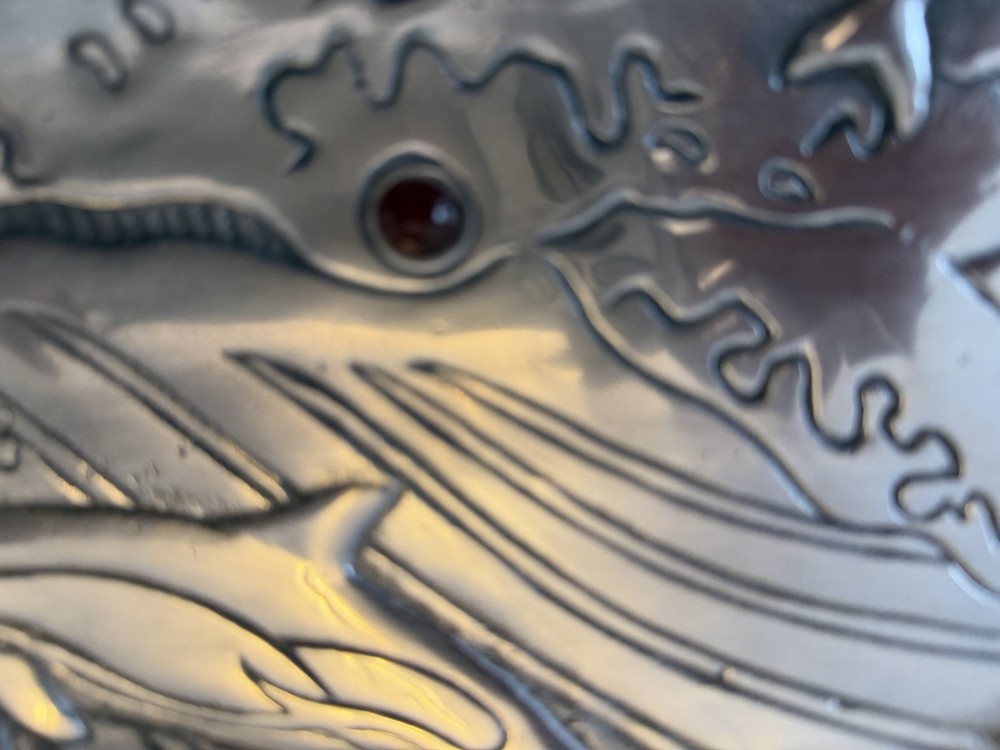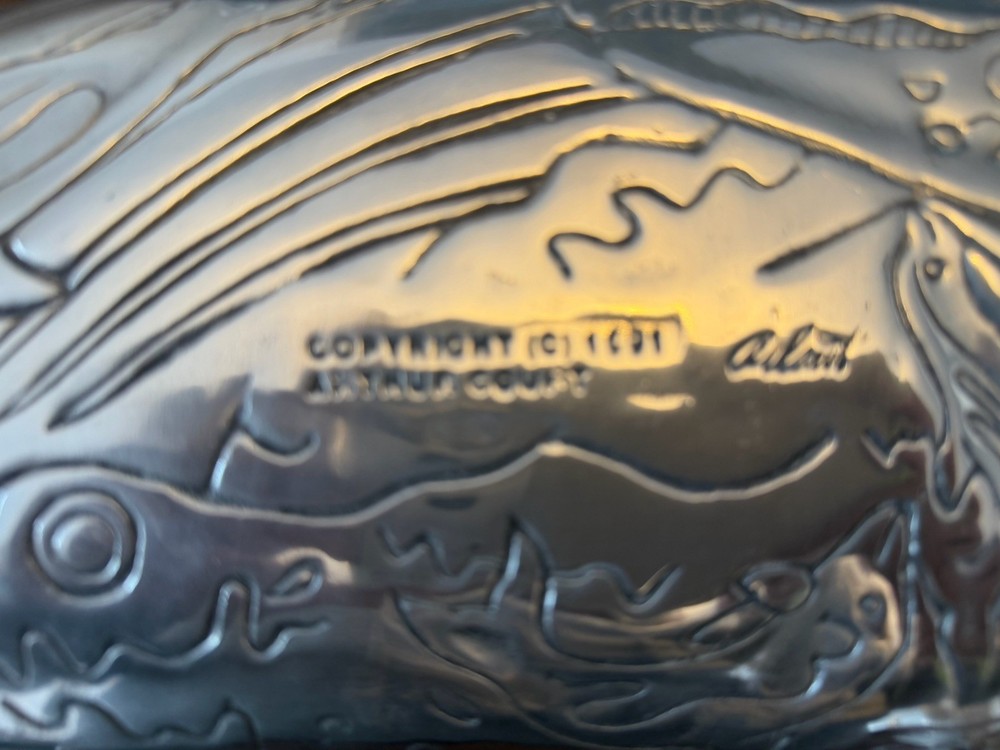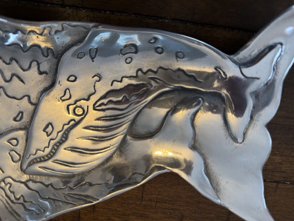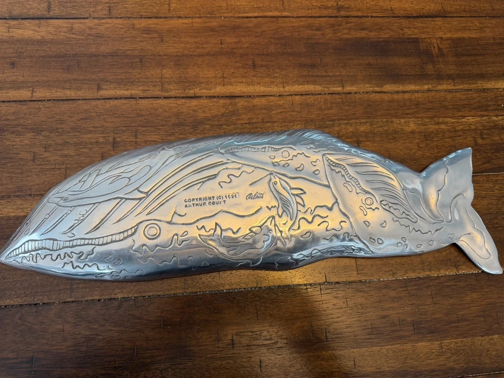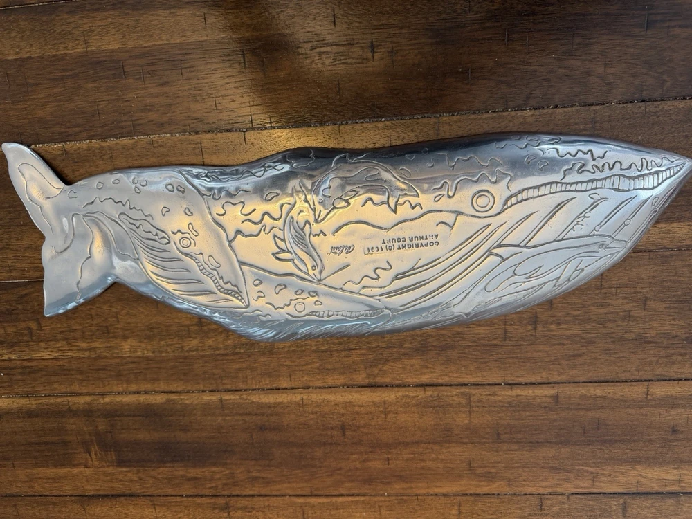 The Arthur Court Whale Plate Serving Tray is a stylish and functional piece of kitchenware. Made of durable aluminum by renowned brand Arthur Court, this tray features a unique whale design that adds a touch of whimsy to your table setting. The sleek and modern look of the tray makes it perfect for serving dishes or displaying decorative items in your home. With its high-quality material and timeless appeal, this tray is a versatile and practical addition to any household.