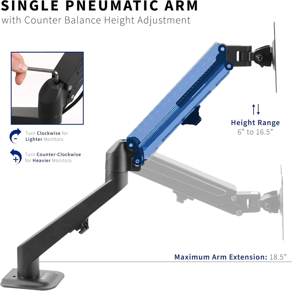 Product Description Articulating Single 17 To 27 Inch Pneumatic Spring Arm Clamp-On Desk Mount Stand, Fits 1 Monitor Screen With Max Vesa 100X100, Black, Stand-V101O Monitor Mount Solutions - We Create Affordable Ergonomic Solutions Designed With Creativity And Quality To Help Transform Your Unique Workspace! Stand-V101O Makes It Easy To Raise Your Monitor To An Ergonomic Height. Fully Adjustable - The Powerful Pneumatic Spring Arm Offers A Height Range From 6" To 16.5", And The Mount Features -45° To +90° Tilt, 180° Swivel, And 360° Rotation For Comfortable Viewing Angles. Please Note: The Arm Must Hold At Least 4.4 Lbs Of Weight For The Counterbalance Tension To Work Correctly. Compatibility - This Single Monitor Mount Fits Most Screens 17" To 27" In Size And Up To 14.3 Lbs In Weight With 75X75Mm Or 100X100Mm Mounting Holes. Suggested Desktop Thickness For The Sturdy C-Clamp Is 0.4" To 3.2", And An Optional Grommet Mount Is Included To Accommodate A Variety Of Layouts. International Products Have Separate Terms, Are Sold From Abroad And May Differ From Local Products, Including Fit, Age Ratings, And Language Of Product, Labeling Or Instructions. About Us We are a reputable seller with many years of experience selling on eBay. Our goal is to provide high-quality products and excellent customer service. Shipping Items will be shipped within 1-3 business days when we received payment. (Orders are not processed on weekends & holidays) Tracking information will be sent once item is shipped. Delivery time depends on destination and other factors Item is shipped to ebay address. Leaving correct address can minimize delay. For international shipping and shipping to Guam, Hawaii and Alaska, Please contact us before placing the order. International buyers please note: Import duties, taxes and charges are not included in the item price or shipping charges. These charges are buyer’s responsibility. We will try our best to reduce the risk of the custom duties. Local pick-up is unavailable at the moment. Contact Us We reply any email messages within 1 business / working days(off-duty at weekend). If you do not get a response from us, then please check your junk or spam mailbox. Our Business hours: Mon-Fri 9:00-18:00, UTC/GMT +8 hours. Please contact us either by clicking "contact seller" in the "purchase history" section or simply click "ask a question" at the bottom of this page. If you are unsatisfied with our item or service, please contact us before leaving any feedback. We are committed to resolve all issues in a friendly and satisfactory manner.