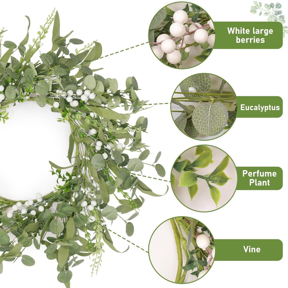 Artificial Eucalyptus Wreath for Front Door, Spring Summer Wreath with Boxwood for Window Wedding Decor Home Porch Farmhouse Patio Garden Decor 20 Inch Product Details Color: 2-green Brand: Grandeal Material: Eucalyptus Mounting Type: Wall Mount Shape: Round Product Dimensions: 20"D x 20"W x 3"H Manufacturer: Dongguan Qianjing Electronic Industry Co., Ltd. Color: 2-green Brand: Grandeal Material: Eucalyptus Mounting Type: Wall Mount Shape: Round Product Dimensions: 20"D x 20"W x 3"H Manufacturer: Dongguan Qianjing Electronic Industry Co., Ltd. Item Weight: 1.06 pounds Country of Origin: China Item model number: DCH-4V112MAB Date First Available: November 20, 2024 Rich, Realistic Handmade AppealOur hand - crafted eucalyptus wreath is truly something special! Packed with eucalyptus leaves, boxwood, and delicate white berries, it looks incredibly full and natural. It's so realistic, you'll feel like you've brought a piece of nature indoors. Its beauty will instantly brighten up your home, creating a warm and inviting atmosphere Ideal Size and Gift - WorthyMeasuring 20 inches in diameter, this wreath is perfect for any space. It comes in a sturdy, elegant box, making it an ideal gift for your friends. During shipping, it's compressed to keep it safe. But don't worry! Just give it a good stretch, and it'll reach its full, glorious size Incredibly Versatile DecorThis wreath is a decorator's dream! It's suitable for every season of the year. Add maple leaves for a touch of fall, or bells for a festive winter look. You can customize it however you like, and it'll always be the most unique piece in your home. Hang it on the wall, front door, porch, or in any room like the bedroom or living room. Whether it's an indoor or outdoor event, like a wedding or a party, this wreath will make a statement and impress everyone Exceptionally DurableCrafted from top - notch materials, this wreath is built to last. The colors won't fade over time, the leaves won't fall off, and the berries won't rot. There's no need for watering or any special cleaning. You can enjoy its beauty for years to come, without any hassle We're Here to HelpIf you have any issues with our product, don't hesitate! Contact us right away, and we'll get back to you as soon as possible. Your satisfaction is our top priority
