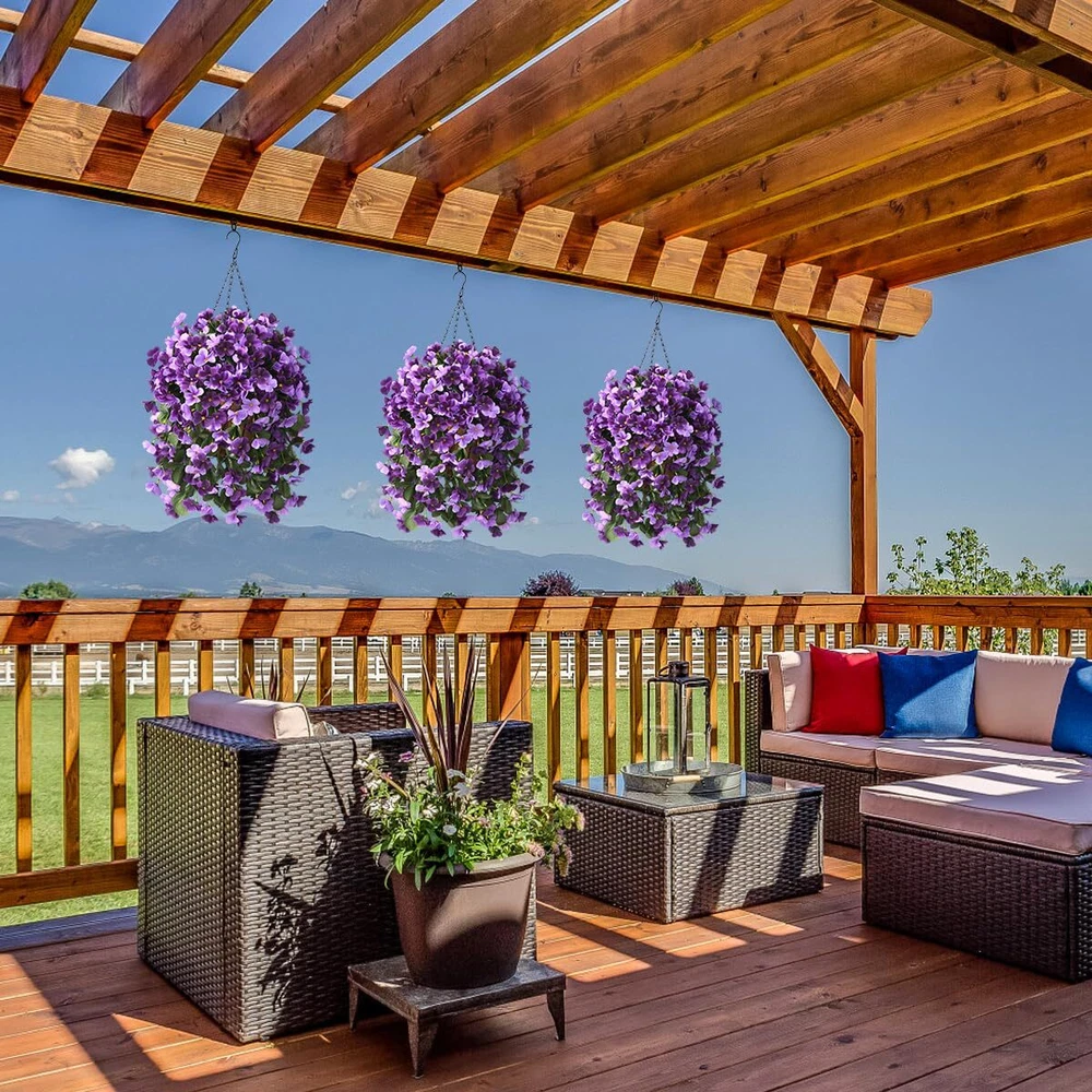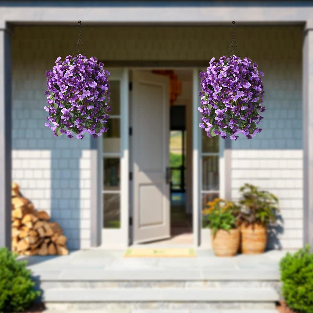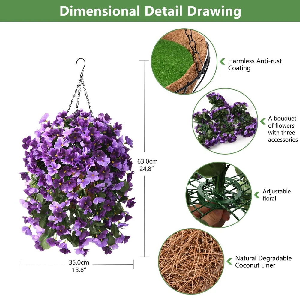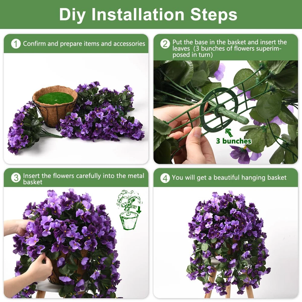 Package:artificial outdoor flowers including a 10 Inch coconut lining hanging baskets with chain,4 Pcs artificial begonias silk flowers. Easy Assembly:The artificial hanging flowers only take 5 minutes to assemble,just place the silk flower branches on the flower basket and design the shape.You will get a beautiful artificial flowers. Specs: The assembled dimensions of the artificial flowers are 15.7" x 15.7" x 21.6 "(L x W x H);The hanging basket measures 10" x 10" x 6.7 "(L x W x H) and the chain length is 13.8 inches. Good quality:The beautiful faux hanging silk flower basket are made of high quality fabric,good flexibility,easy to use,and do not require any maintenance after assembly.No watering,Looks full and fresh every day, and is sturdy enough to acknowledge any weather. Artificial flower decorations:The fake outdoor flowers look real and stylish,perfect for your home and Garden,indoors and outdoors,blooming in every season and keeping your home alive and vibrant all year round.