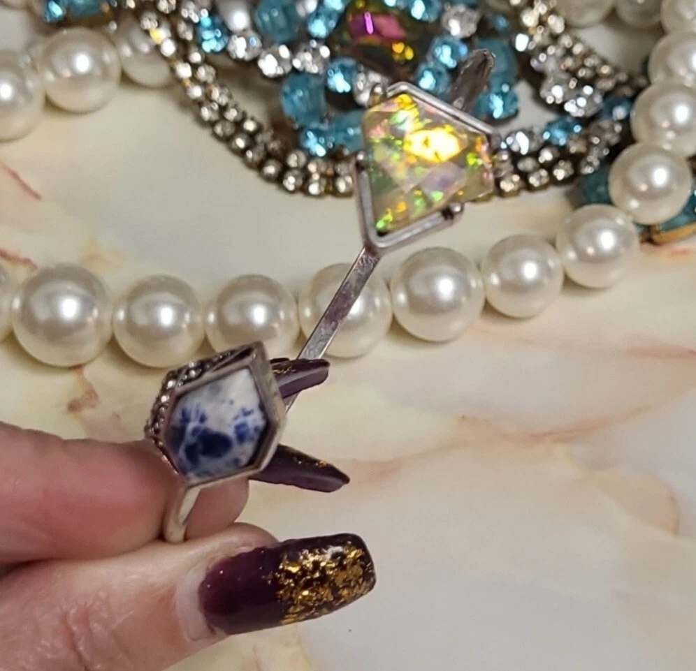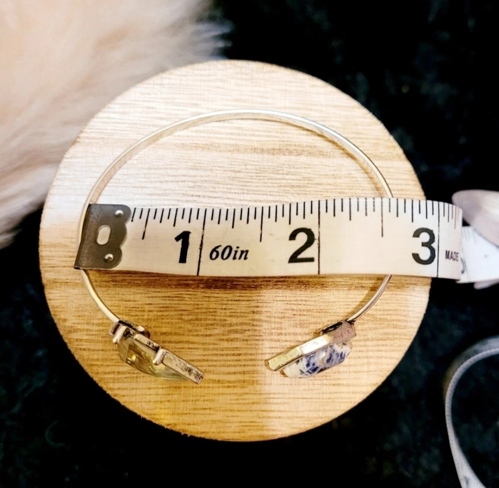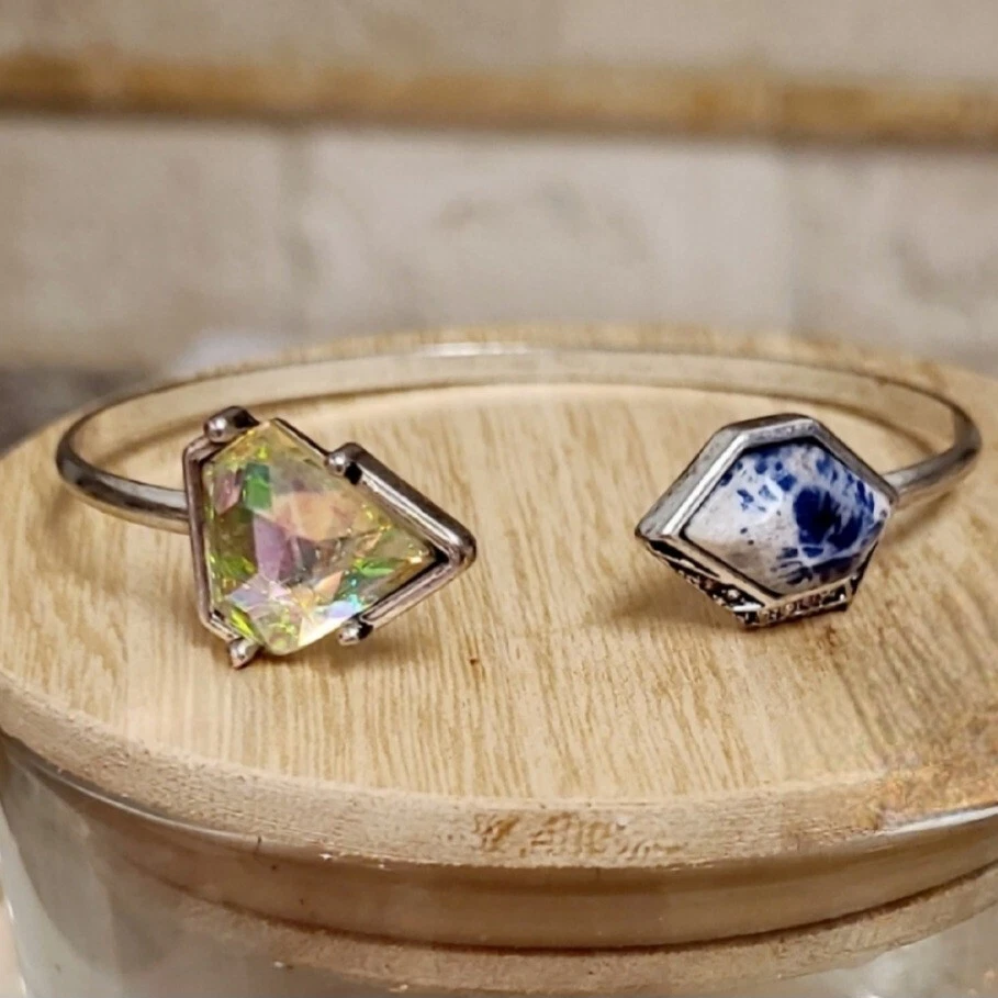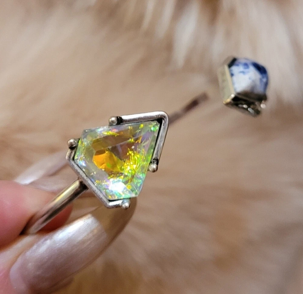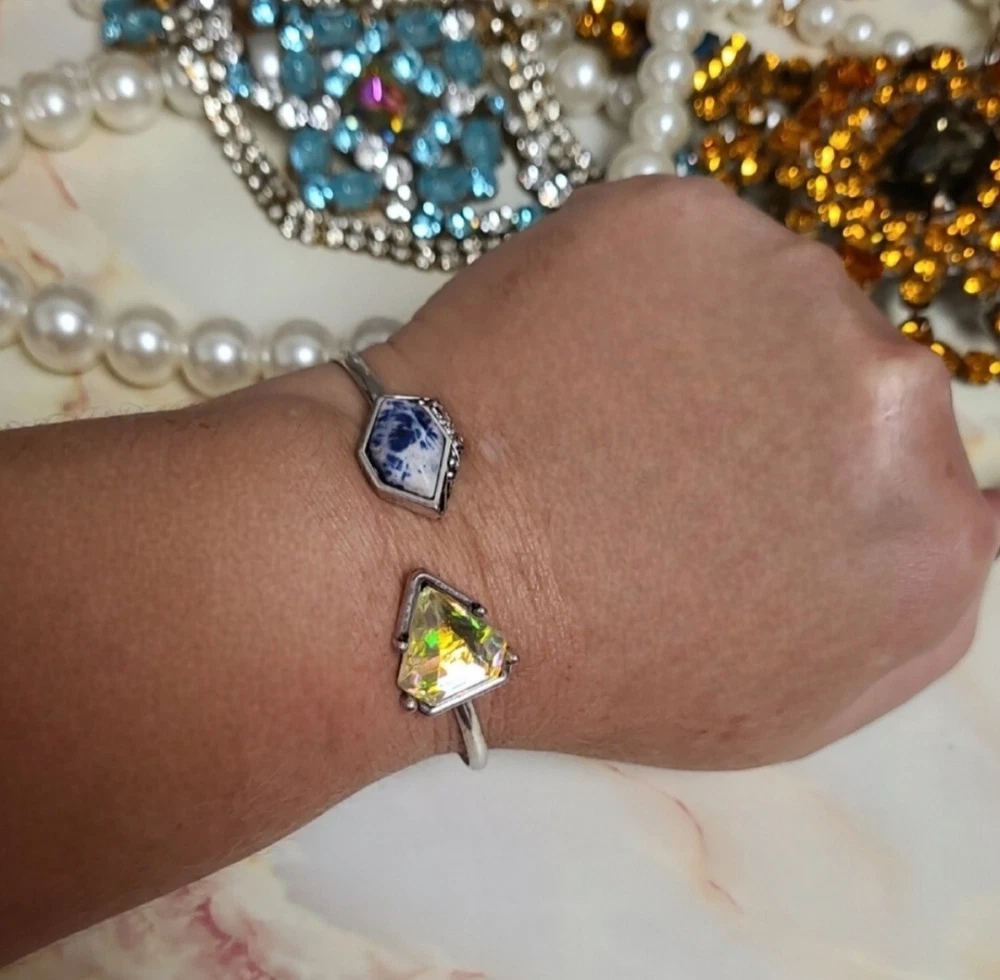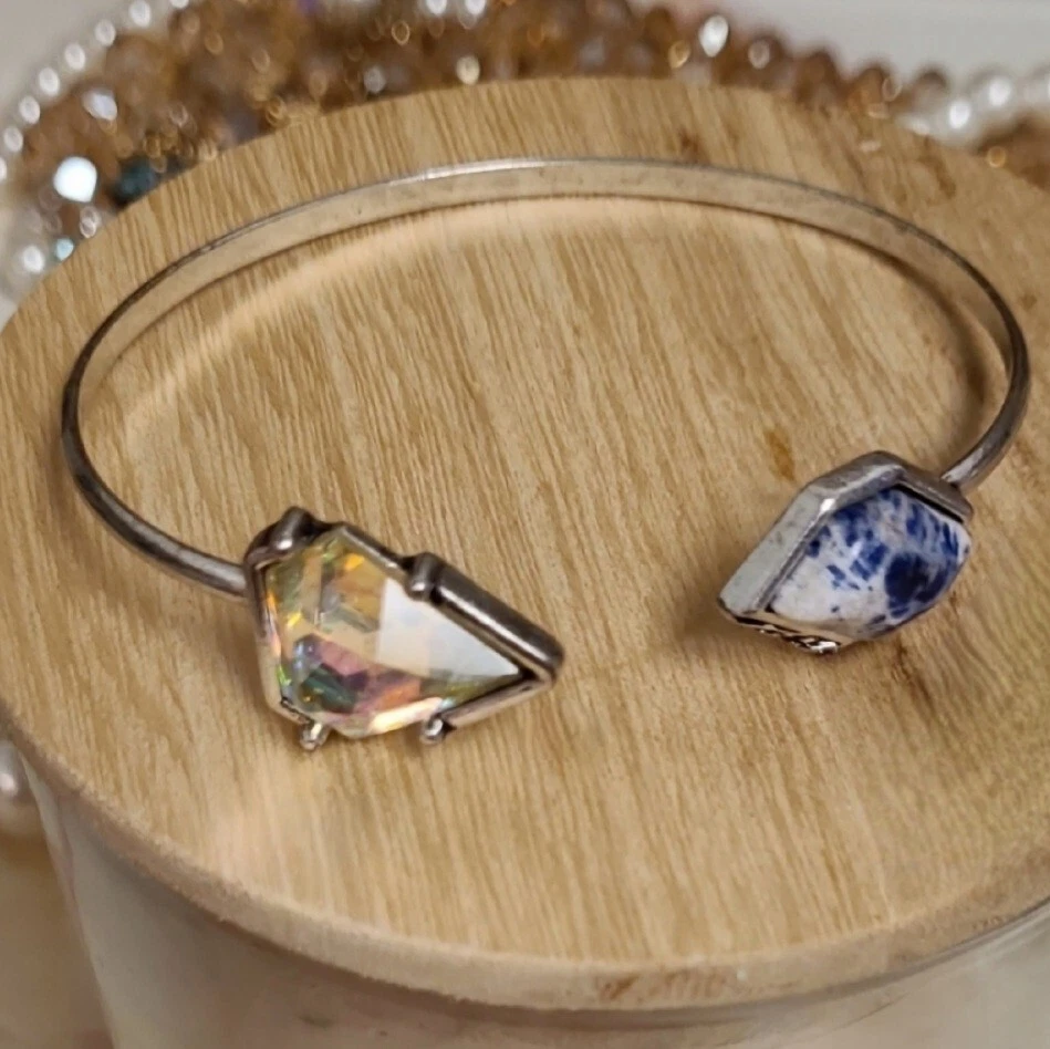 Elevate your style with this stunning Artisan bracelet, perfect for any nature-inspired outfit. The silver bangle is adorned with a beautiful blue Lapis stone and shimmering Aurora Borealis crystals, adding a touch of elegance to your look. Handmade with natural stones, this bracelet is a unique piece that will make a statement in any collection. The Artisan brand is known for their high-quality jewelry, and this bracelet is no exception. Whether you're dressing up for a special occasion or adding a touch of sophistication to your everyday look, this bracelet is the perfect accessory. This vintage-inspired cuff flaunts a slim silvertone band that is capped on either side by Lapis & sparkling crystal accent stones for glamorous allure. Simple yet elegant! 3" W Silvertone/crystal
