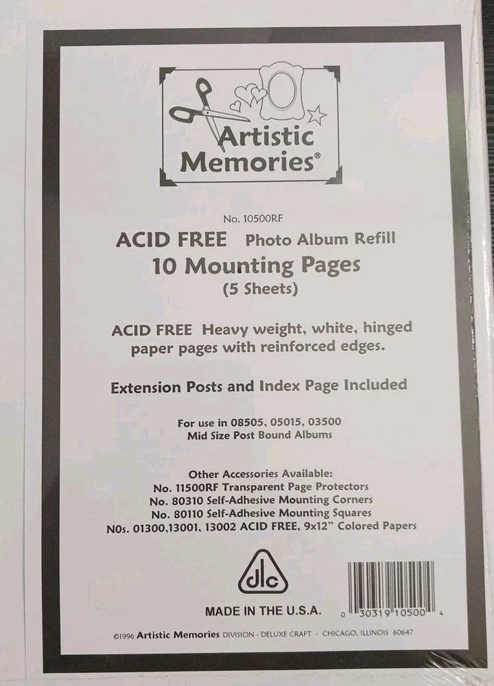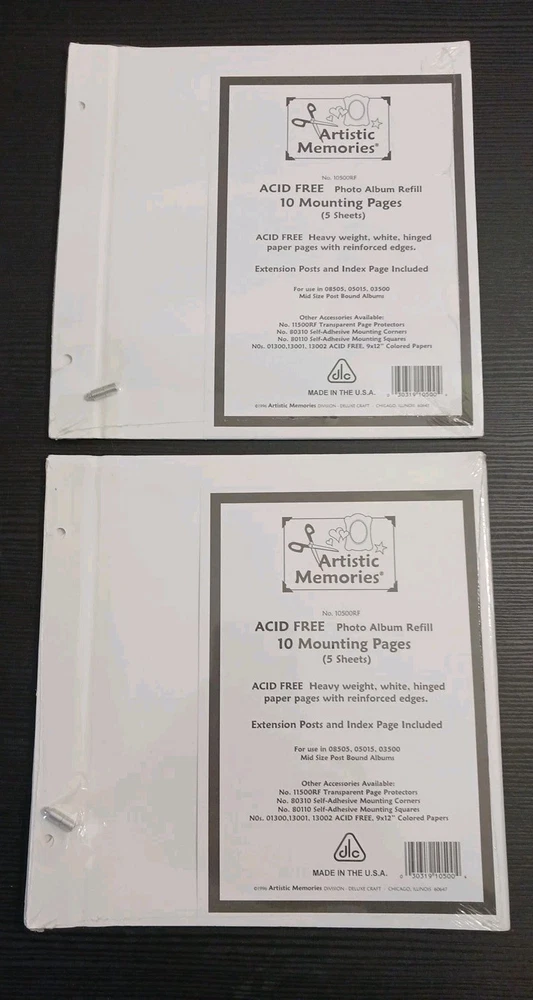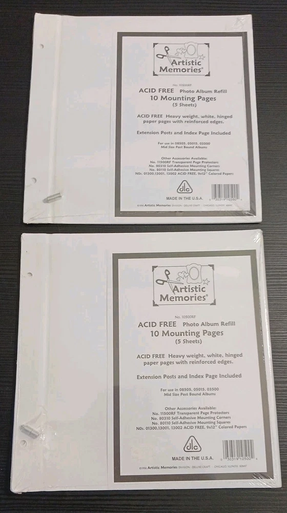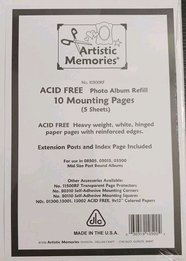 NEW in Package Artistic Memories Photo Album Refills Total of 10 Sheets - 20 pages Acid Free Mounting Pages No. 10500RF Dated 1996 MADE IN USA ACID FREE, Heavy-weight, White, Post Bound album pages with reinforced edges. Extension Posts and Index Page are also included in each package. For use in 08505, 05015, 03500 Mid Size Post Bound Albums If you are a rubber stamper, scrapbooker, or crafter, be sure to check out my store - I am in the process of listing over 30 years' worth of craft items!! I have lots of stamps from PSX and other companies as well as cross-stitch kits, quilting items, scrapbooking supplies from Creative Memories and other companies, and much, much more!! CM0106251ACORN
