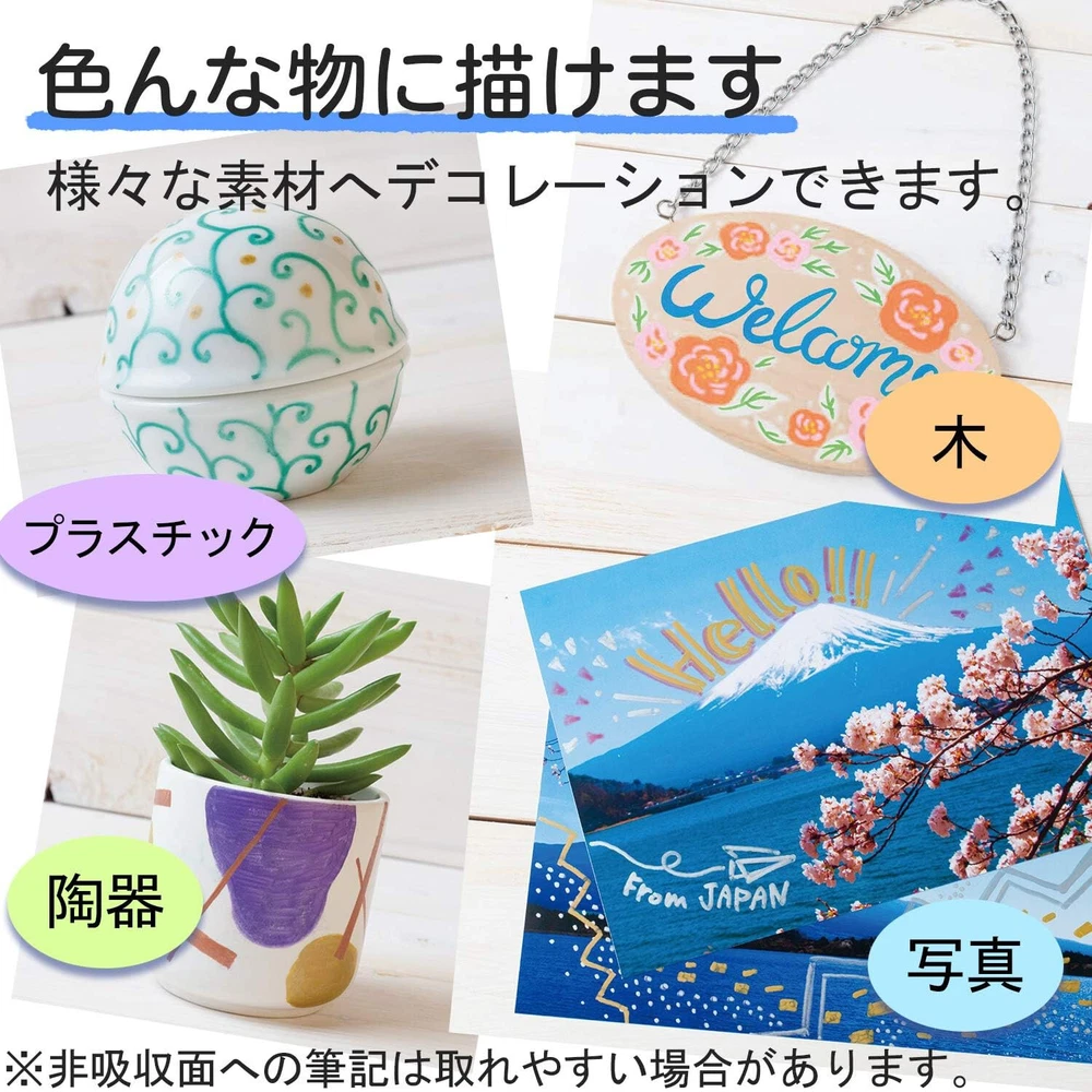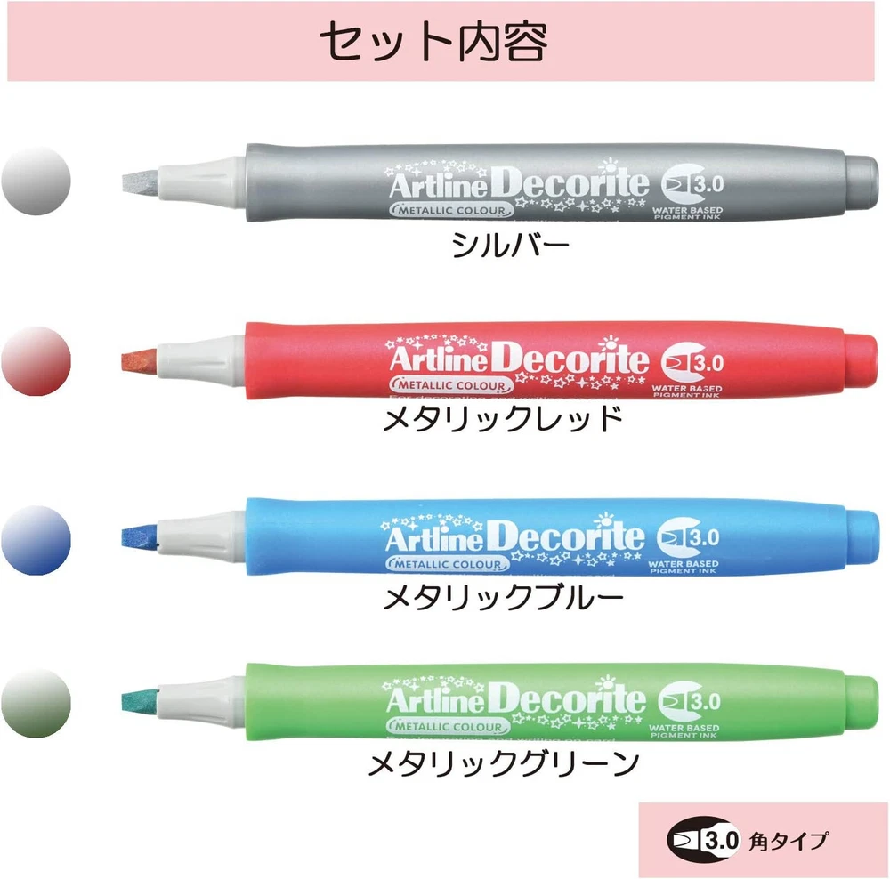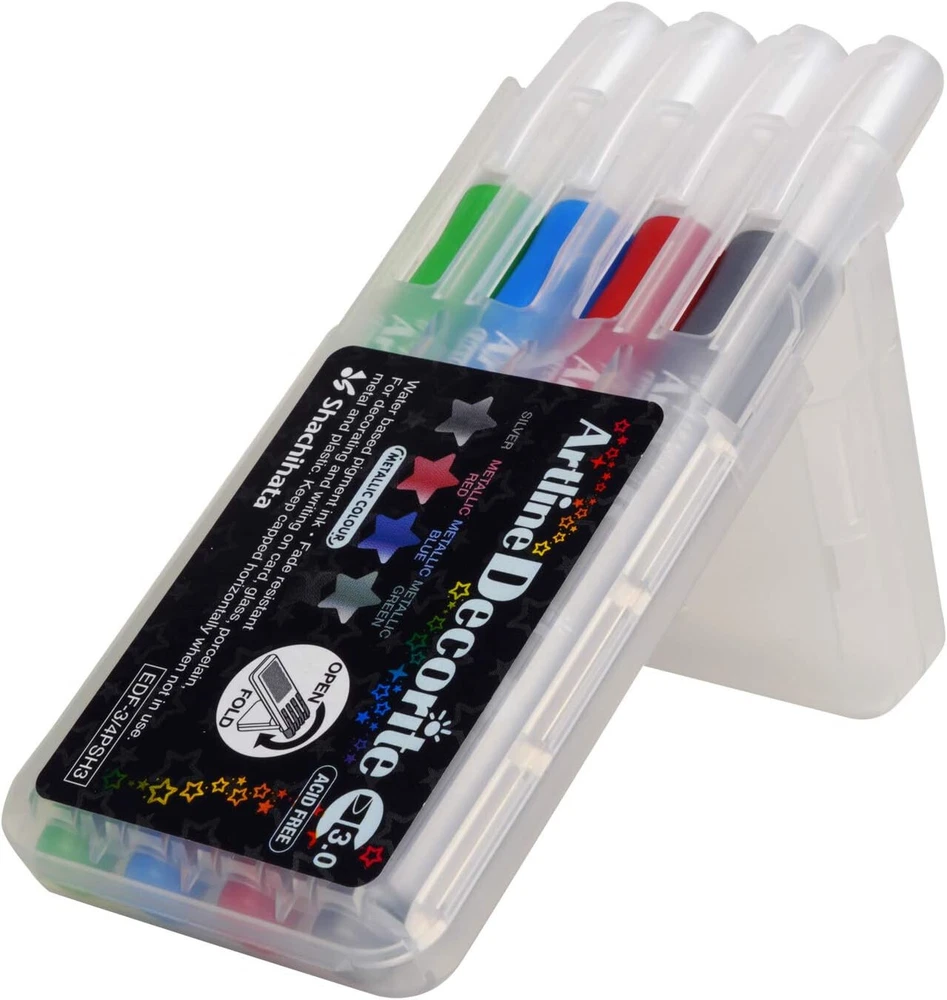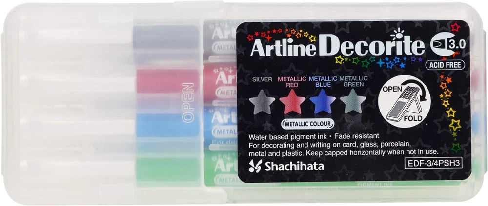 Artline Decorite Markers | Acid Free | Fade Resistant | Ideal for Overpainting and Layering | EDF-3 | 3.0mm Flat Tip | 4-Pack | Silver, Metallic Red, Metallic Blue, Metallic Green Brand Artline Ink Color White,Gold,Silver Number of Items 4 Point Type Flat Recommended Uses For Product Ceramic,Glass,Light,Plastic,Wood About this item ARTLINE DECORITE MARKERS - These markers use high-density, vivid ink that jumps off the page, making them ideal for layering colors after the ink dries. SURFACE APPLICATIONS - Can be used on virtually any surface. Ideal for decorating and writing on greeting cards and other crafting materials. WRITING WIDTH - 3.0mm flat nib creates solid lines of varying thicknesses. FADE RESISTANT - Durable ink is fade resistant, which ensures lasting impressions in harsh environments. ACID FREE - Ink is acid free, so you can expect your marks to last longer, stay sharp, and maintain color intensity. ERASABLE - Completely erasable with a wet cloth on non-porous surfaces, like plastic or glass. LOW ODOR - Ink is xylene-free, so there are little to no offensive odors or smells. SAFETY - AP certification identifies art materials that are safe and certified in a toxicological evaluation by a medical expert to contain no materials in sufficient quantities to be toxic or injurious to humans, including children, or to cause acute or chronic health problems. RoHS compliant, so you can feel confident that the product is safe from hazardous chemicals.
