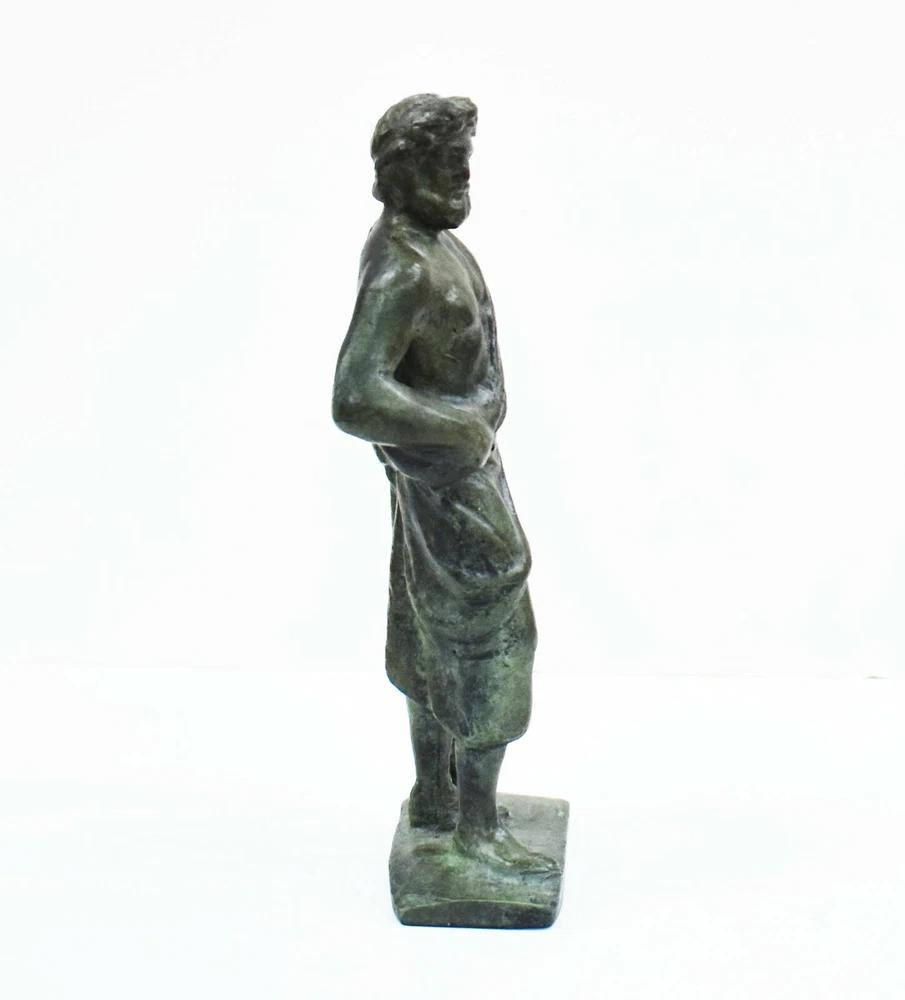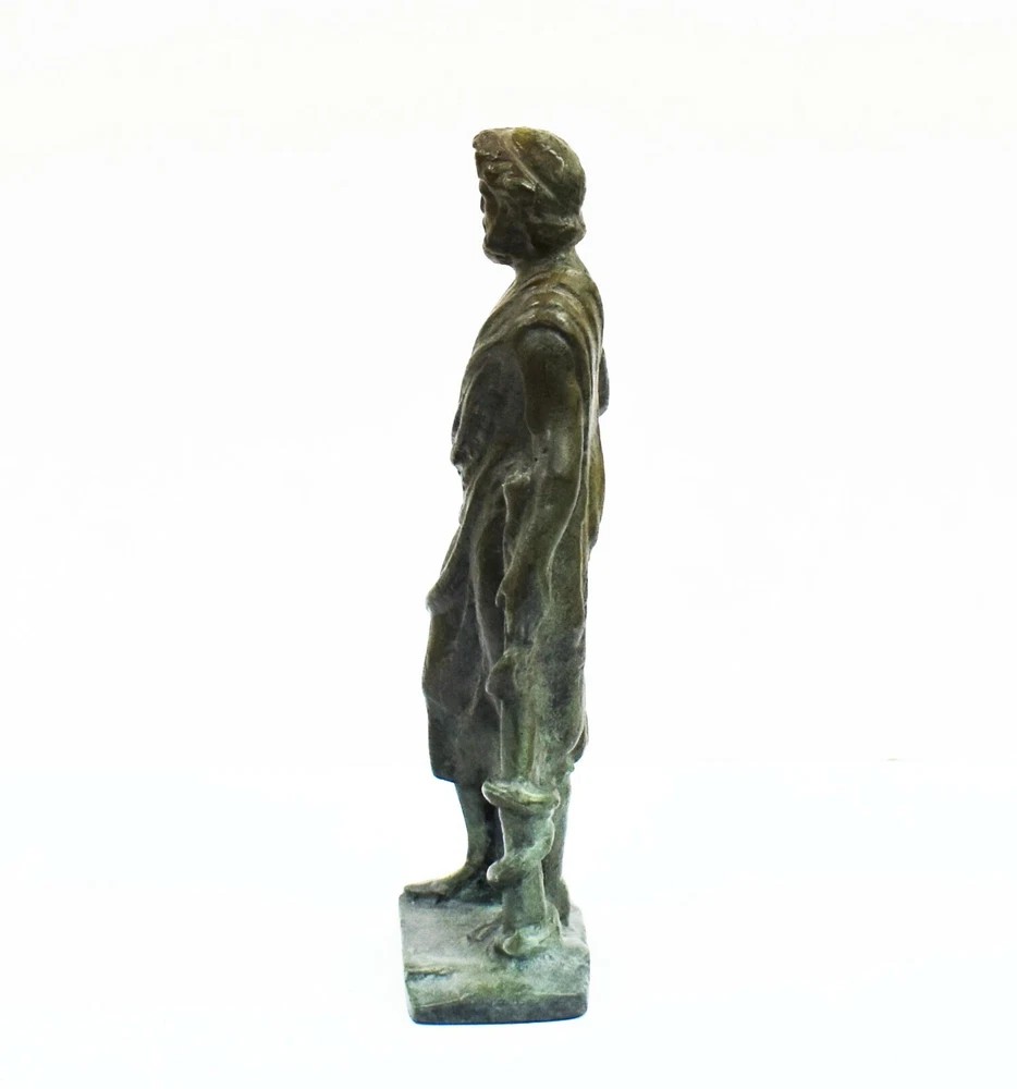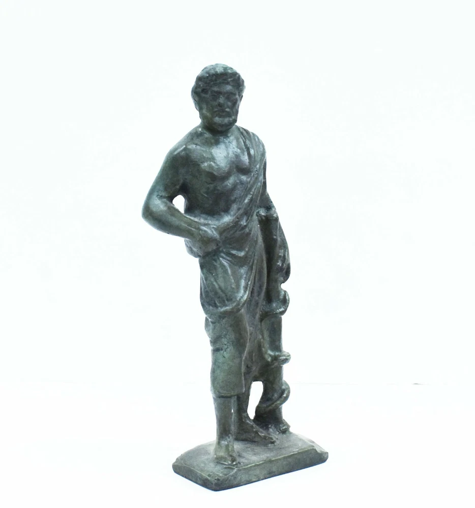 ASCLEPIUS BRONZE STATUE Asclepius was a god of medicine and healing in ancient Greek religion. Asclepius represents the healing aspect of the medical arts; his daughters are Hygieia ("Hygiene", the goddess/personification of health, cleanliness, and sanitation), Iaso (the goddess of recuperation from illness), Aceso (the goddess of the healing process), Aglæa/Ægle (the goddess of beauty, splendor, glory, magnificence, and adornment), and Panacea (the goddess of universal remedy). He was associated with the Roman/Etruscan god Vediovis. He was one of Apollo's sons, sharing with Apollo the epithet Paean ("the Healer"). The rod of Asclepius, a snake-entwined staff, remains a symbol of medicine today. Those physicians and attendants who served this god were known as the Therapeutae of Asclepius. All our bronze items, are cast in Greece, using the traditional 'lost wax' method. As nothing is mass-produced, there will inevitably be slight variations in patination and colouring. Each piece is, therefore, unique.(112200181004-A) Details: Condition: New, Handmade in Greece Material: Pure Bronze Height: 18 cm(7 inches) Width : 7 cm(2.7 inches) Length : 4 cm(1.6 inches) Weight : 1 kg