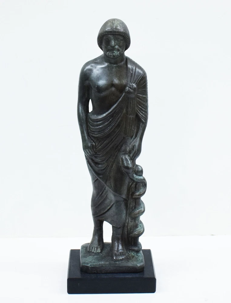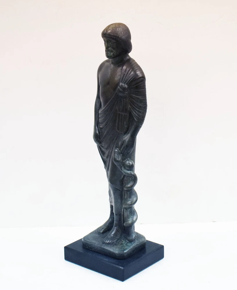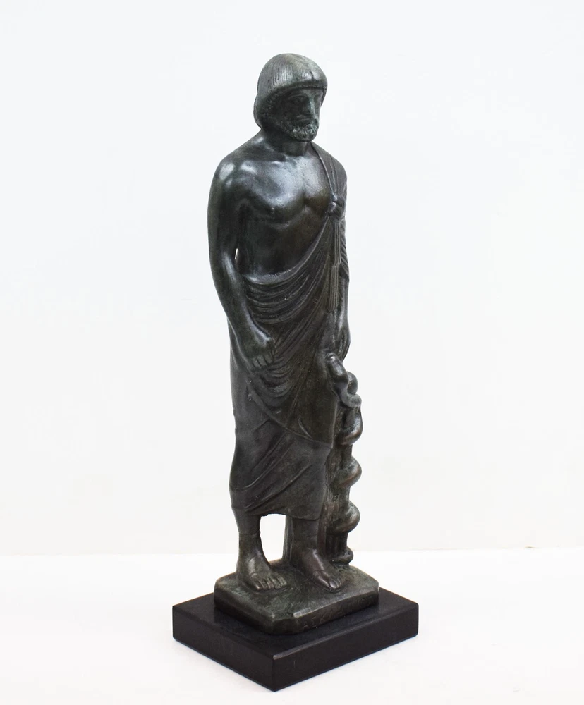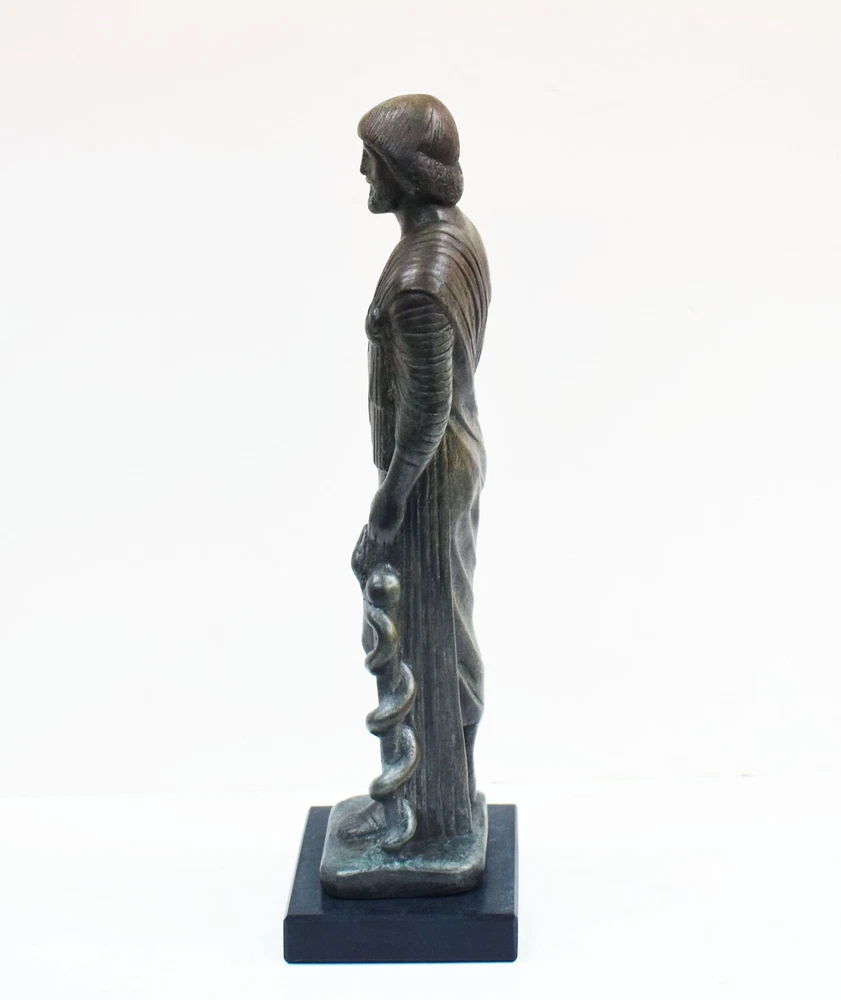 ASCLEPIUS GOD OF MEDICINE SMALL STATUE Asclepius is the god of medicine and healing in ancient Greek mythology. Asclepius represents the healing aspect of the medical arts. His daughters are Hygieia (goddess of health, cleanliness, and sanitation), Iaso (goddess of recuperation from illness), Aceso (goddess of the healing process) Aglaea (goddess of beauty, splendor, glory, magnificence, and adornment) and Panacea (goddess of universal remedy). He was associated with the Roman god Vediovis. He was one of Apollo's sons, sharing with Apollo the epithet Paean (the "Healer"). The rod of Asclepius, a snake-entwined staff, remains a symbol of medicine today.(01-570-A) Details: Condition: New, Handmade in Greece Material: Casting stone Height: 26 cm - 10.2 inches Width: 7 cm - 2.7 inches Length: 7 cm - 2.7 inches Weight: 700 g ********