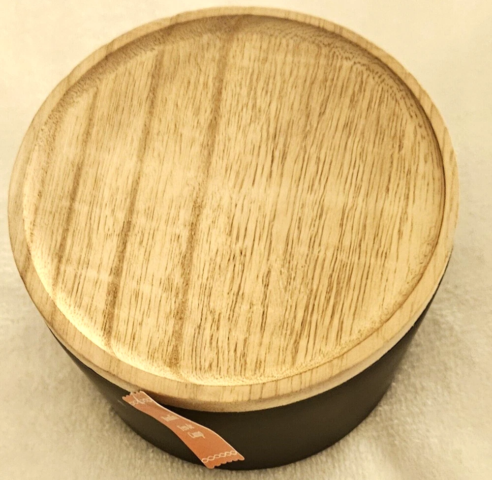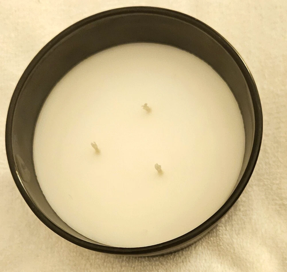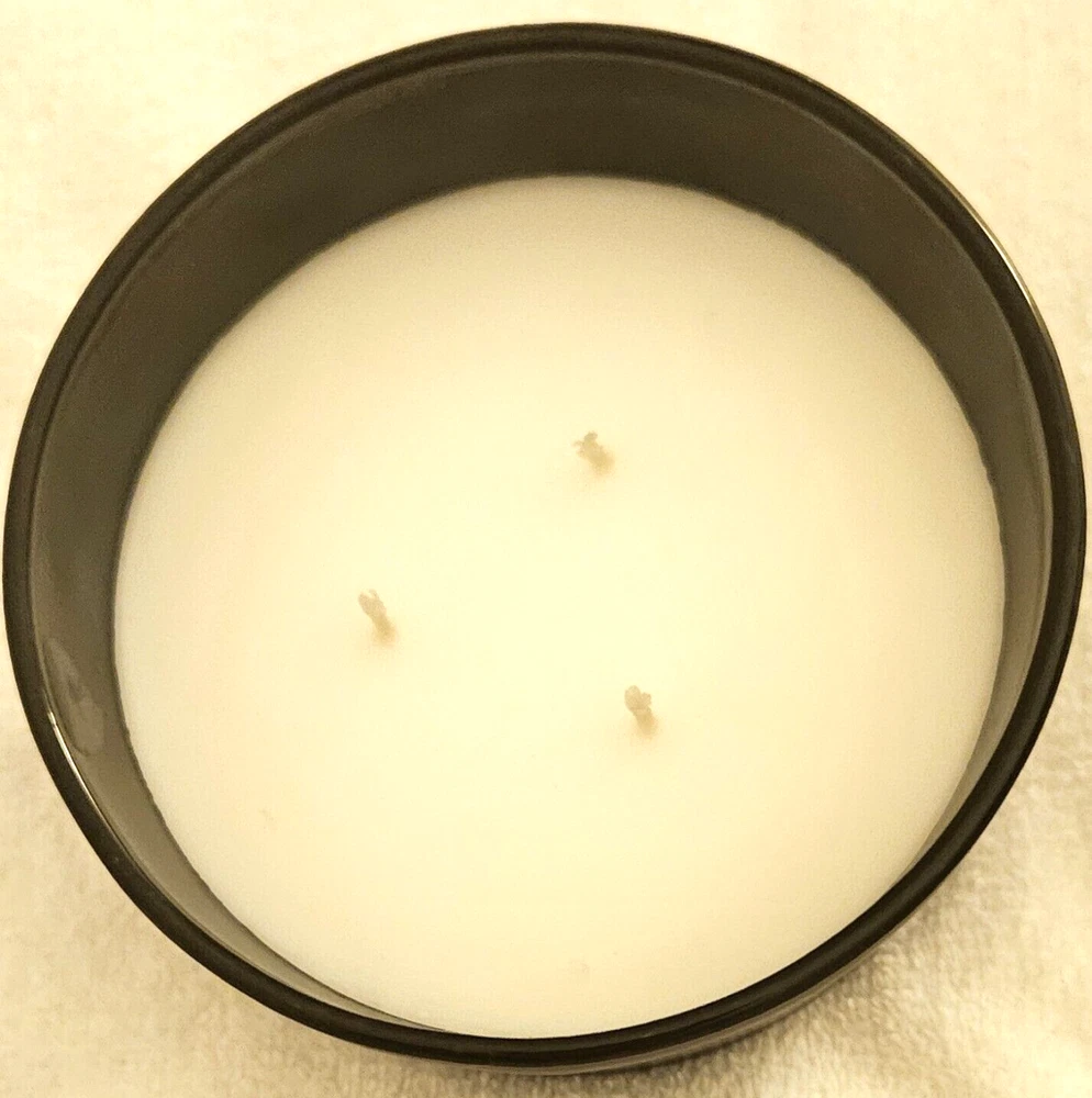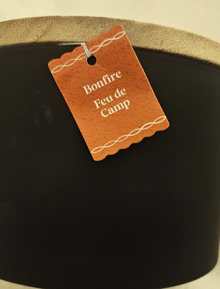 Bonfire 3 wick scented candle 13.5 oz comes in a Frosted black jar with cork lid P araffin and palm wax, glass, wood and fragrance 5.11" x 3.15" Bonfire scent