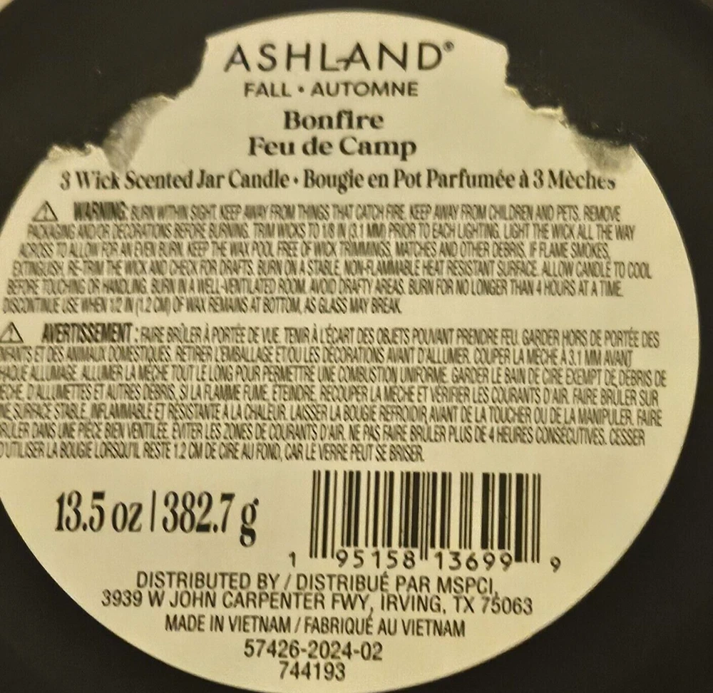 Item Weight: 13.5 oz Personalize: No Shape: Jar Customized: No Size: Large Color: Beige Scent: Bonfire Room: Bedroom, Dining Room, Entryway, Foyer, Guestroom, Indoor, Living Room, Lounge Number in Pack: 1 Handmade: No Type: Scented Candle Brand: Ashland Model: Bonfire Feu de Camp 3 Features: Multiple Wicks, Scented