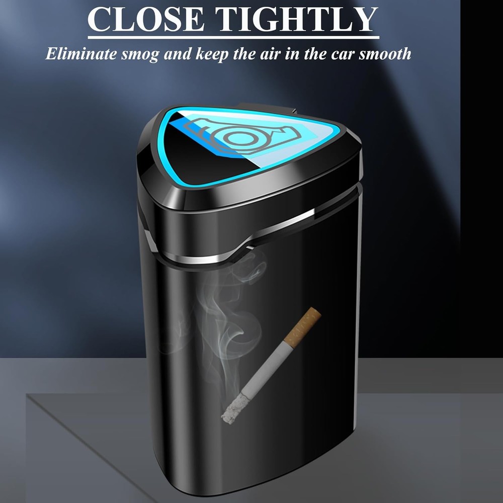 About this item PF Material: The car ashtray with lid is made of high flame retardant material, which is non-flammable and can isolate oxygen to help extinguish fire quickly. LED Night Light: Seven different colors of lights at the top will automatically switch colors when you close the lid. When you open the lid, the blue light inside will illuminate, providing easy visual access to the interior in dark environments. Unlimited Lighting: The ashtray features a built-in battery and USB charging cable, allowing for infinite cycles of cool lighting. A great gift for friends who smoke while driving. Specialty Design: Detachable for easy cleaning, with one large and one small cigarette holder to keep your hands free. Equipped with smoke extinguishing designs to quickly put out cigarettes. Multi-purpose: This ashtray is not just for cigarette ash; you can also use it for fruit peels, paper scraps, and other small waste. Portable and fits most car cup holders, making it ideal for both indoor and outdoor use in homes, offices, restaurants, hotels, gardens, parks, etc. Package Dimensions: 2.7"L x 2.9"W x 3.9"H