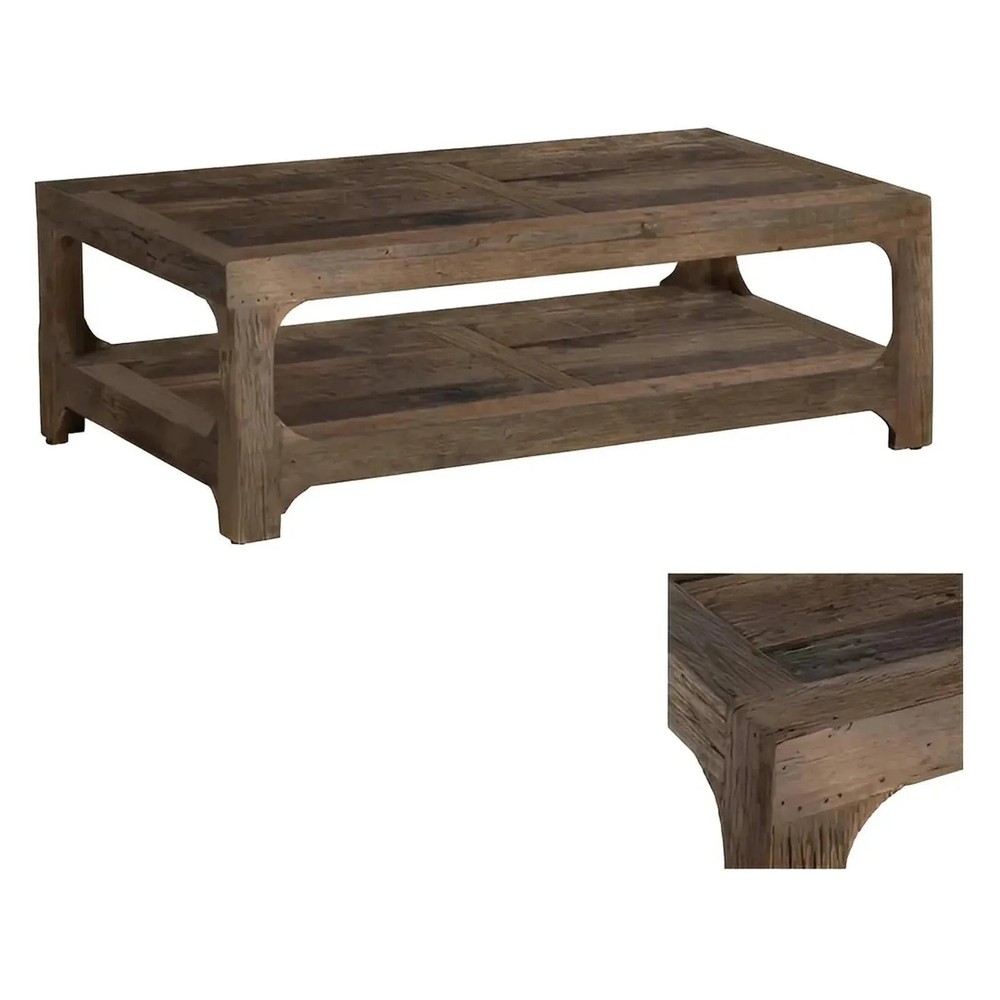 This Cocktail or Coffee Table by CV Collection is an exquisitely crafted work of art with rustic flair. This four-post design boasts a framework made from reclaimed wood that accentuates the beauty of shape and form. Its stained dark brown finish highlights the underlying texture of the wood for a touch of rustic elegance. As stylish as it is functional, the foundational shelf offers the perfect storage nook for decorative accessories, books or your favorite plush throw. Dimensions: 50 x 30 x 18.5 (in)