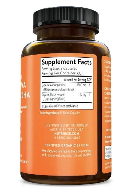 About This Item We aim to show you accurate product information. Manufacturers, suppliers and others provide what you see here, and we have not verified it. Our extra potent ashwagandha capsules are made with 1300mgof organic ashwagandha root powder per serving. Developed by experts, our 100%pure and all-natural ashwagandha is a powerful antioxidant that helps to:Reduce stress, anxiety and cortisol levels Improve thyroid function Combatadrenal fatigue Enhance mood and sleep Balance blood sugar levels Boostenergy levels and immune system Reduce joint pain and inflammation Optimizememory and cognitive function Increase stamina and endurance Stabilizehormones and endocrine health Improve libido and sexual function Read moreRead more 1 MOST EFFECTIVE ASHWAGANDHA FORMULA - MADE WITH ORGANICASHWAGANDHA & BLACK PEPPER Not all ashwagandha supplements are created equal.In order to reap the highest benefits, you must look for a specific criteria.To ensure superior quality and help deliver the best results, our expert-developed pure ashwagandha supplement is designed with the following formula:MADE WITH CERTIFIED ORGANIC ASHWAGANDHA ROOT POWDER: In order to ensure anashwagandha supplement is truly organic, it must be certified by an accreditedcertifying agent displayed on the label. Made with organic ashwagandhaextract, our natural ashwagandha supplement is certified organic by UDAF.OPTIMUM CONCENTRATION OF WITHANOLIDES: The results you experience with organicashwagandha capsules are dependent on the type, strength and dosage ofashwagandha extract delivered. According to research, ashwagandha extractedfrom leaves contains high levels of Withaferin-A, which can be toxic to cellsin higher concentrations. Sourced from pure ashwagandha root, our Ashwagandhacapsules contain the optimum concentration of withanolides to boost stressrelief, adrenal health and thyroid support. ORGANIC BLACK PEPPER EXTRACT FORABSORPTION BOOST: While Ashwagandha is recognized for its extraordinarypotential, its health benefits can be compromised due to limited absorption.ThatÂ’s why we have added 10 mg of organic black pepper extract to maximizeresults. According to clinical studies, black pepper extract has been shown toincrease absorption by up to 2000%, making our formula more effective thanother ashwagandha supplements that do not contain clinically provenbioenhancers. 3X MORE POWERFUL - 1300 MG PER SERVING: In order to beeffective, ashwagandha root capsules must be extra potent to have the highestconcentration of withanolides. While most ashwagandha supplements in themarket only contain 1000-1200 mg of ashwagandha powder per serving, ourashwagandha root capsules are made with a whopping 1300 mg of organicashwagandha per serving to help provide superior anti-stress and anti-anxietysupport. NO FILLERS - NO BINDERS - NO RICE CONCENTRATE - NO GMOs: Unlike manyother ashwagandha capsules that contain gelatin, rice concentrate, magnesiumstearate, silica and other harmful binders and fillers, our 100% pureashwagandha supplement is FREE of fillers, binders, animal by-products,chemicals and preservatives. VEGAN-FRIENDLY - GLUTEN-FREE - SOY-FREE - SUGAR-FREE - DAIRY-FREE: At NutriRise, our organic ashwagandha root is sustainablysourced and harvested with care. It is vegan-friendly, gluten-FREE, dairy-FREE, and FREE of all common allergens, such as peanuts, tree nuts, lactose,eggs, shellfish, milk, fish, wheat, corn, soy, sesame and palm derivatives.Read more YOUR SAFETY IS OUR 1 PRIORITY FREE OF HEAVY METALS, MERCURY &ADULTERANTS: Because your safety is our highest priority, testing is performedafter critical stages of production to manufacture an effective ashwagandhasupplement that is FREE of adulterants, solvent residues, heavy metals andbacterial contamination. SUPERIOR SHELF-LIFE POTENCY & Ashwagandha 1300mg Made with Organic Ashwagandha Root Powder & Black Pepper Extract - 120 Capsules. 100% Pure Ashwagandha Supplement for Stress Relief, Anti-Anxiety & Adrenal, Mood & Thyroid Support Indications: Health Concern: Immune System Support Supplementation Specifications Gender Unisex System of Measurement U.S. Customary Manufacturer NutriRise Count 1 Price Per Unit UOM Each Multipack Quantity 1 Model LE Brand NutriRise Nutrient Content Claims Organic Piece Count 1 PPU Quantity of Units 1 Each Count Per Pack 1 Product Name Ashwagandha 1300mg Made with Organic Ashwagandha Root Powder & Black Pepper Extract - 120 Capsules. 100% Pure Ashwagandha Supplement for Stress Relief, Anti-Anxiety & Adrenal, Mood & Thyroid Support Size 120 Vegetarian Capsules Color Black Assembled Product Weight 0.3 lb Assembled Product Dimensions (L x W x H) 4.02 x 2.52 x 2.52 Inches ~ Will be wrapped with care. ~ ~FREE SHIPPING~ Any questions, please feel free to contact us. Buy with confidence! Thanks for looking!