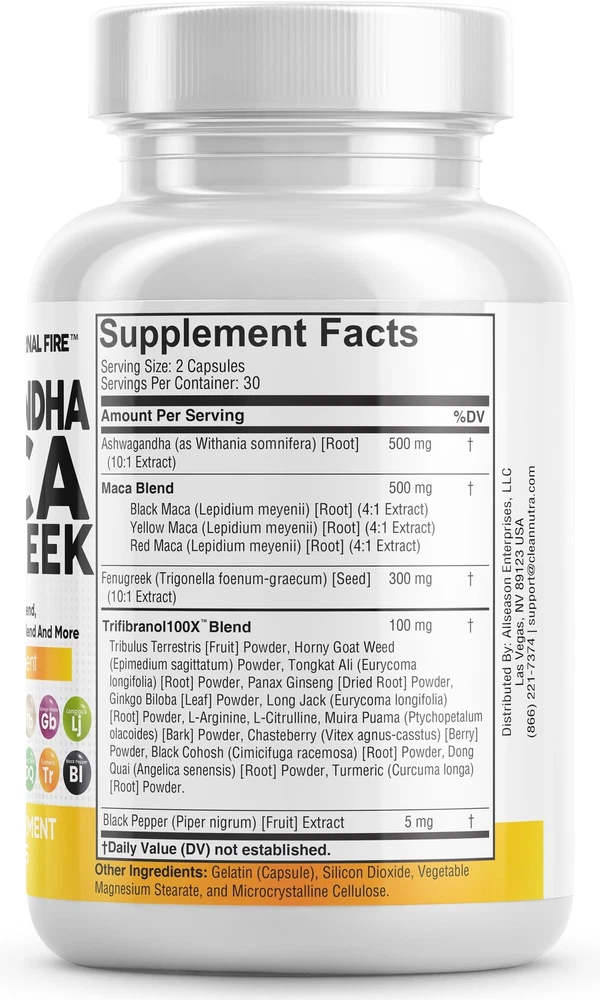 Advanced Ashwagandha Supplements for Mood Support - Our Ashwagandha Root Capsules contain 17 powerful ingredients such as Black Maca Root Powder, Red Maca Root Powder, Yellow Maca Root Powder, and Fenugreek Seed. Maca Capsules have been combined with Fenugreek Pills and Ashwagandha Pills to make one of the world's most inclusive 17 in 1 Stress Relief Supplement available. This is a potent alternative to ashwagandha gummies, maca coffee, fenugreek tea, and maca root gummies. The Ultimate Ashwagandha Extra Strength with Maca Root Capsules You've Been Looking For - Clean Nutra's Internal Fire provides 3 full-dose Herbal Supplements in one, containing a full Pure Maca Root, Fenugreek Capsules, and Ashwagandha Root in a convenient 2 capsule dosage. Stronger than Ashwagandha 400mg and Ashwagandha 300mg. Finally, Red Maca Root Capsules for Women and Black Maca Root Capsules For Men have been combined into one solution that also contains a Fenugreek Supplement. Introducing The Trifibranol100X Blend - In addition to Fenugreek Seeds Capsules and Maca Root Pills, our formula also contains over a dozen more powerhouse ingredients such as Tongkat Ali and Red Panax Ginseng Extract. This powerful Mood Support Supplement also has Black Pepper Extract to help maximize absorption and effectiveness of all 17 ingredients. Many prefer this when compared to aswagandhada capsules, aswagandha gummies, fenugreek seeds organic, organic maca, and ashwagandha organic. Powerful Combination Of Natural Herbs & Roots - Internal Fire is overflowing with potent pure ashwagandha, maca ginseng, and fenugreek supplements. Clear out those countless ayurveda products in your supplement cabinet and replace it with just 2 capsules per day. In addition, fenugreek capsules for women are also used as breastfeeding supplements and for lactation support. Better alternative to plain organic ashwagandha capsules, maca coffee for men, ashwagandha for men, and maca root for women. Vetted and Trusted Ingredients - We pride ourselves in offering quality stress supplements for our customers. Our maca supplement formulas are proudly made in a registered and certified facility. Some other common names and forms are ashwangha supplements, maca powder organic for women, maca root for men, maca ginseng for men, macca root, maca root liquid drops, organic maca root capsules and black maca for men.