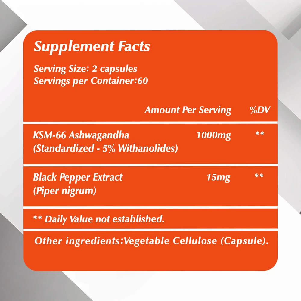 Effects: Emotional Support, Stress & Anxiety Relief Ingredients: Ashwagandha, Black Pepper Directions: Take 2 capsules once daily after a meal. Shipping: Ships within 48 hours on working days. Shelf life: 2 years Description: Mood Enhancer: Ashwagandha helps support a healthy stress response and maintain healthy cortisol levels, supporting positive mood and memory. Ashwagandha capsules also contain BioPerine, clinically proven to enhance nutrient absorption. Supports Energy: Stay energized during stressful times with lasting energy and vitality. Ashwagandha supports occasional insomnia by promoting deep relaxation to help you get the rest you need. Premium Product: Vegetarian formula. Contains no gluten, dairy, soy, corn or nuts. Document