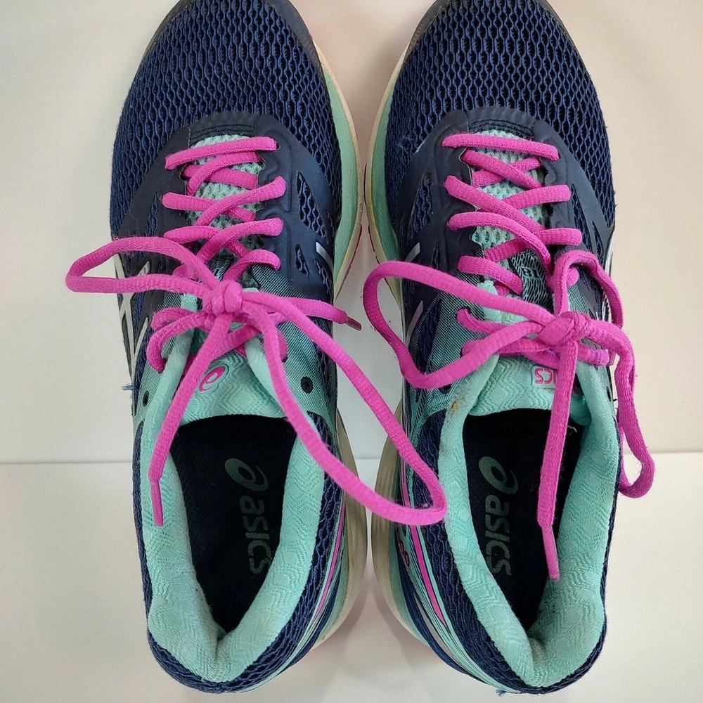 Asics Gel-Cumulus 18 - blue and pink Asics running shoes, women's size 9. They're in great condition, no holes, has small stain on the logo of left shoe (see pictures). Theyve been thoroughly cleaned before listing Please reference photos before purchasing