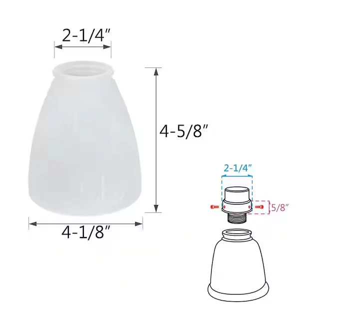 Aspen Creative offers a 4-pack of alabaster transitional style replacement glass shades. Each glass shade has a 2 1/4 in. fitter size and are 4-5/8 in. H x 4-1/8 in. Dia Our replacement glass shades can be used on an assortment of ceiling fan light kit products that use a 2-1/4 in. fitter. Upgrade and/or change the look for your fixtures with an easy to glass change. Ships in a 4-pack. Aspen Creative alabaster replacement glass, 4-pack 2-1/4 in. fitter size, 4-5/8 in. H x 4-1/8 in. Dia Replacement glass shades can be used on an assortment of ceiling fan light kit products that use a 2-1/4 in. fitter Upgrade and/or change the look for your fixtures with an easy to glass change Ships in a 4-pack Shipping Your order will be shipped same day for orders received before noon (E.S.T.). All orders ship USPS or UPS. You can expect to receive your order within 2-5 days after shipment. In an unlikely event that your order is lost or damaged in transit, it is eligible for full refund or replacement. Return Exchange Policy We offer a hassle-free 30-day return policy . You can return unopened items in the original packaging within 30 days of your purchase. If 30 days or more have passed since your purchase, we cannot offer you a refund or an exchange. Since we do not charge any restocking fee, items must be returned in the exact condition in which they were received with all the packaging. If you are entitled to a return, we will refund your purchase price and a credit will automatically be applied to your original method of payment.