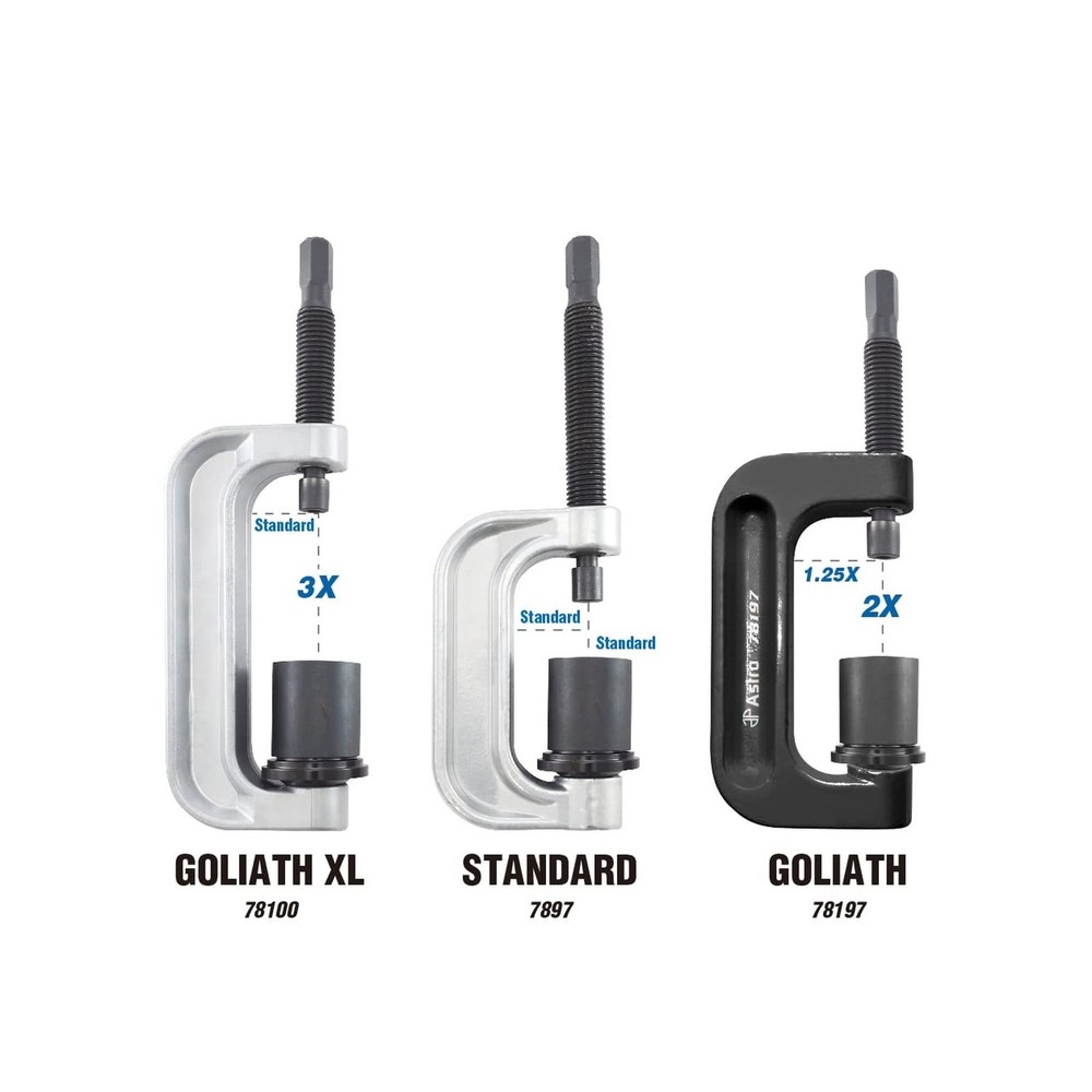 Astro Tools 78197 Goliath LARGE Ball Joint Service Tool and Master Adapter Set Description Always looking to provide more professional options in undercar and ball-joint tool categories, Astro Tools introduces the 78197 Goliath Ball Joint Service Tool and Master Adapter Set, our most comprehensive and capable ball-joint service set ever. The all new Goliath C-frame press included in the 78197 set continues the success of our 78100 Goliath XL press with some added benefits. The new Goliath design features 2X the available working throat space when using most adapters compared to our standard press, and 25% deeper arms than any press including the Goliath XL. This means you can more freely position large adapters or stack multiple inline AND enjoy a longer arm length positioning the press away from interferences working on larger applications including 3-1/2 & 4-1/2 ton trucks. In order to achieve both of these changes that result in a great increase in leverage working against the tool, Astro has implemented our beefiest c-frame design yet while utilizing our in-house trusted forged steel alloy that has made our ball-joint presses professional grade. Designed for work on 2WD & 4WD Domestic, Import & Euro vehicles through the 2020’s the included manual provide information for over 1,100 applications. Along with the C-frame press, all adapters in set are100% forged and the large ball-bearing forcing screw is class 12.9 heat treated for max durability. Features: Astro's latest large forged alloy C frame press with industry leading strength and both a wider opening and longer arms to more easily fit adapters Set includes all the receiver tubes and removing/installing adapters needed to work on press-fit upper and lower ball joints Works on 2WD & 4WD Domestic, Import & Euro vehicles through the 2020s, includes information for over 1,100 applications All forged adapters and class 12.9 heat treated ball bearing forcing screw for max durability Product Details: Manufacturer: Astro Tools Part Number: 78197 Item Weight: 38.8 pounds Product Dimensions: 24.4 x 19.4 x 5.12 inches Item model number: 78197 Color: Standard Power Source: hand_powered Item Package Quantity: 1 Included Components: BALL JOINT Batteries Included?: No Batteries Required?: No Warranty Description: 1 Year Date First Available: March 6, 2023 Delivery We Do Not Ship Outside of the Continental US. Return Policy All items qualify for returns within 30 days of receipt. Seller is responsible for return shipping on any item that is not damaged. Feedback We take our reputation seriously, we buy and sell online, so we understand the value of trust. If you are unsatisfied with your order, please contact us and we will work with you to resolve it to your satisfaction.