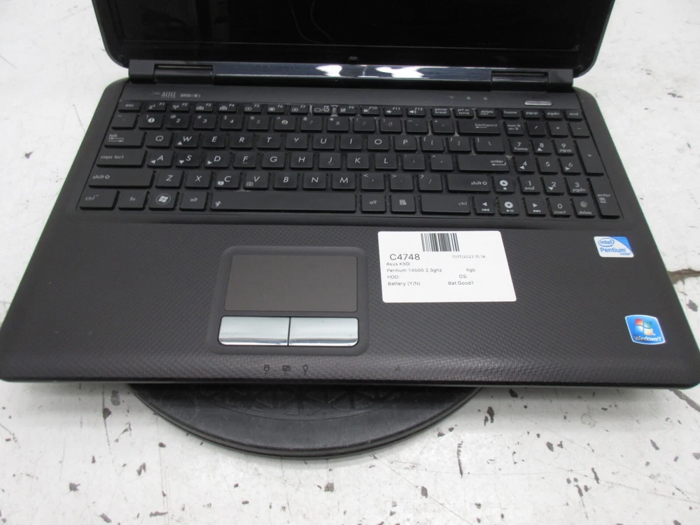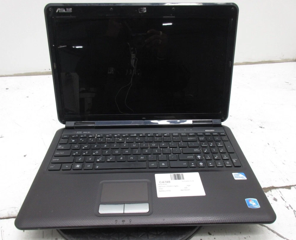 Asus K50I Laptop Intel Pentium Dual Core 4GB Ram No HDD or Battery Physical Grade: C Functional Grade: A This has been tested to boot to BIOS and it is in good working order. There are some marks and wear on the casing from general use. See pictures for further details. The hard drive is NOT included. Shipping Disclaimer: We do our best to ensure that our items arrive safely. Sometimes, however, they do sustain shipping damage. In the unlikely event that this happens to your item, please contact us immediately, and we will resolve the situation for you. Specifications: Processor: Intel Pentium T4500 2.3GHz Memory: 4GB Hard Drive: Not Included Optical Drive: See Photos Battery: None Operating System: Not Included Power Cable: Not Included Other Accessories: Not Included Terms of Sale: Please email any questions prior to bidding. Please allow up to one business day for a reply. We do not ensure compatibility with various accessories, software, or other hardware. Please do your own research before purchasing. Our business hours are Monday-Friday 8:00AM-4:00PM CST. Note that sales tax may be applicable depending on buyer location. Be sure to check your shipping address. We are not responsible for items shipped to an old, incorrect, or invalid shipping address. Local pickup is only an option for our freight listings. We are otherwise not open to the public.