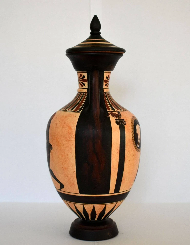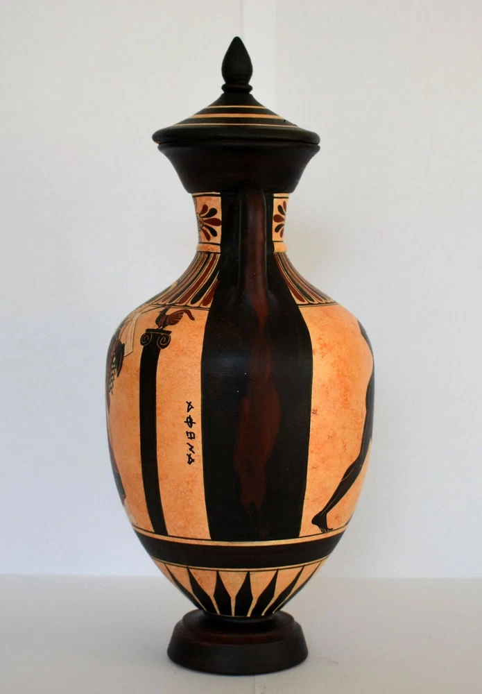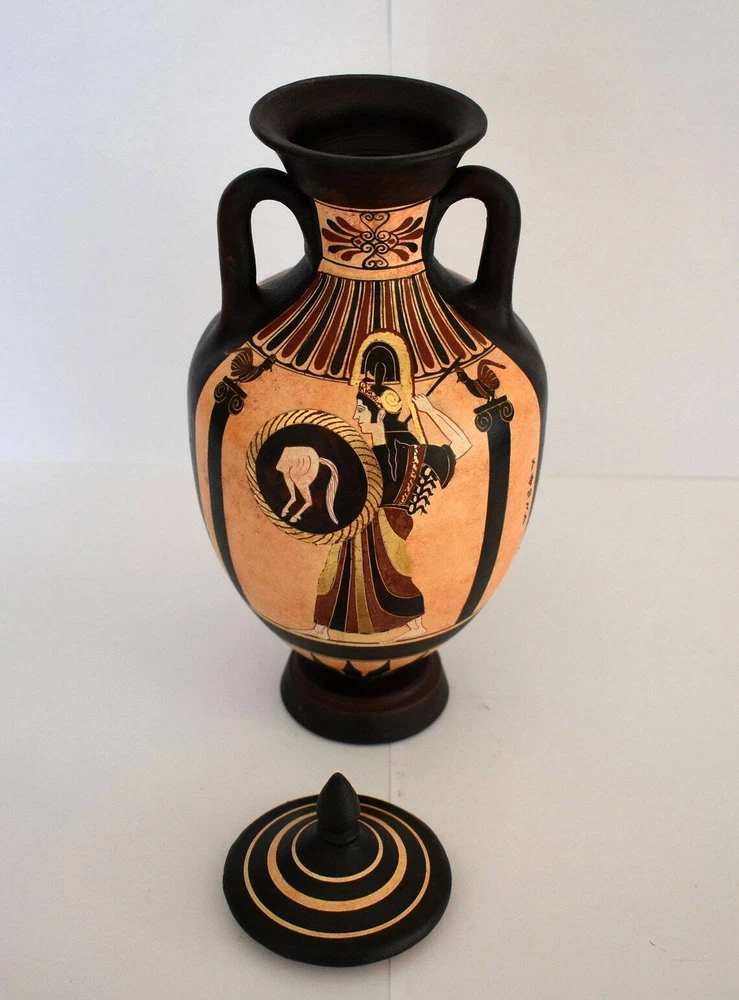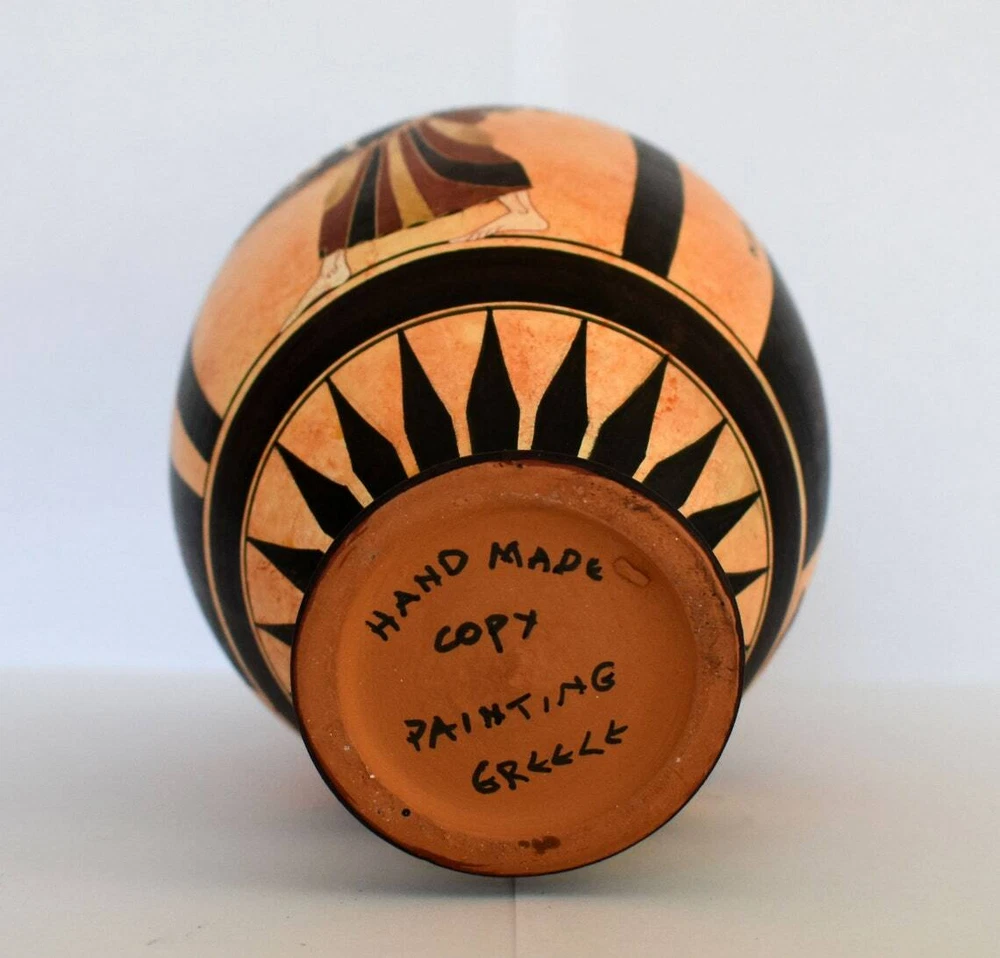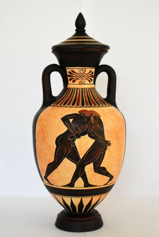 Athena - Goddess of Wisdom, Strength, Strategy - Pankration Athletes - Ancient Combat Sport - Ceramic Vase Condition: New, Handmade in Greece. Material: Clay Height Size: 26 cm - 10,2 inches Width: 11 cm - 4,3 inches Weight: 770 g Athena, also referred to as Athene, is a very important goddess of many things. She is goddess of wisdom, courage, inspiration, civilization, law and justice, strategic warfare, mathematics, strength, strategy, the arts, crafts, and skill. She is known most specifically for her strategic skill in warfare and is often portrayed as companion of heroes and is the patron goddess of heroic endeavour. Athena was born from Zeus after he experienced an enormous headache and she sprang fully grown and in armour from his forehead. Pankration, which literary means ‘all force’ was one of the most popular combat sports in ancient Greece. It combined two other popular sports of antiquity, wrestling and boxing, but kicking was allowed as well. It was a dangerous sport, in which everything was permitted except biting, gouging (stabbing with your finger in your opponent’s eye, nose or mouth) and attacking the genitals. The participants were called pankratiasts. Pankration was first introduced at the thirty-third Olympics in 648 BC. It impressed the crowds immediately because it was more diverse and exciting than any other combat sport they had seen. ΓΙΩ ΒΑΖΟ 24 ΕΚ Νο4 ΑΘΗΝΑ ΠΑΓΚΡΑΤΙΣΤΕΣ - 28 *********************
