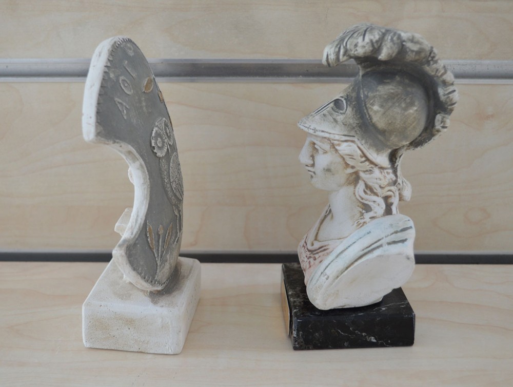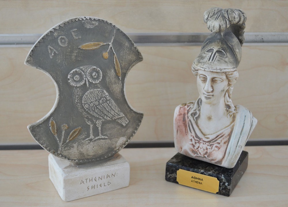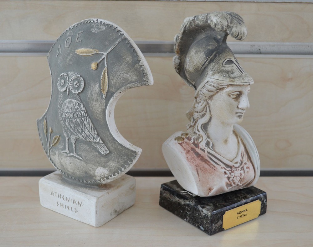 Goddess Athena In Greek religion and mythology, Athena or Athene, also referred to as Pallas Athena/Athene, is the goddess of: wisdom, courage, inspiration, civilization, law and justice, just warfare, mathematics, strength, strategy, the arts, crafts, and skill. (B124-1) Protector of the city athens! Details:Goddess Athena Condition: New, made in Greece. Height: 16cm - 6.3 inches Width: 6cm - 2.3 inches Weight: 480g Material: Casting stone Athenian shield owl sculpture In Greek religion and mythology, Owl is a great symbol of knowledge, wisdom, perspicacity and erudition. Details: Condition: New, made in Greece. Approximately Height: 14.5cm - 5.7 inches Width: 11cm - 4.3 inches Weight: 250gr Material: Casting stone