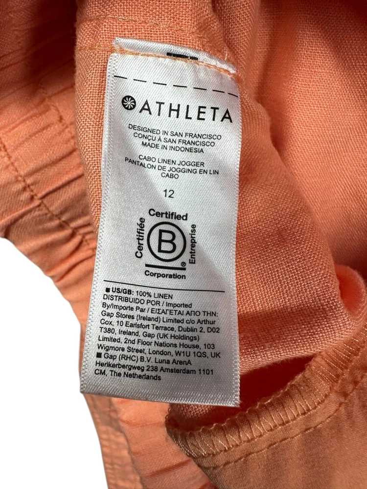 Athleta Cabo 100% Linen Joggers Womens Size 12 Orange Athleisure Casual Travel Great Preowned Condition Please refer to photos for size measurements / reach out with any questions or if you are wanting additional photos!